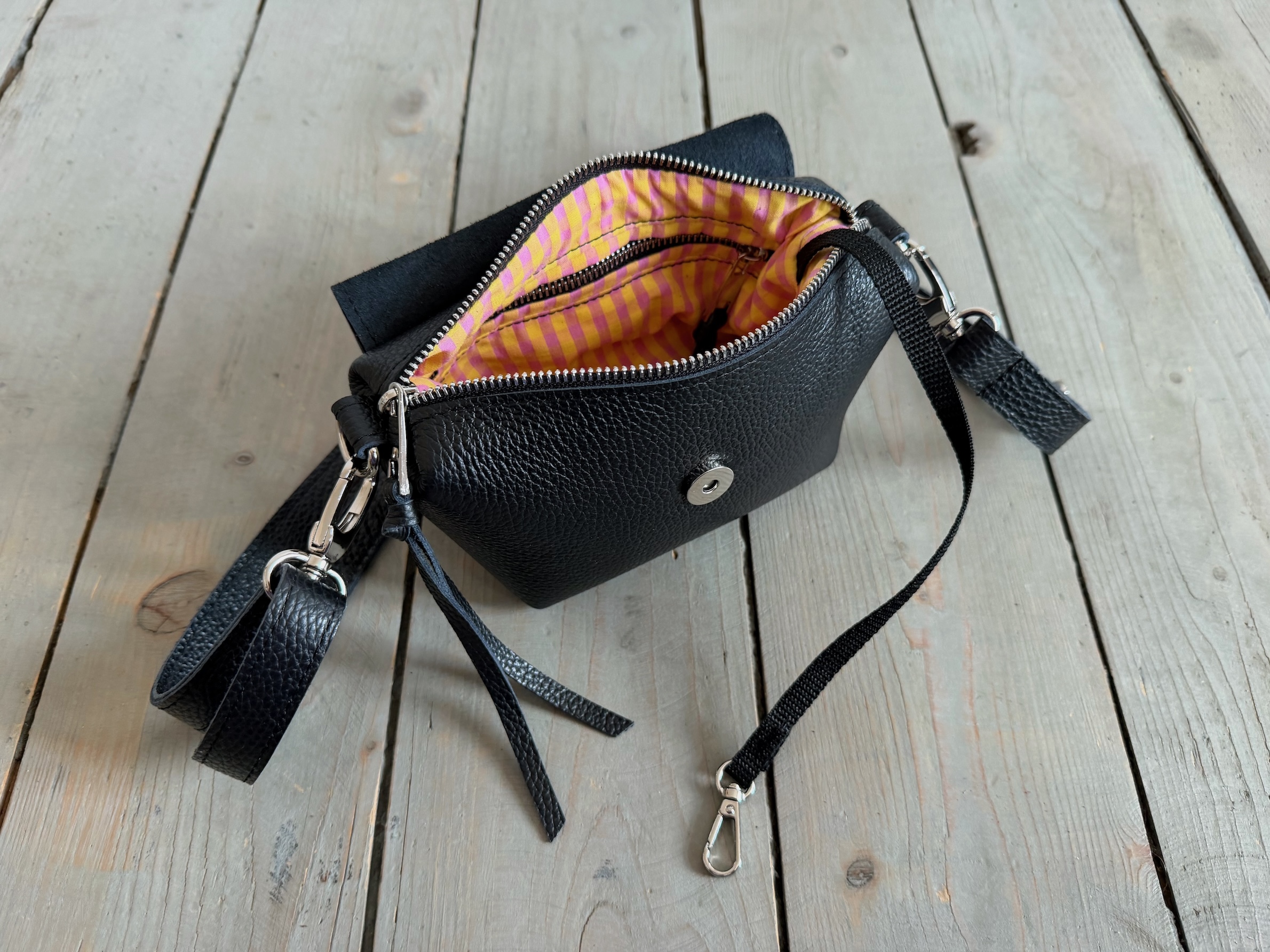 Uszyta ze skóry naturalnej licowej + welurowej + bawełnianej podszewki.