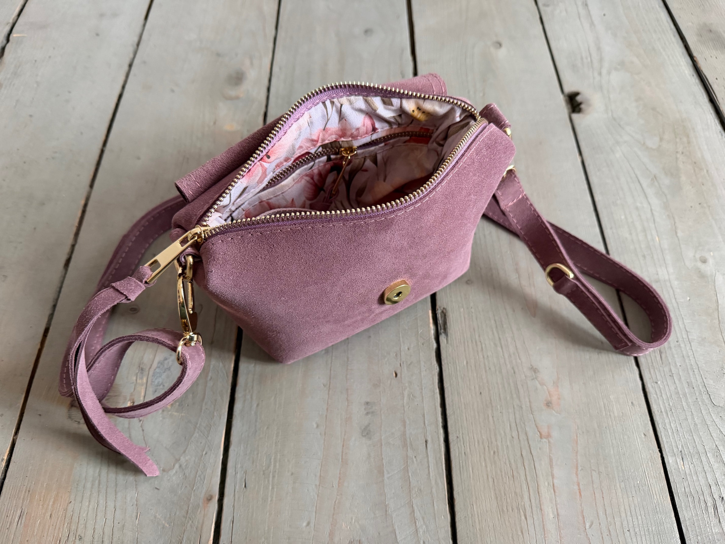 Uszyta ze skóry naturalnej welurowej + bawełnianej podszewki.