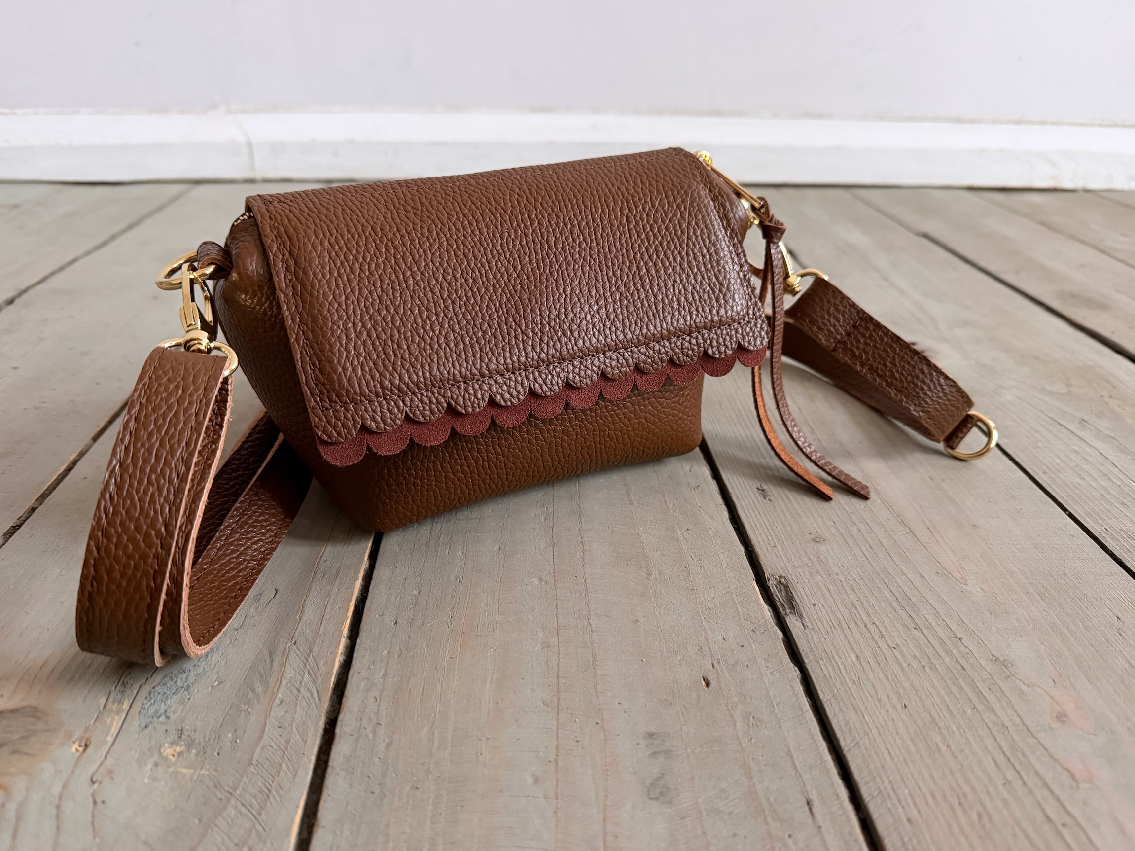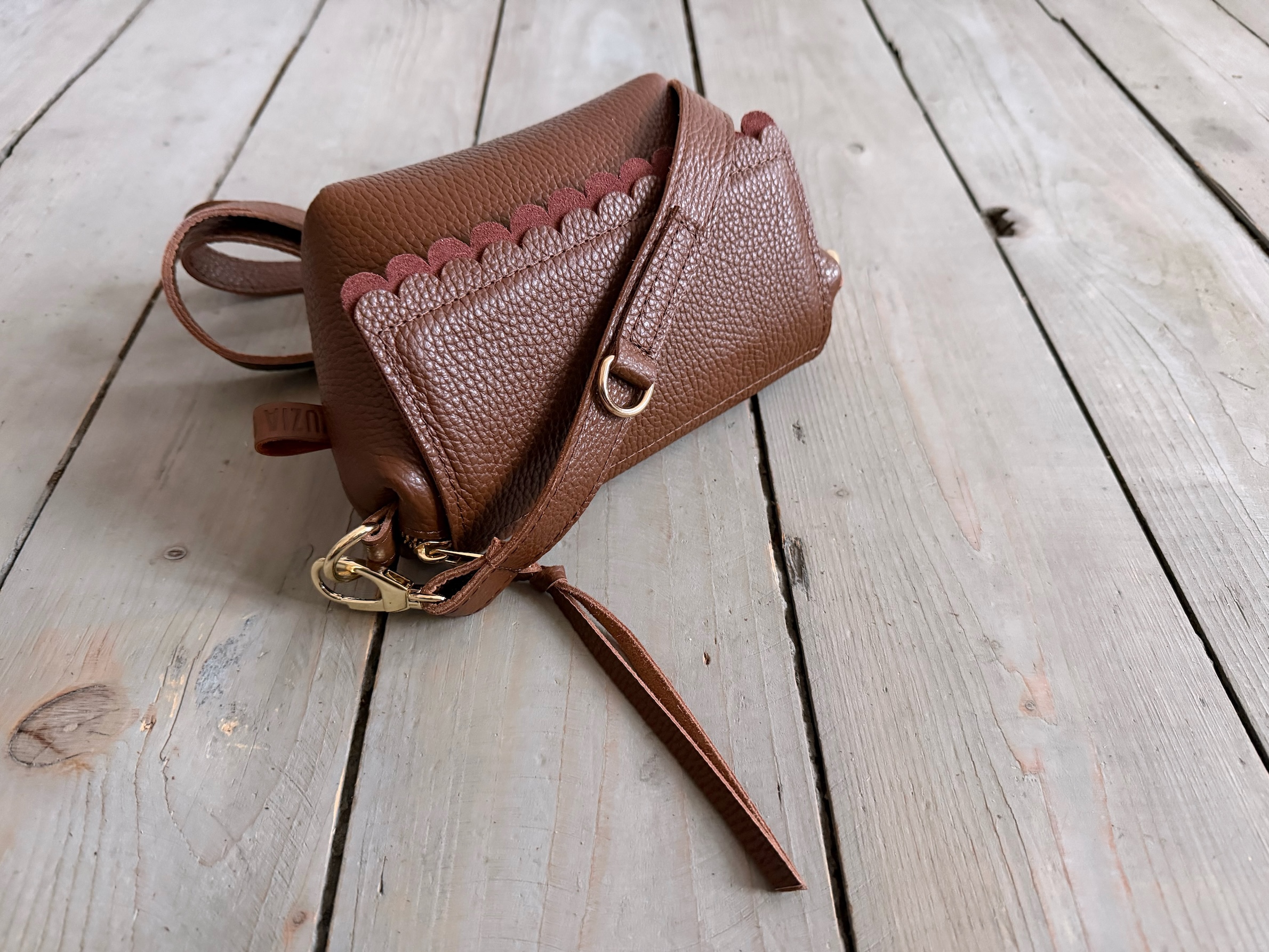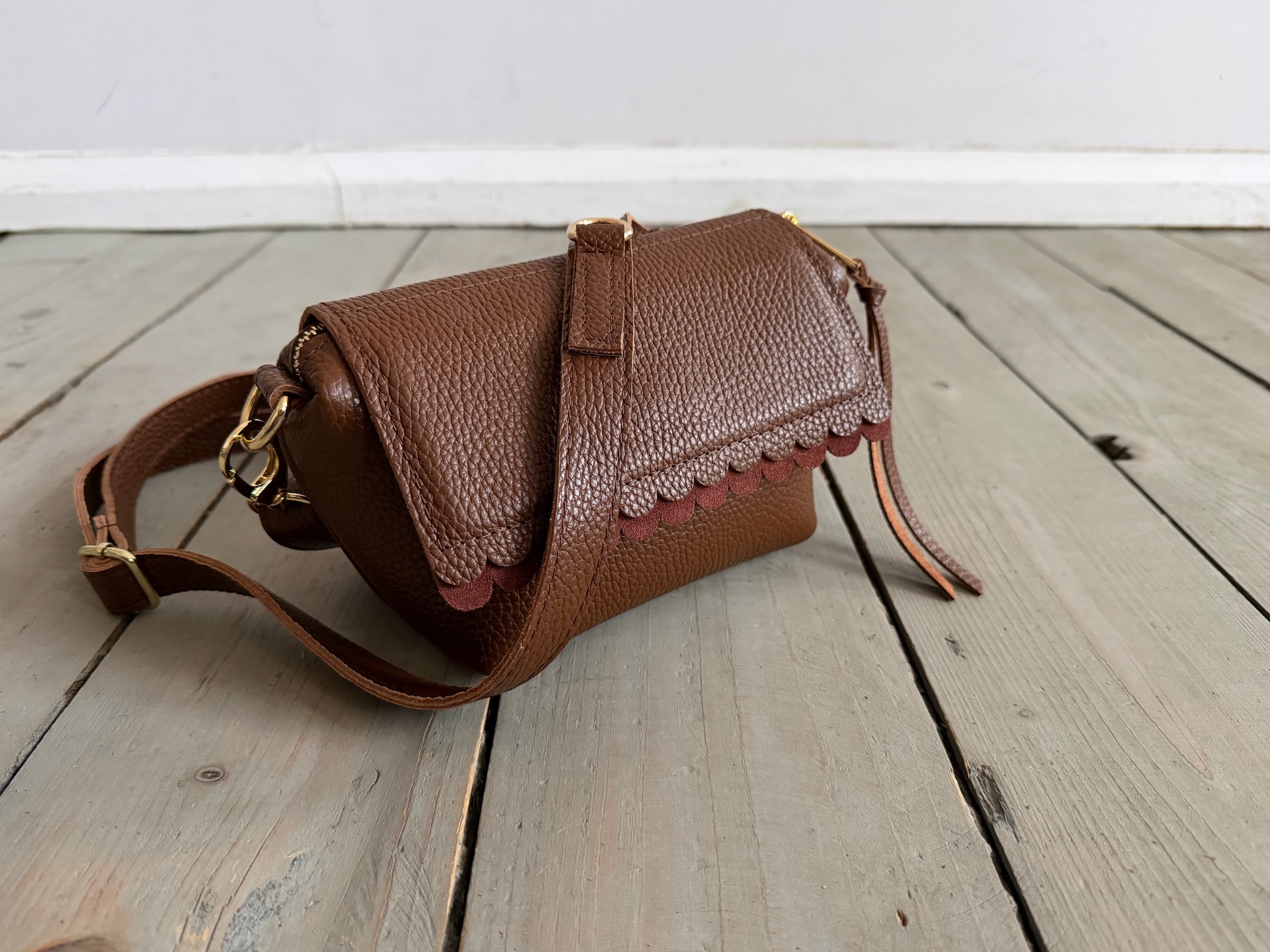 Uszyta ze skóry naturalnej licowej + bawełnianej podszewki.