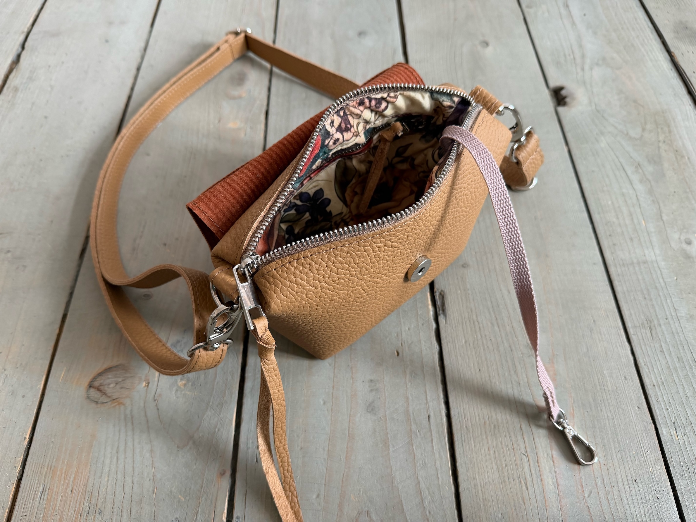 Uszyta ze skóry naturalnej licowej + welurowej + bawełnianej podszewki.