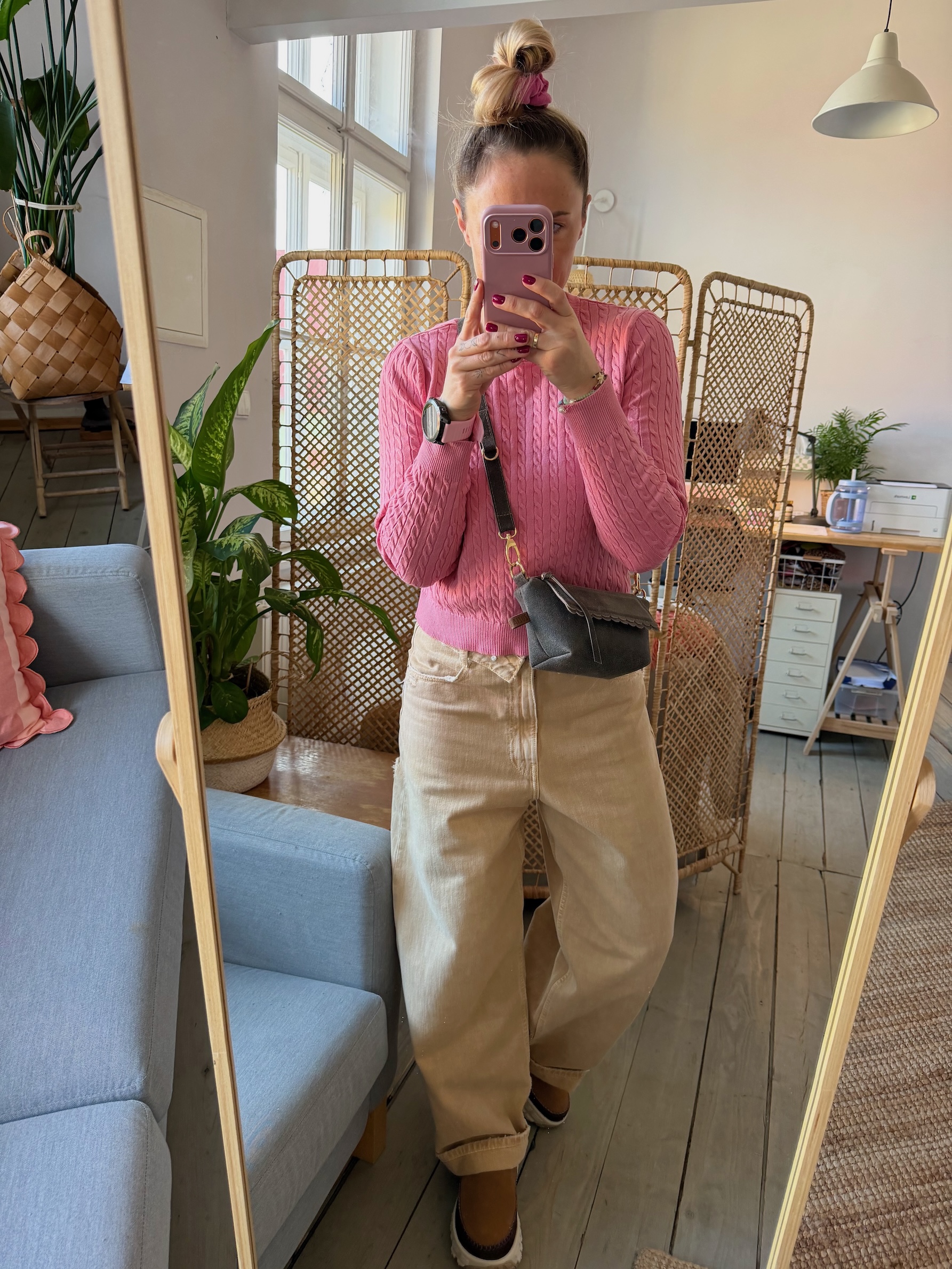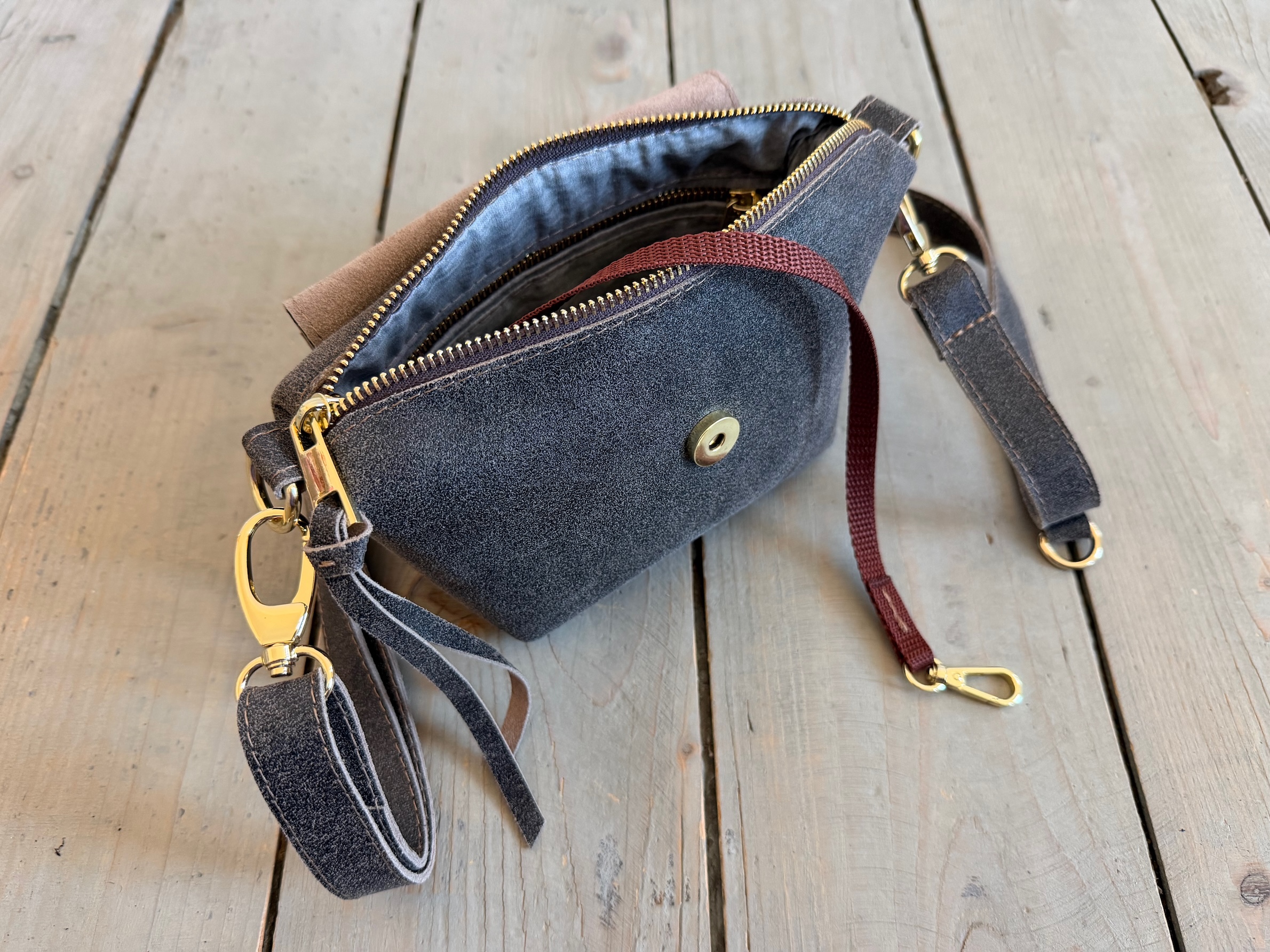 Uszyta ze skóry naturalnej welurowej + bawełnianej podszewki.