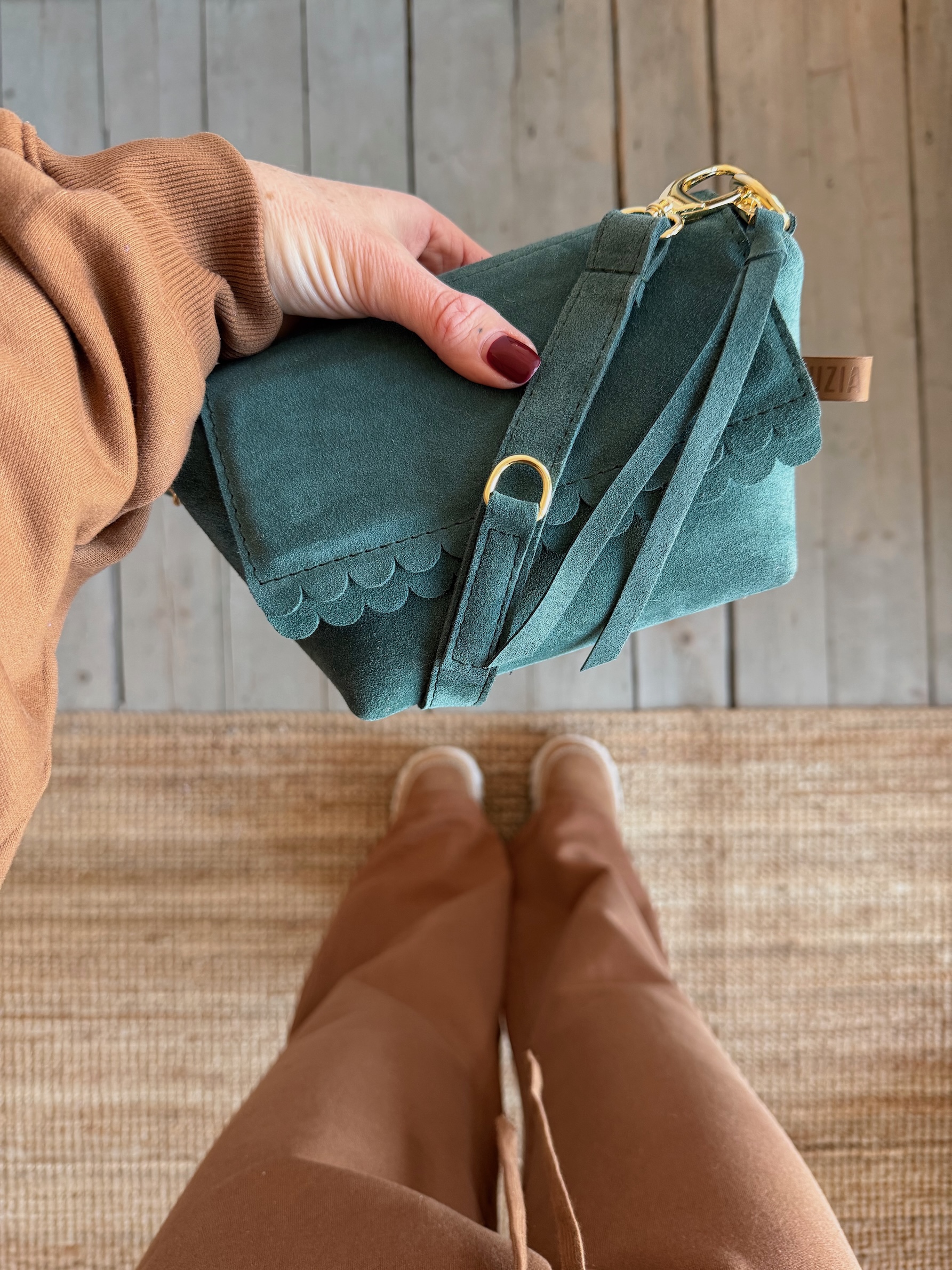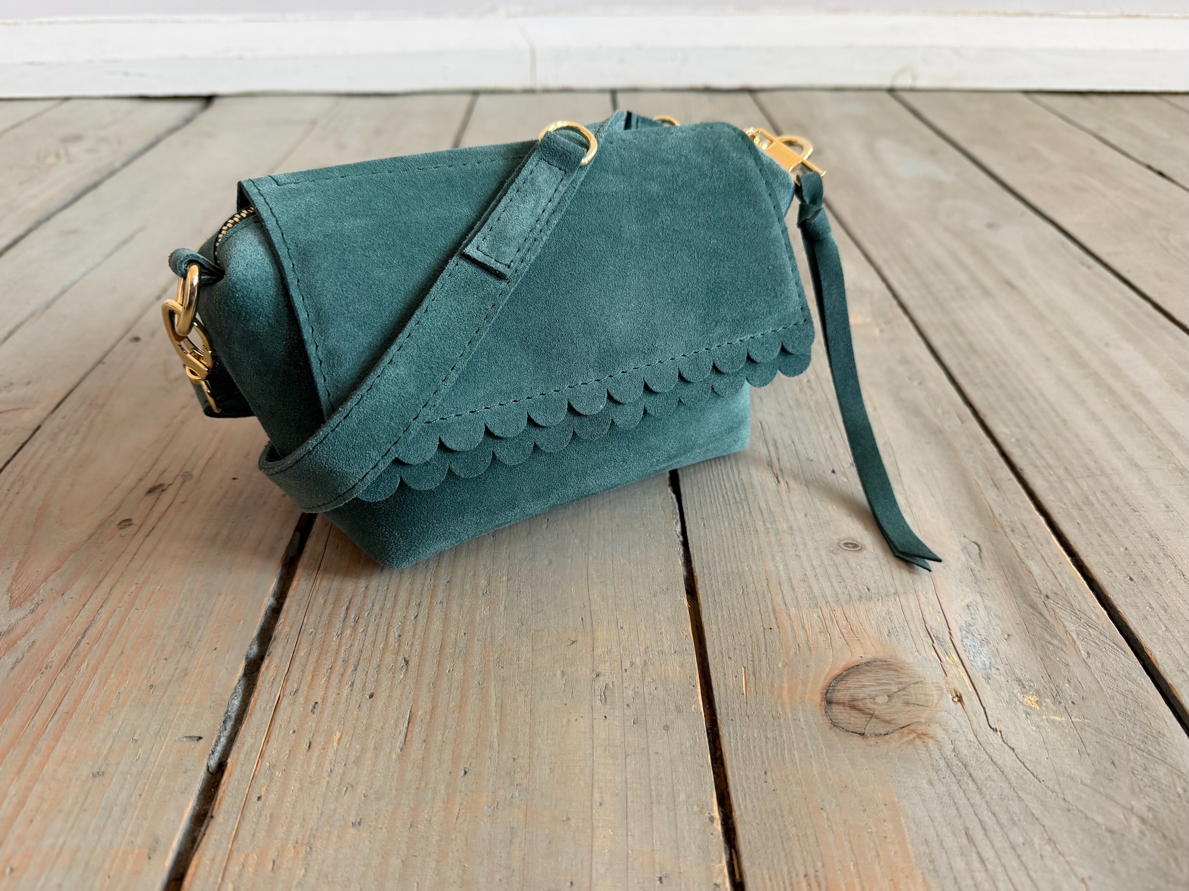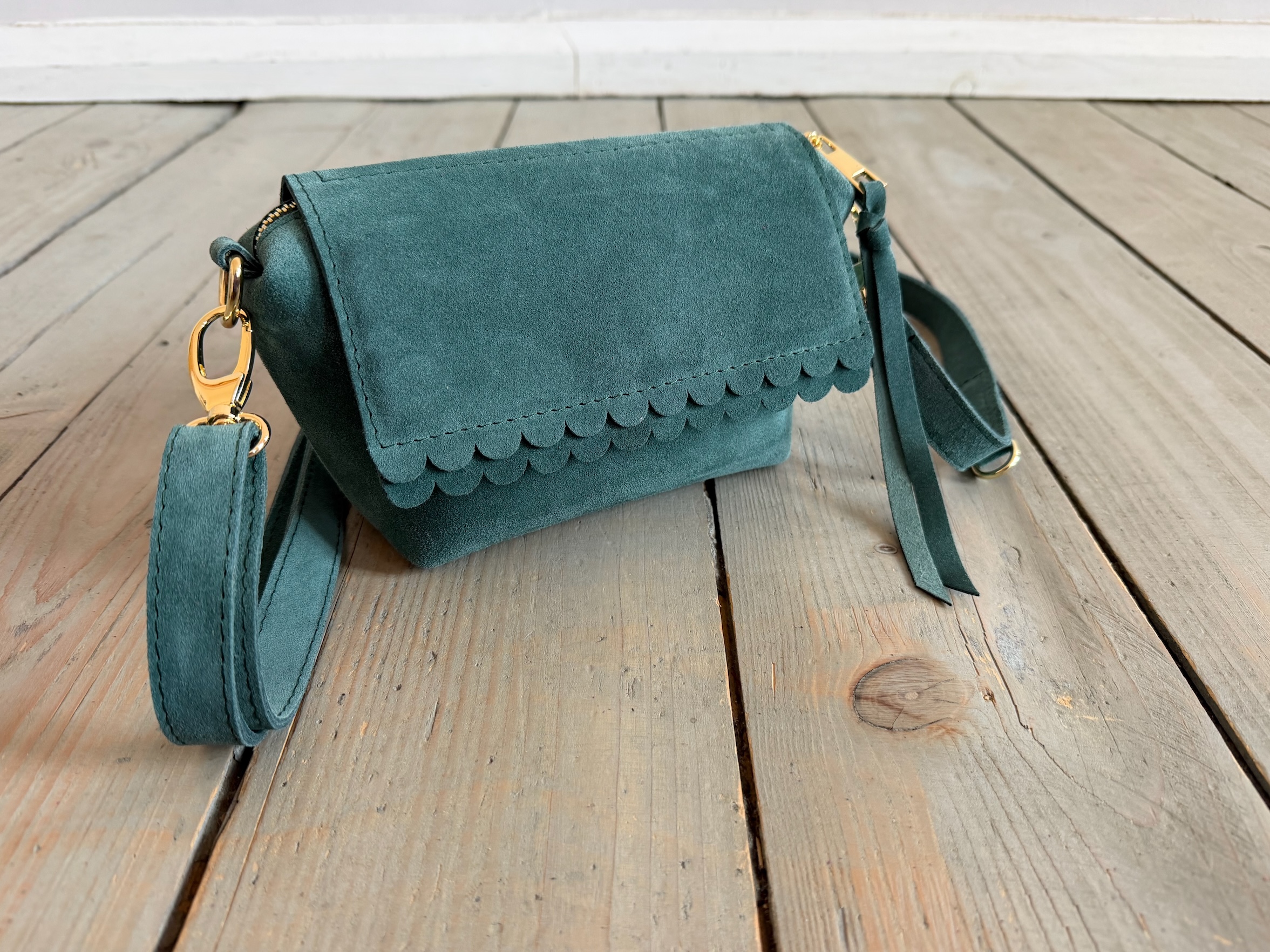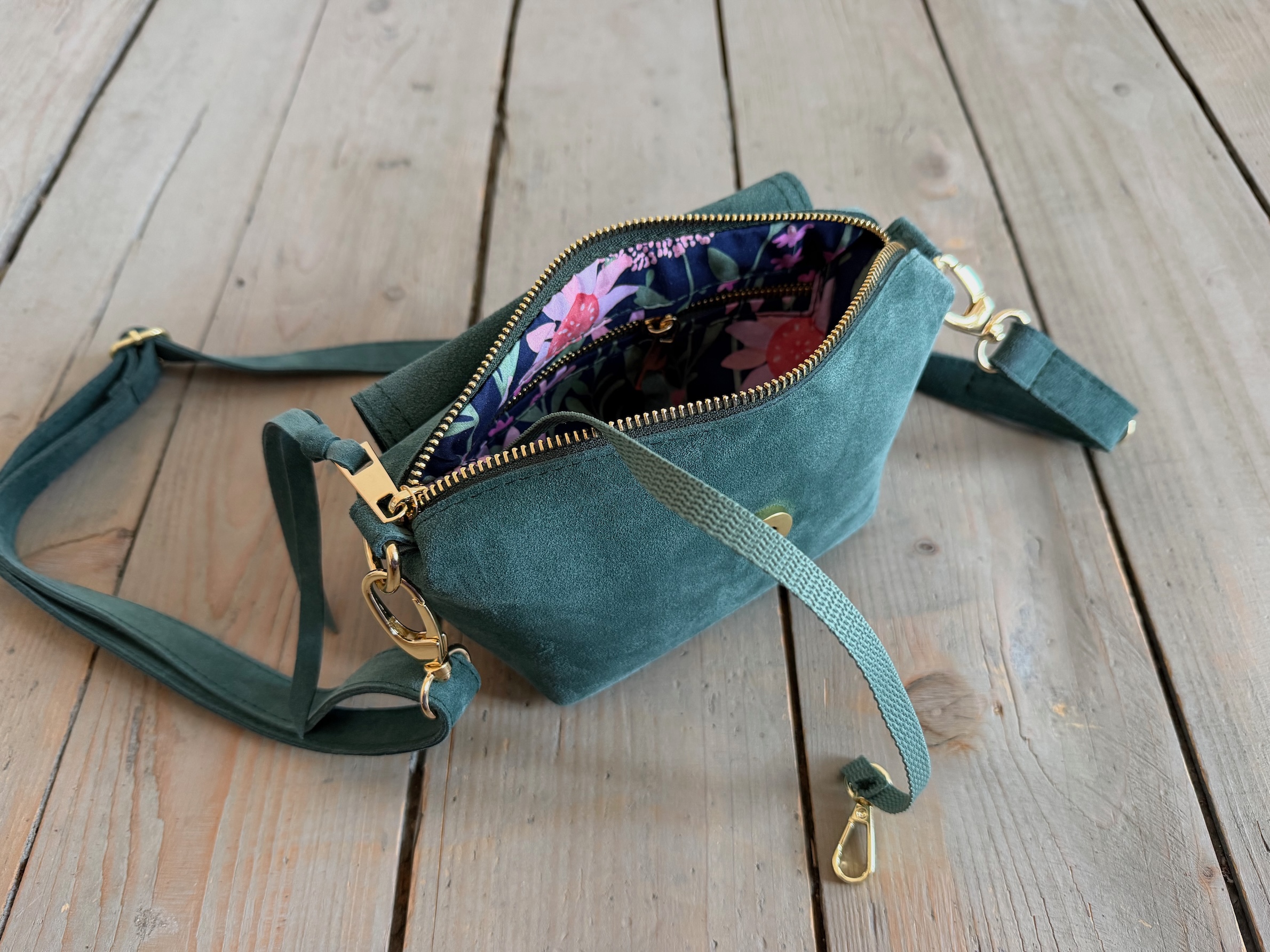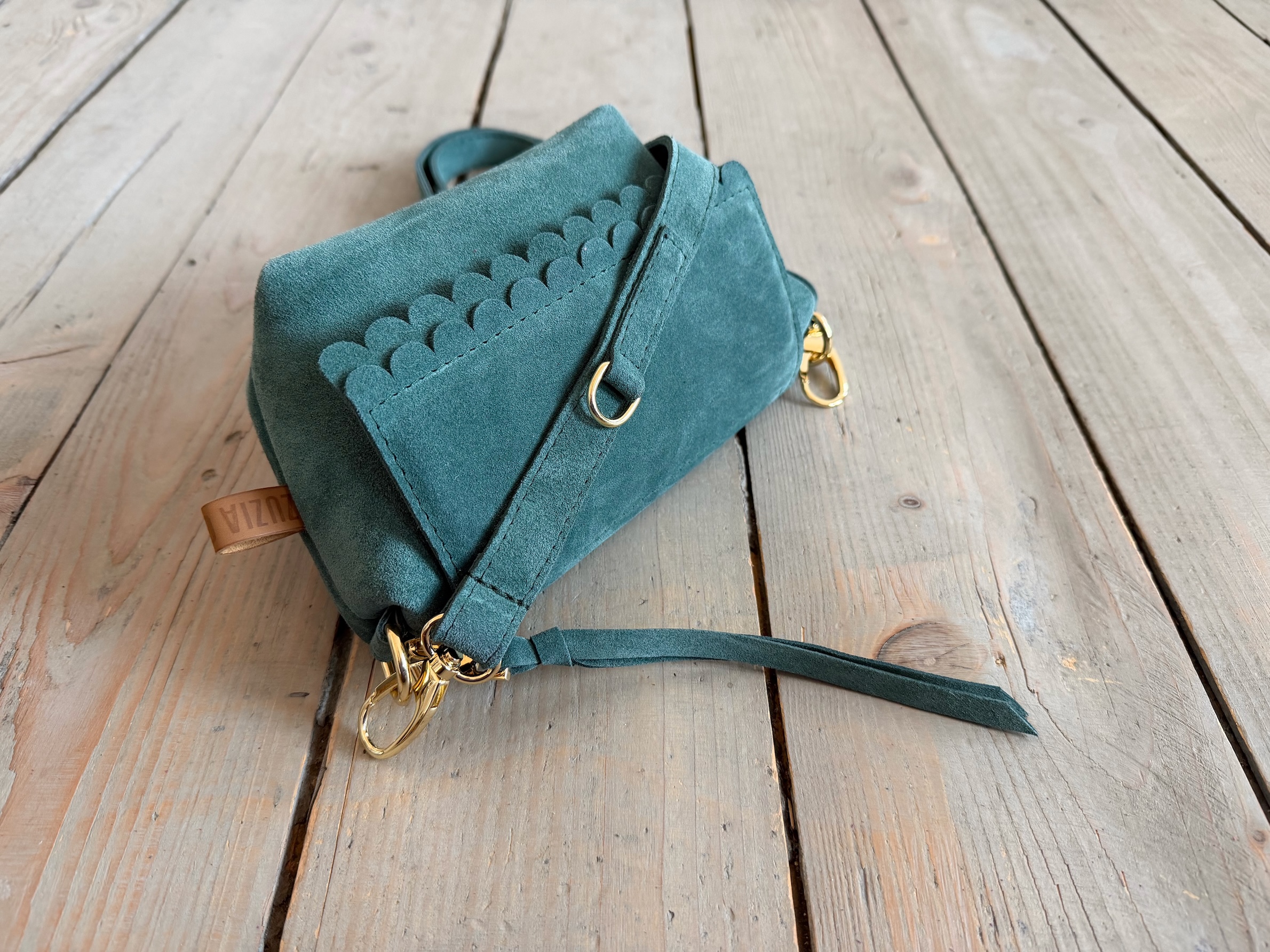 Uszyta ze skóry naturalnej welurowej + bawełnianej podszewki.