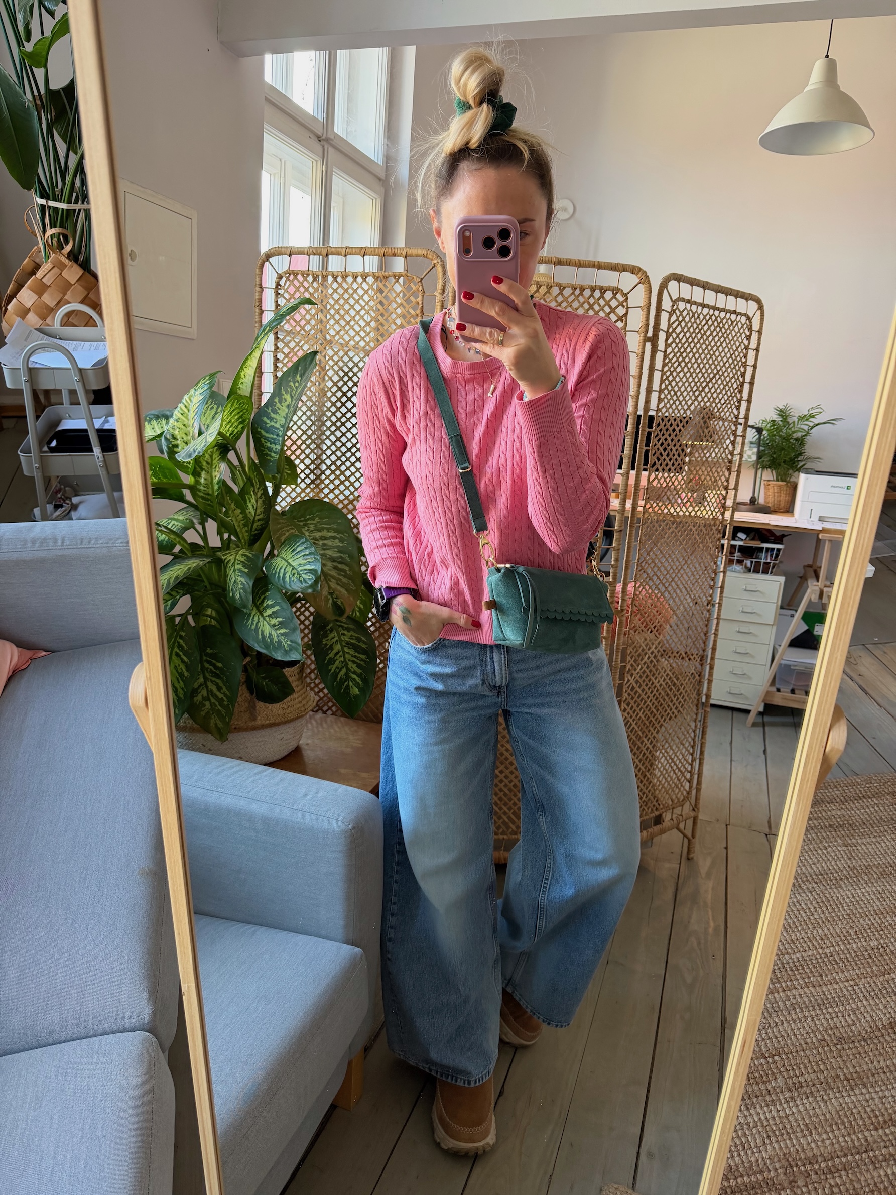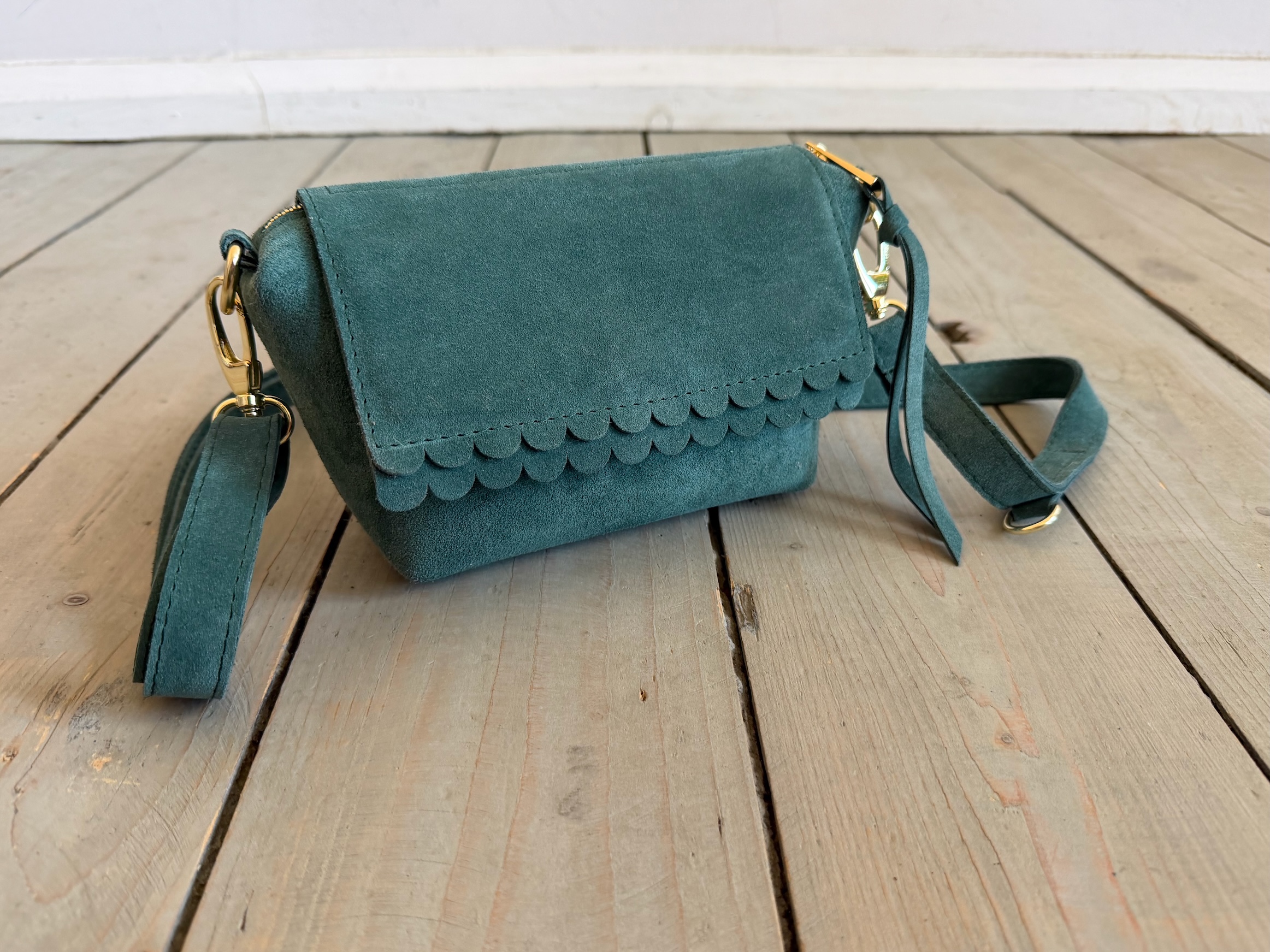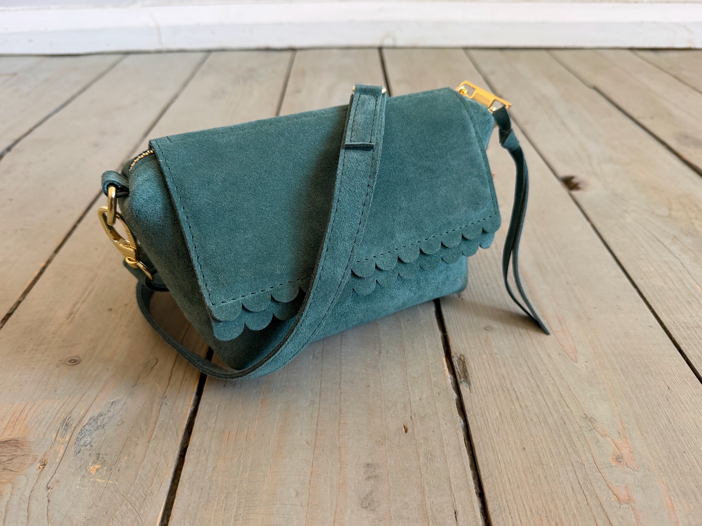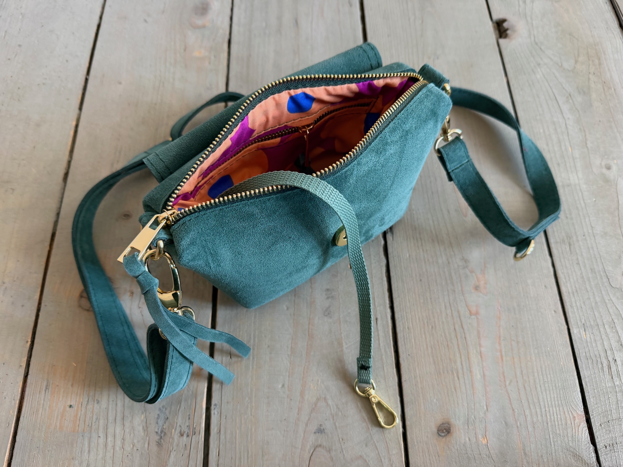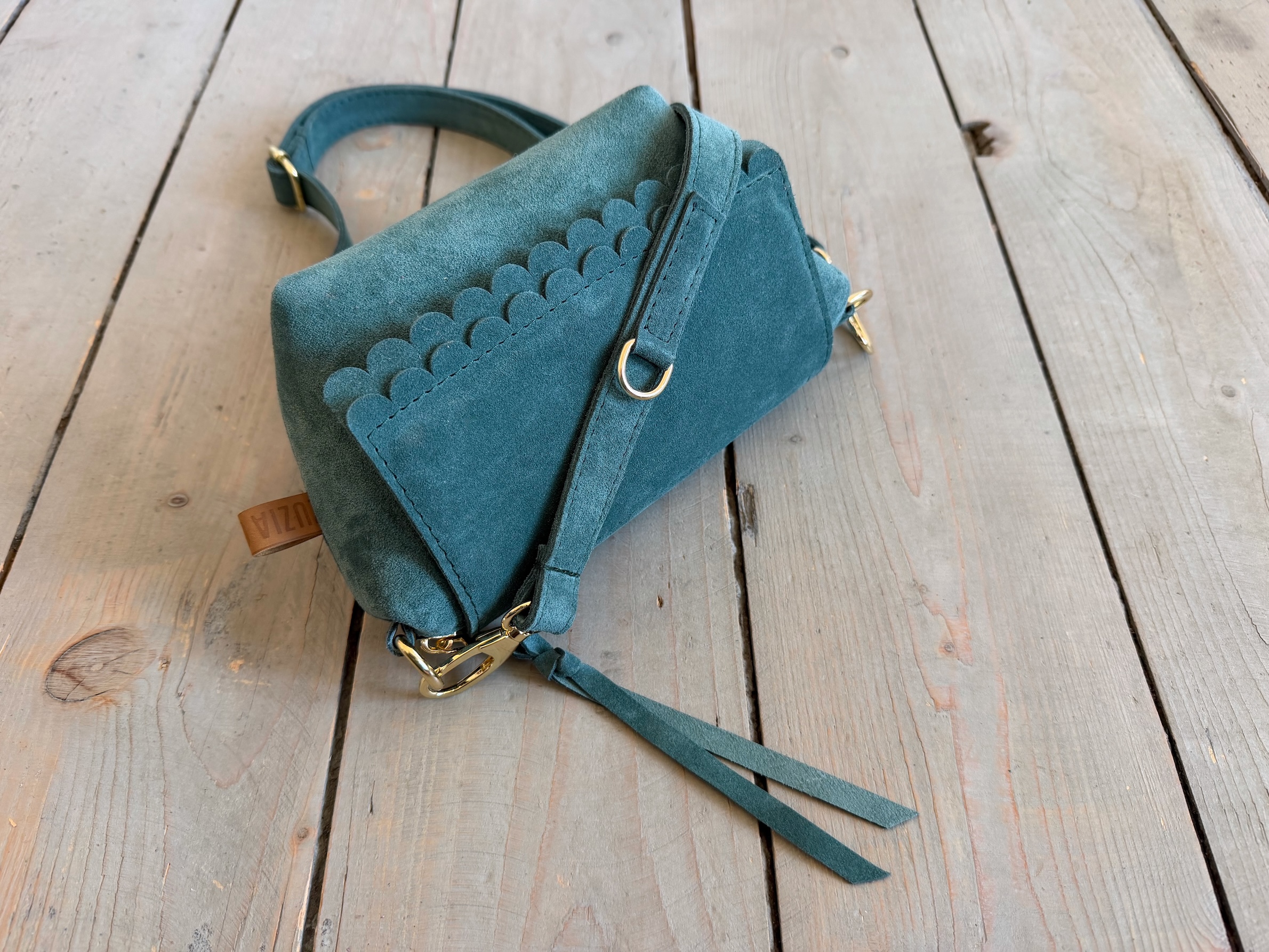Uszyta ze skóry naturalnej welurowej + bawełnianej podszewki.