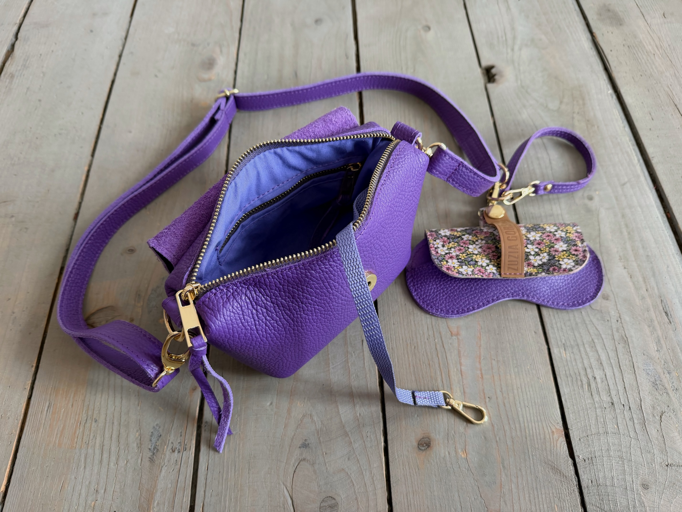Wewnątrz kieszonka na zamek oraz smyczka z karabińczykiem.