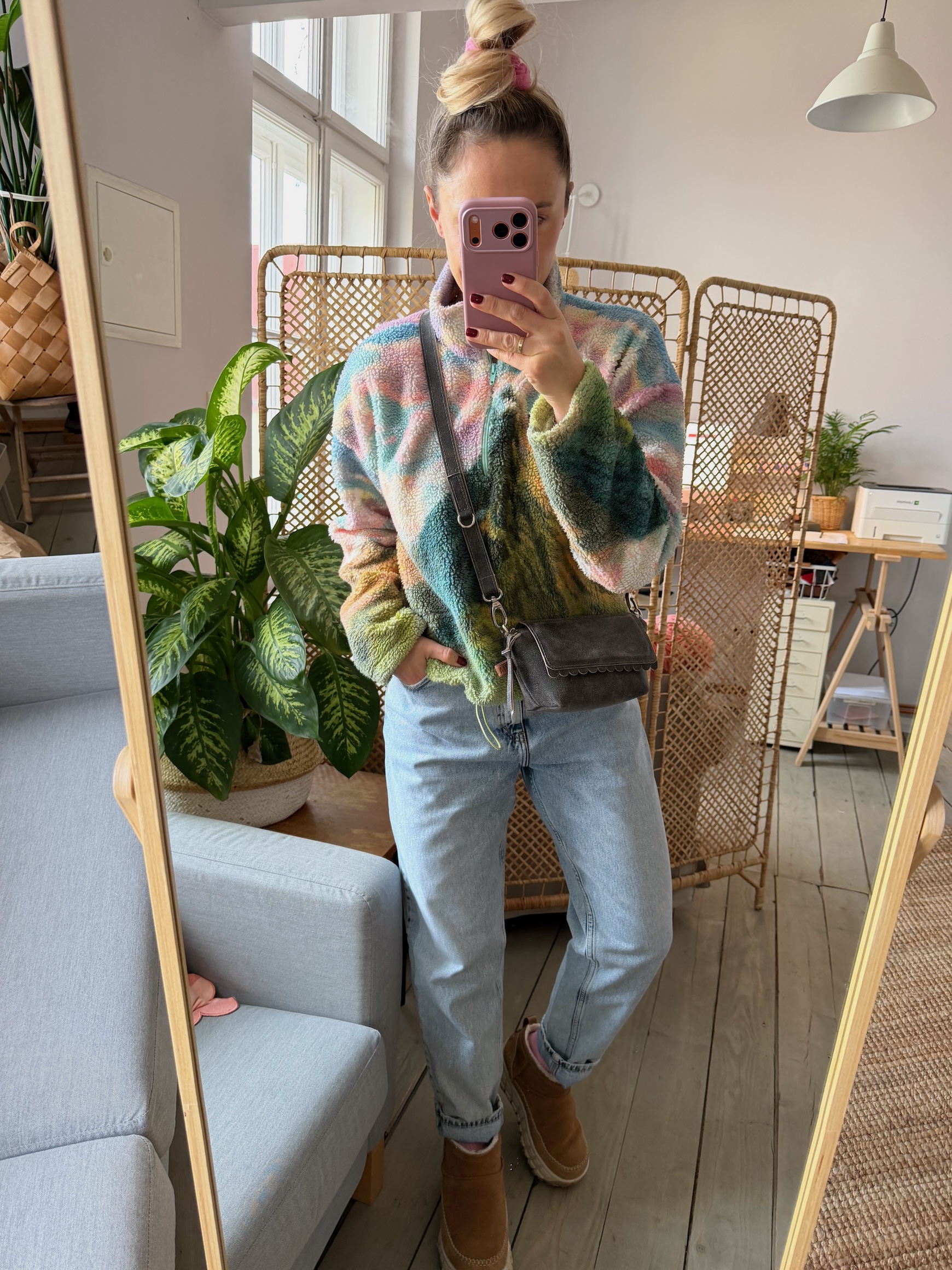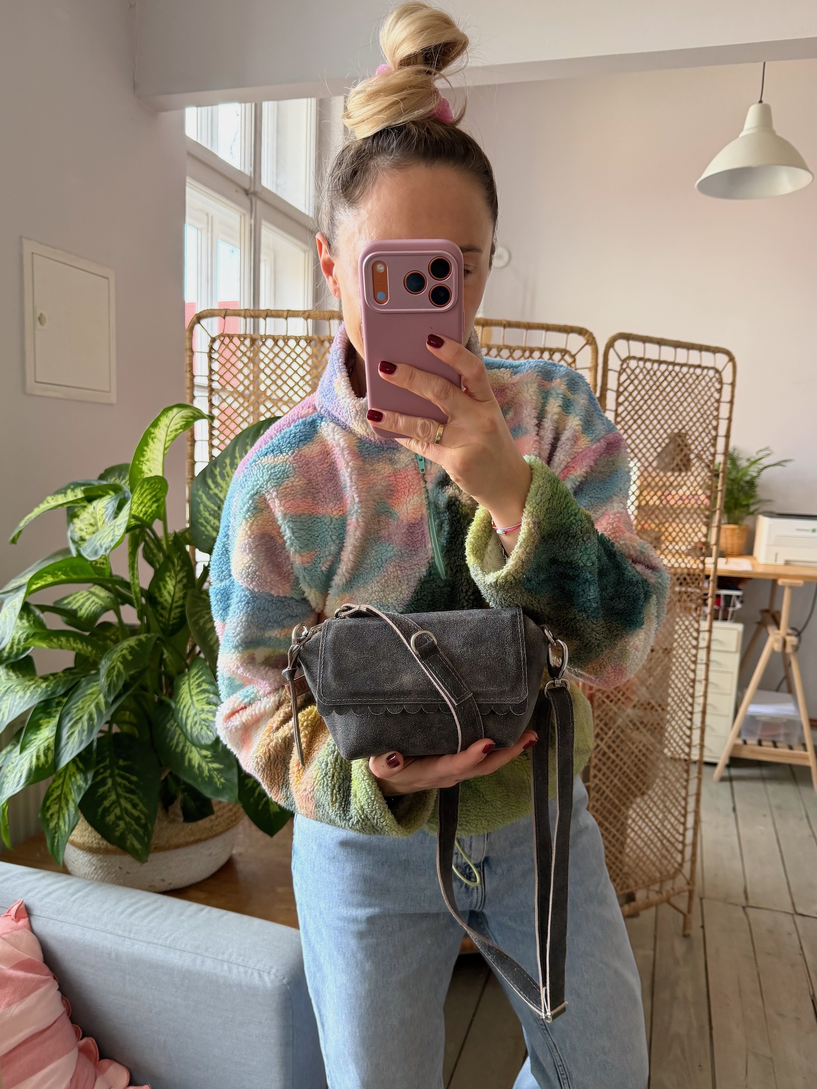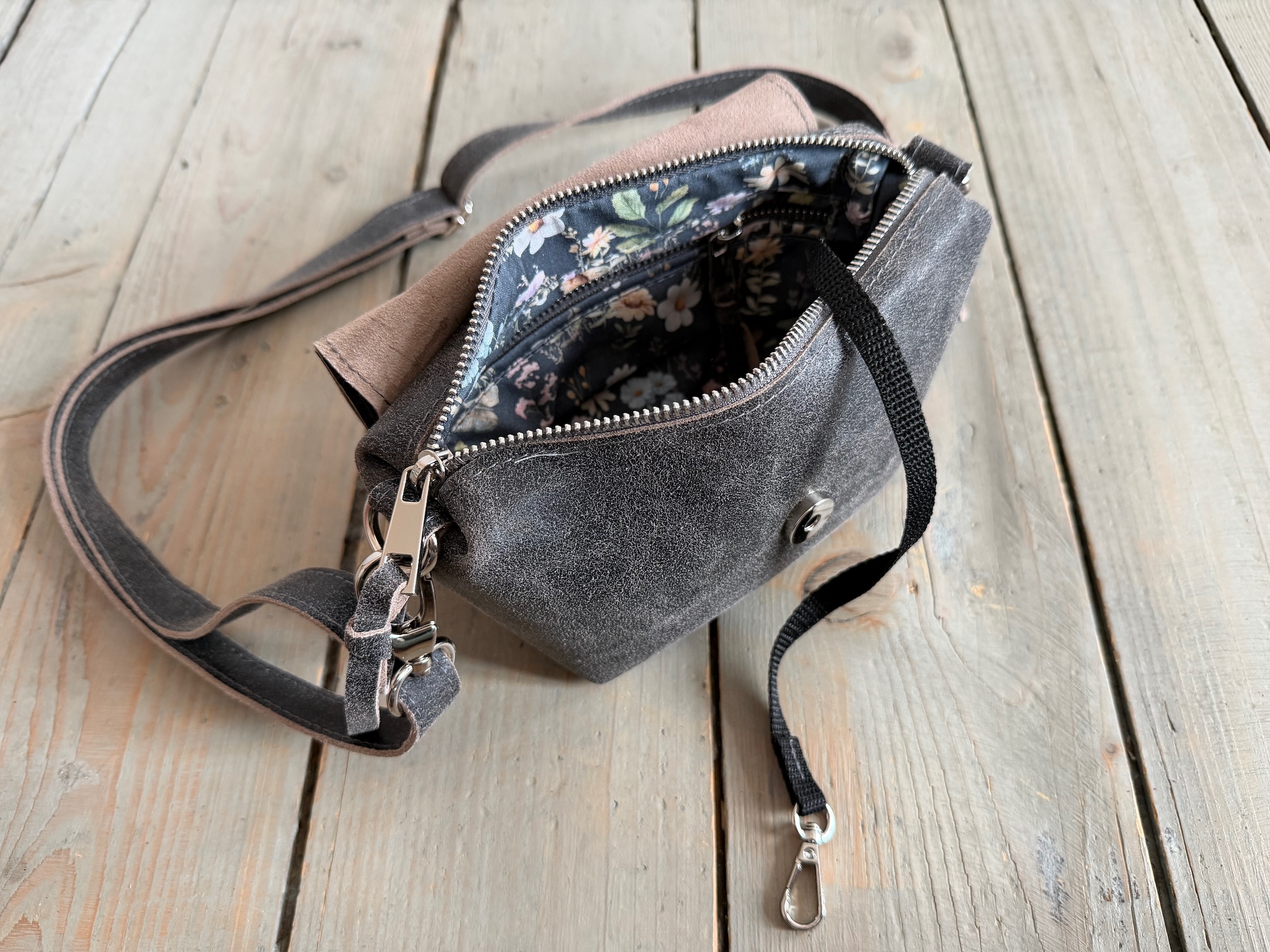 Uszyta ze skóry naturalnej welurowej + bawełnianej podszewki.