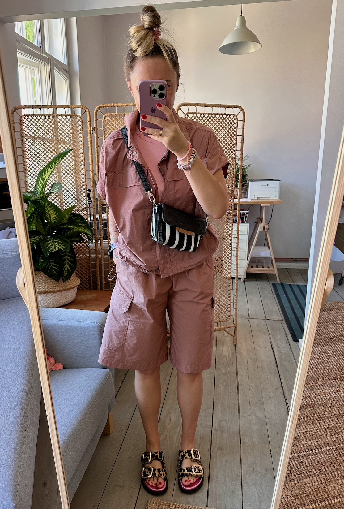 Uszyta z tkaniny dekoracyjnej bawełniano-poliestrowej + skóry naturalnej + bawełnianej podszewki.
