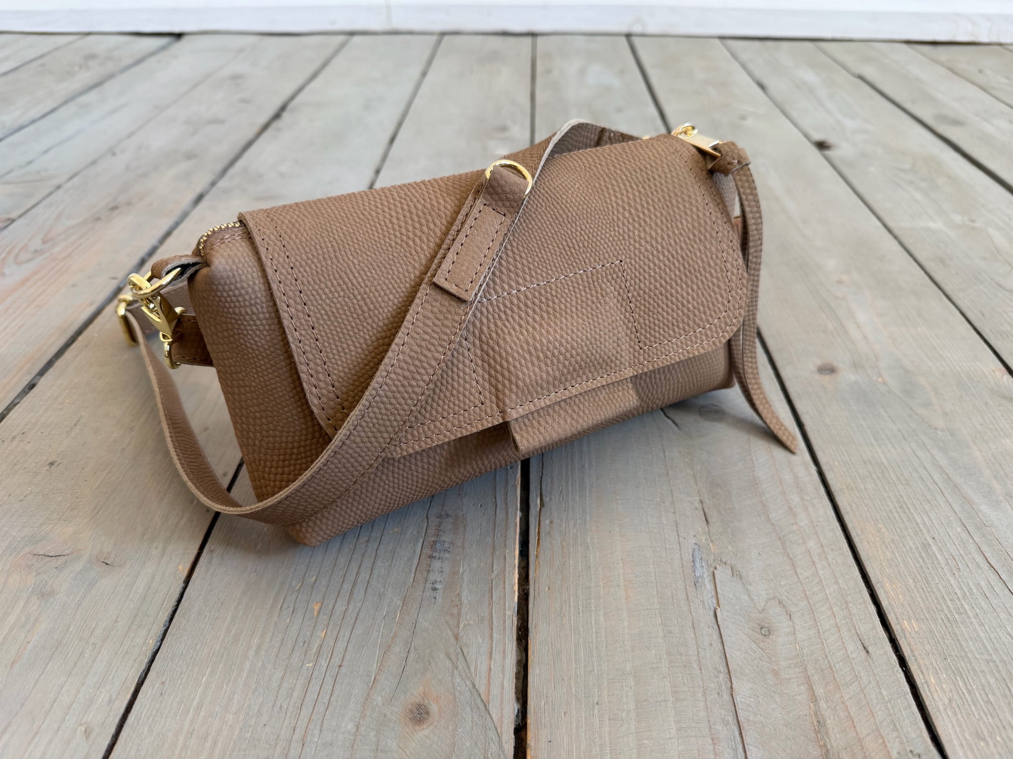 Uszyta ze skóry naturalnej garbowanej roślinnie.