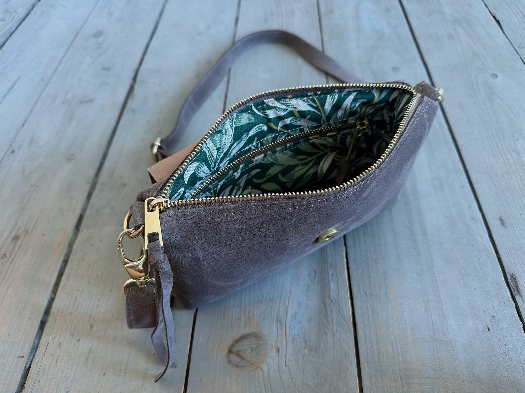 Uszyta ze skóry naturalnej licowej + welurowej.