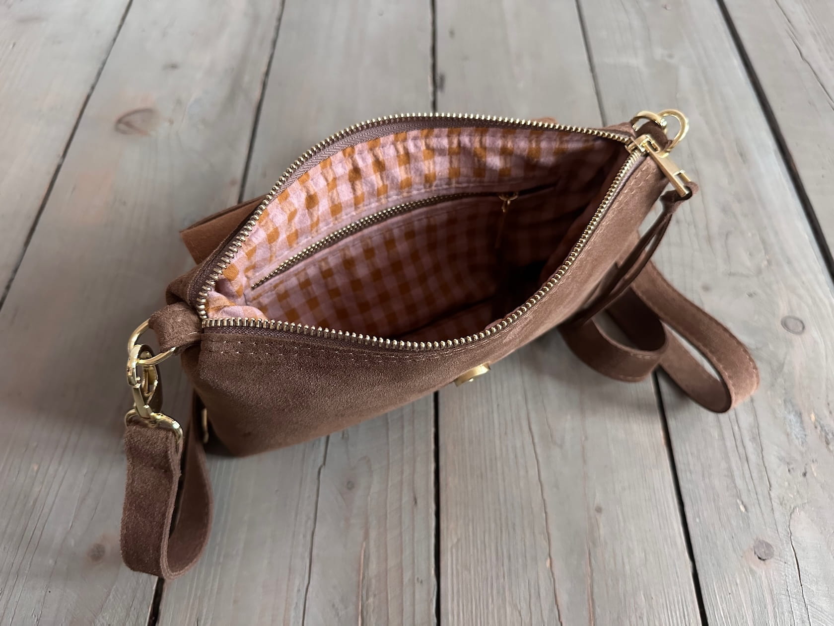 Uszyta ze skóry naturalnej welurowej.