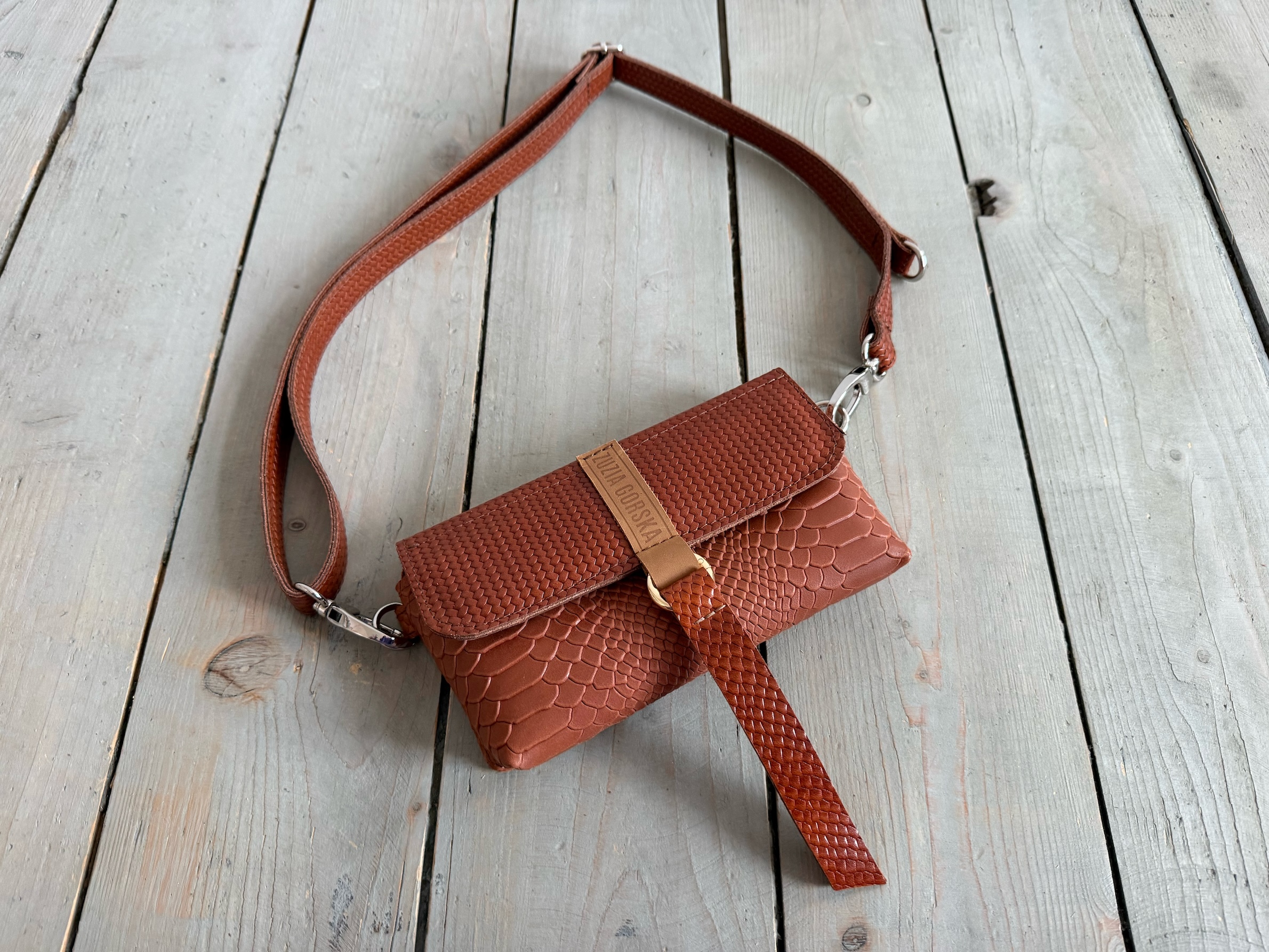 Uszyta ze skóry naturalnej licowej.