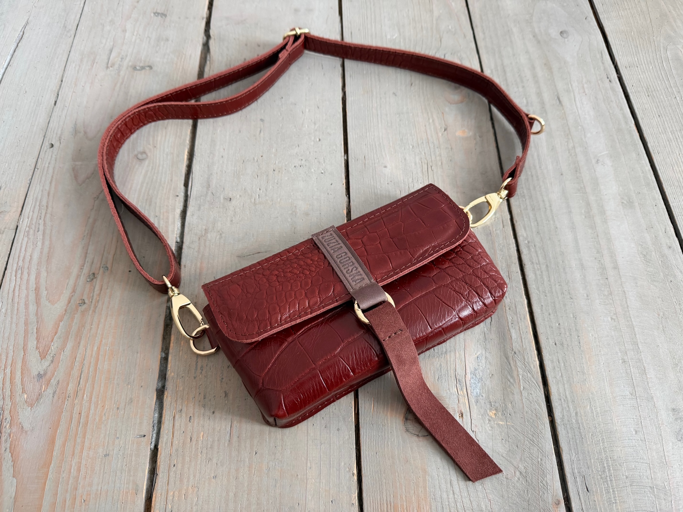 Uszyta ze skóry naturalnej licowej.