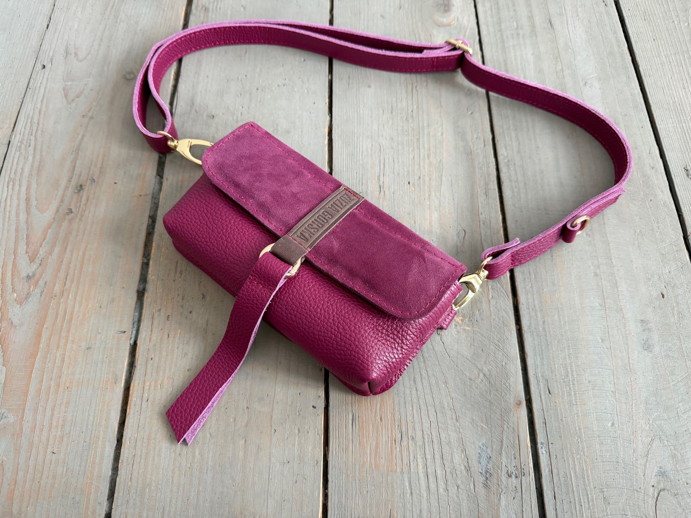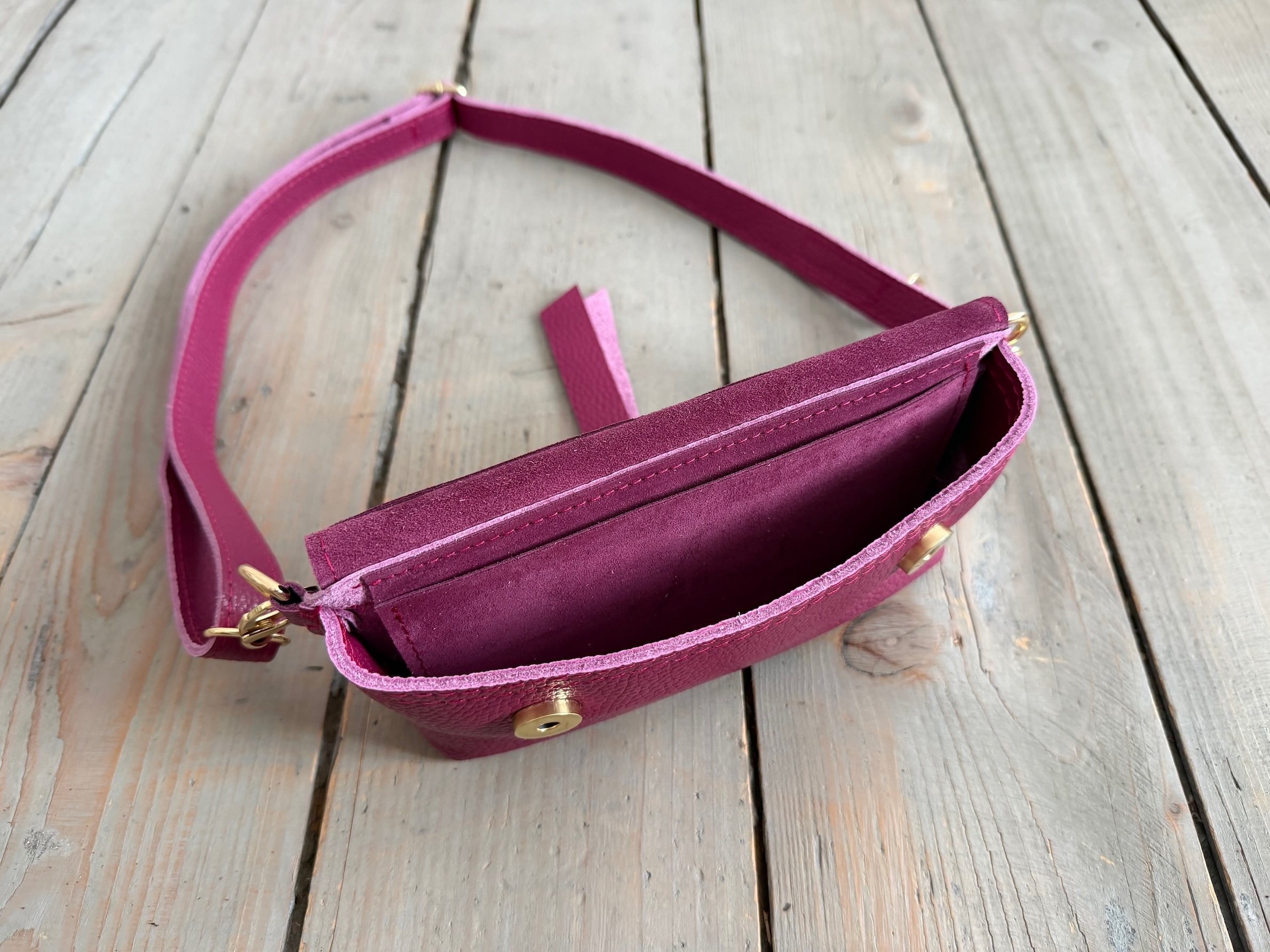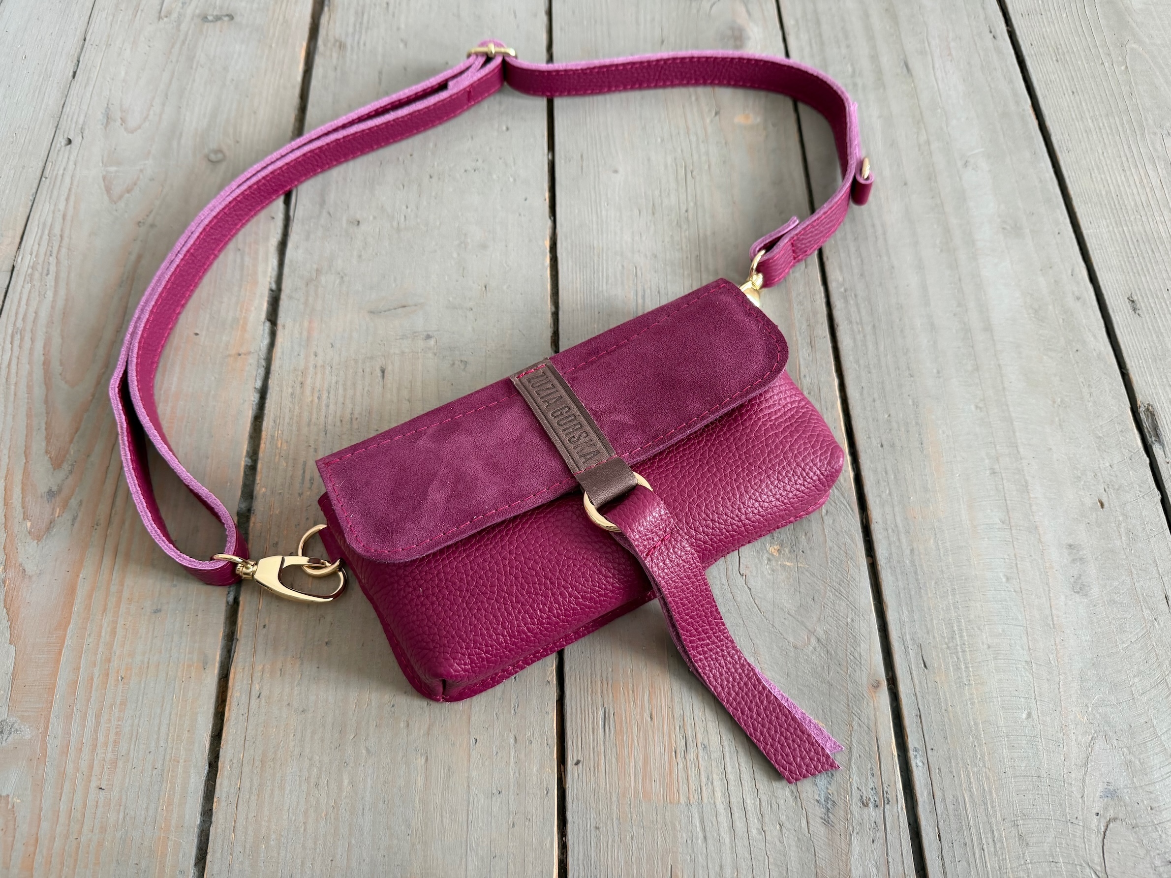 Uszyta ze skóry naturalnej licowej + welurowej.
