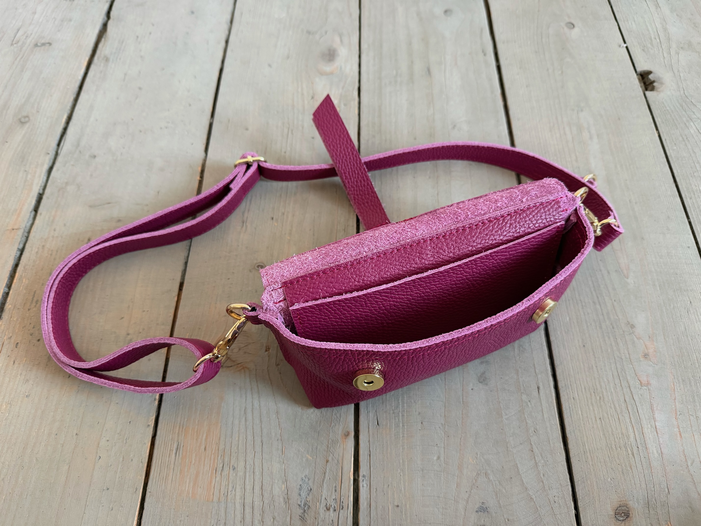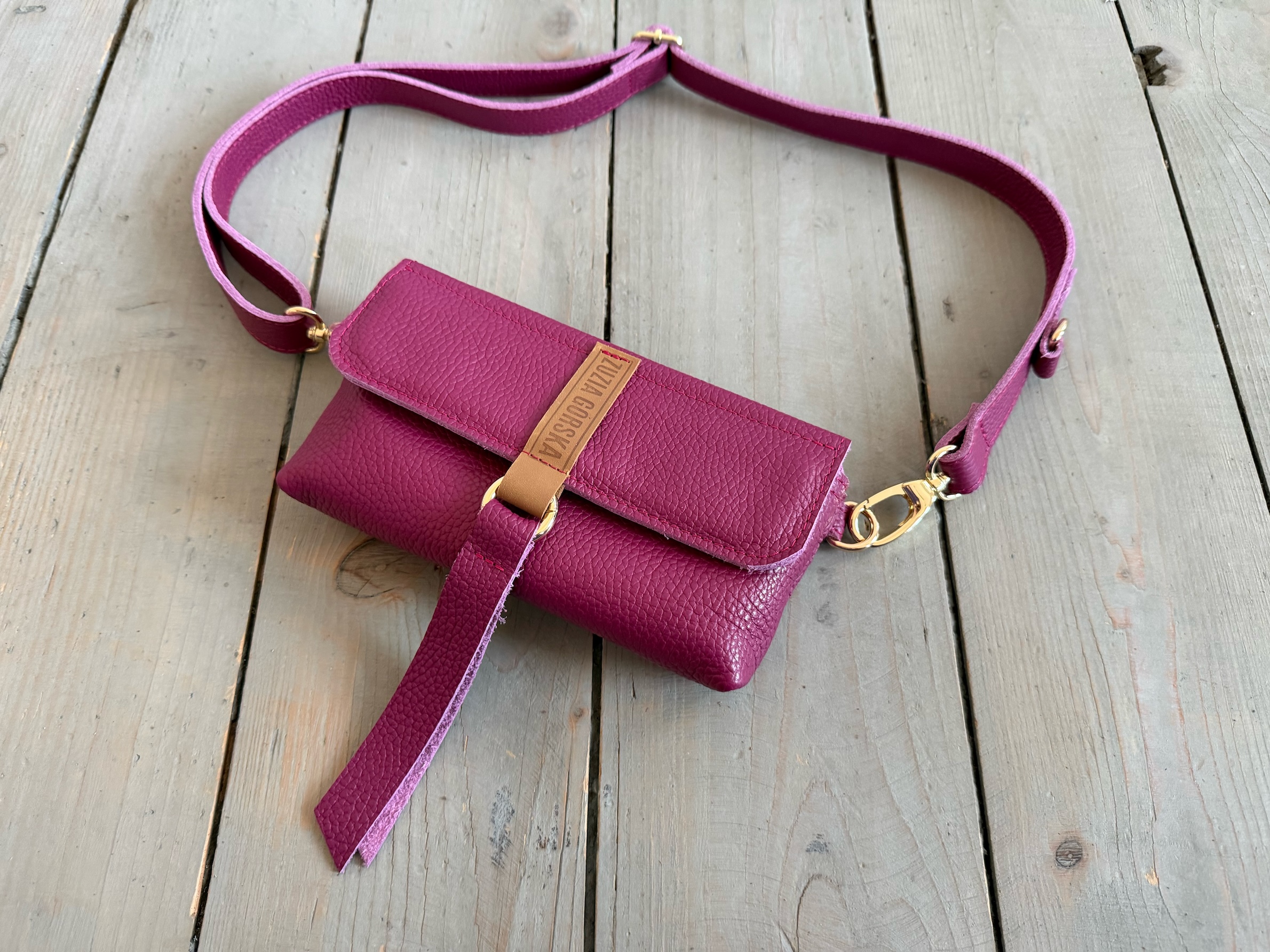 Uszyta ze skóry naturalnej licowej.