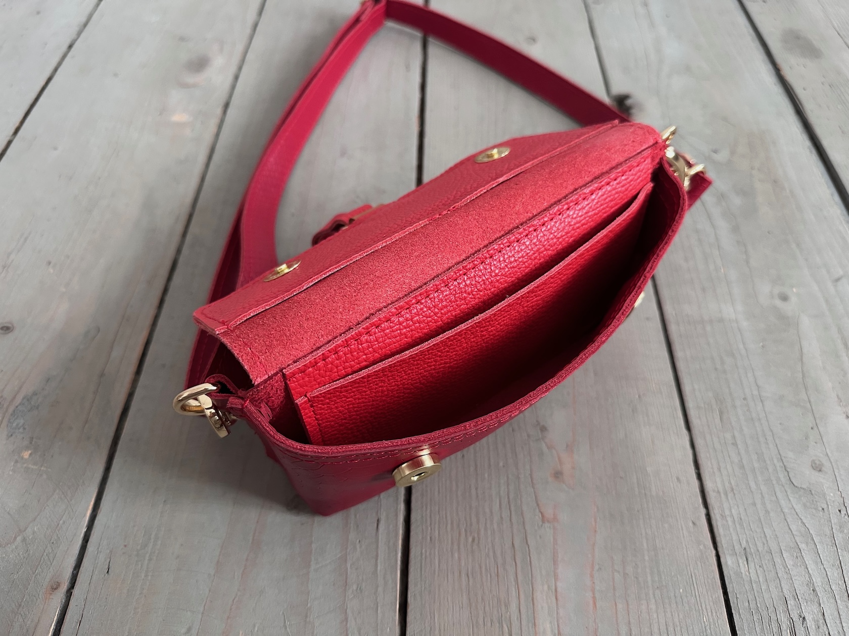Uszyta ze skóry naturalnej licowej.