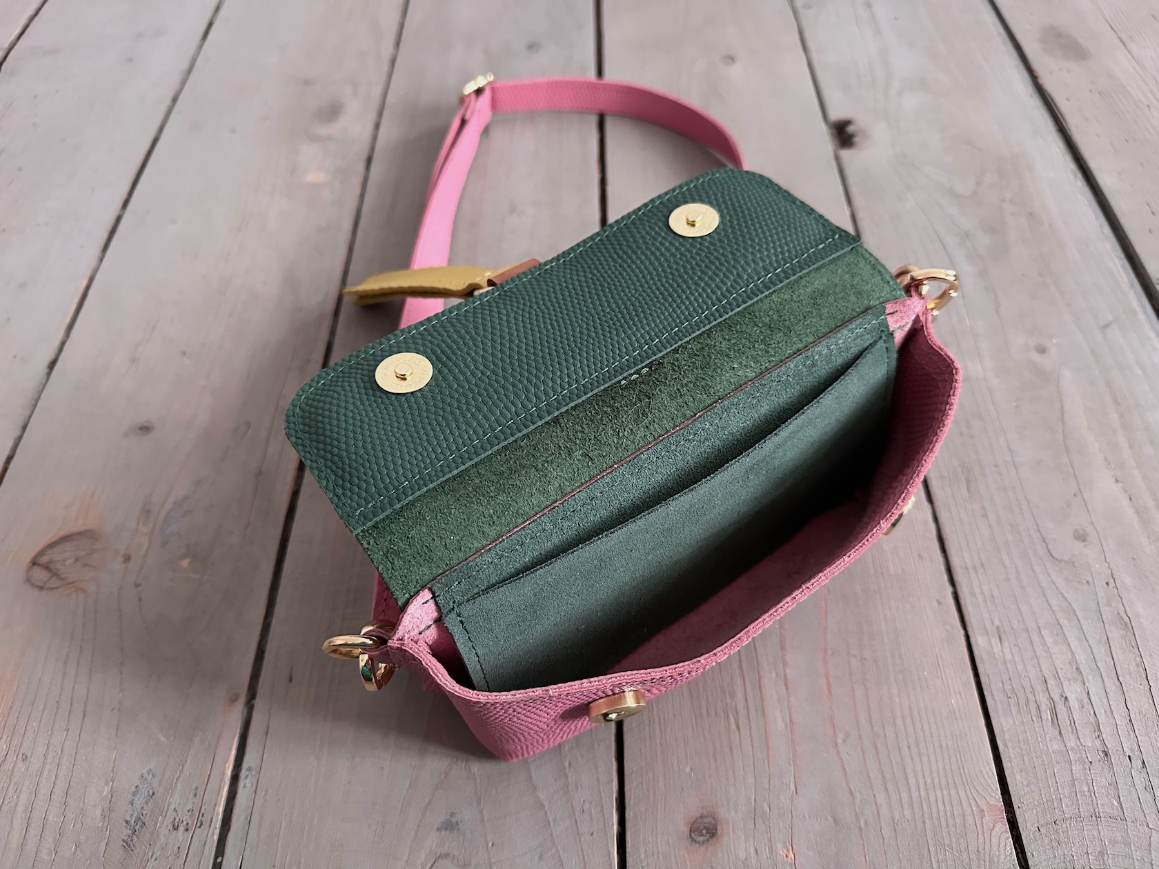 Uszyta ze skóry naturalnej licowej.