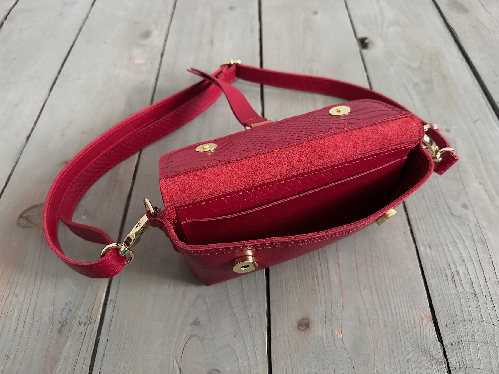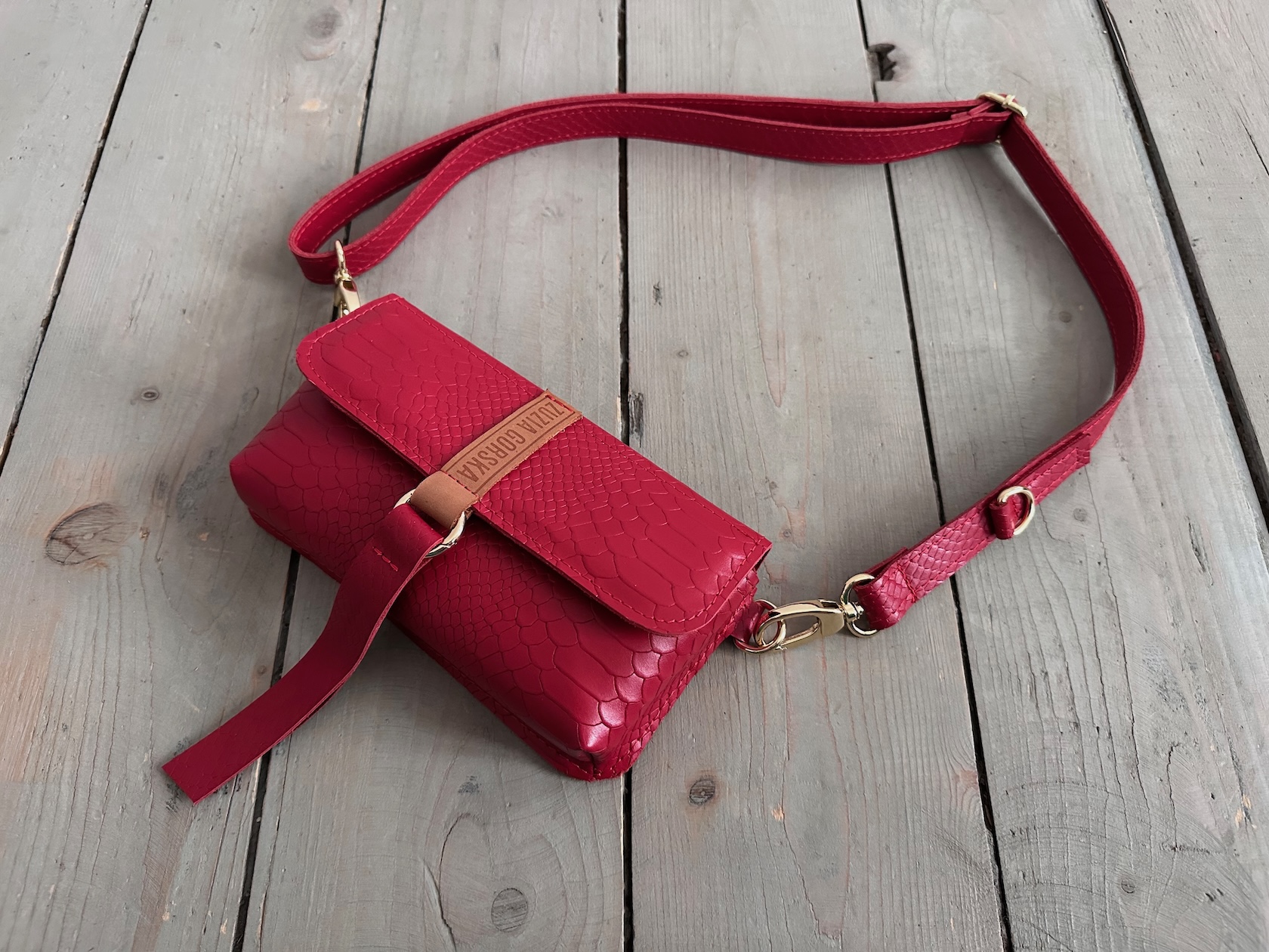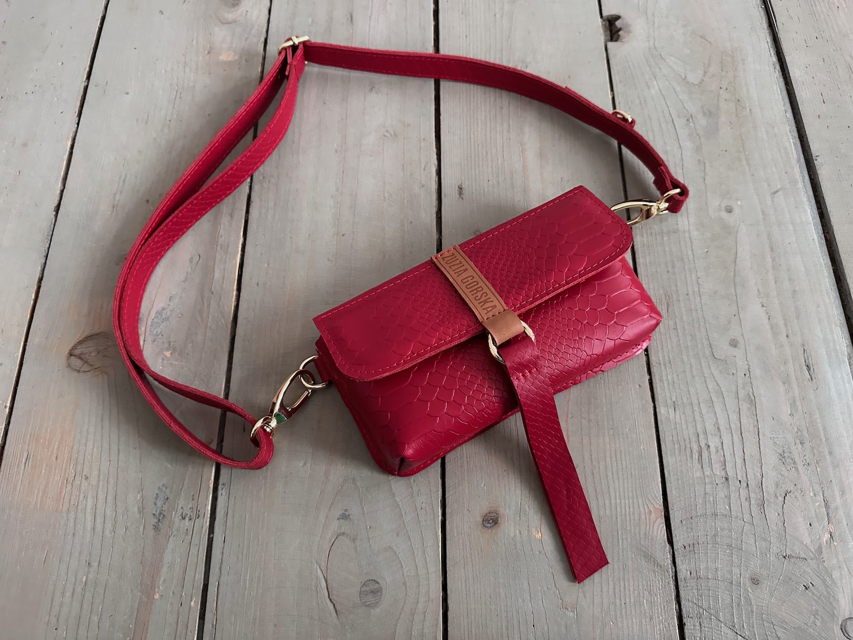 Uszyta ze skóry naturalnej licowej.