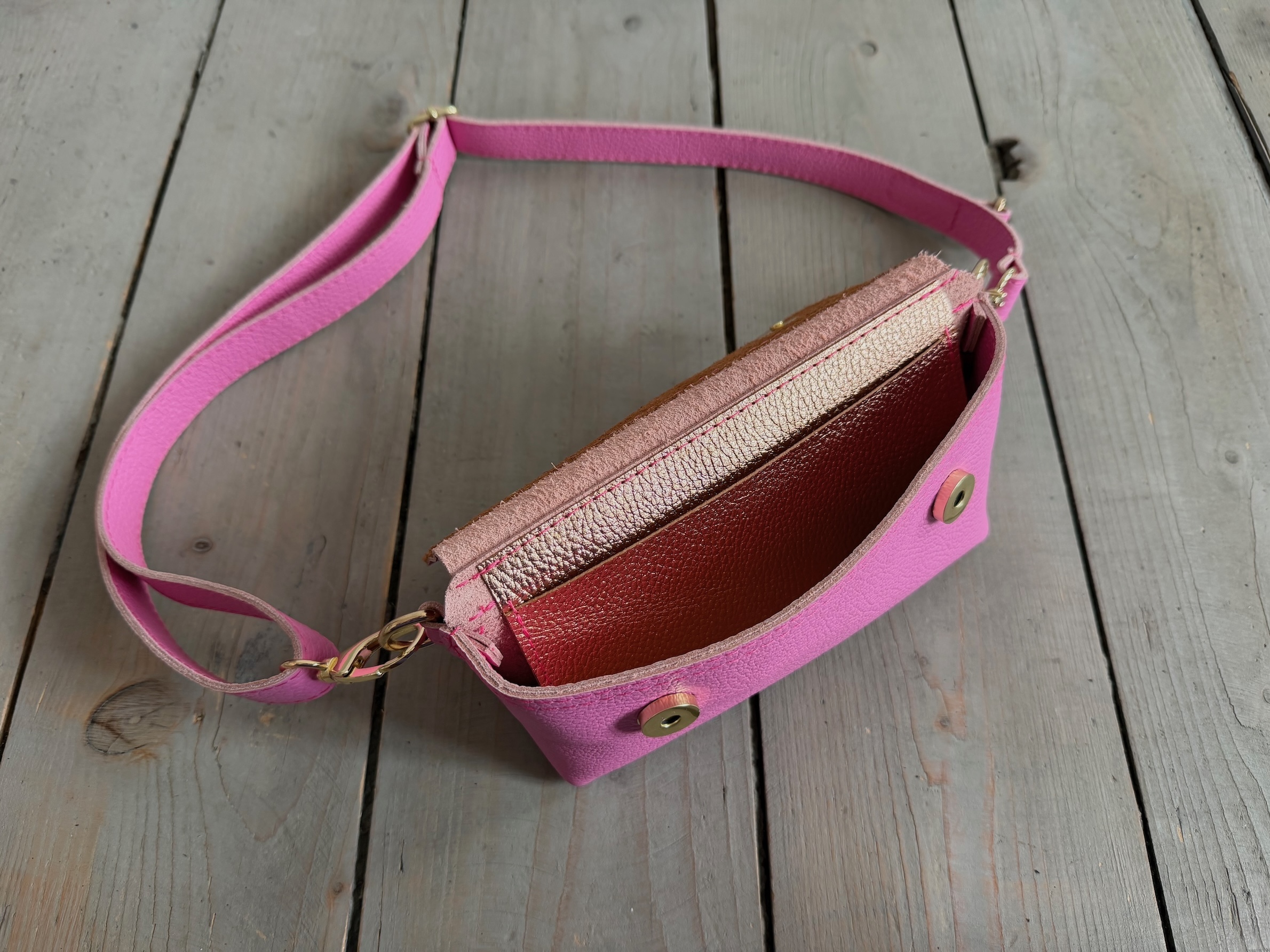 Uszyta ze skóry naturalnej licowej.
