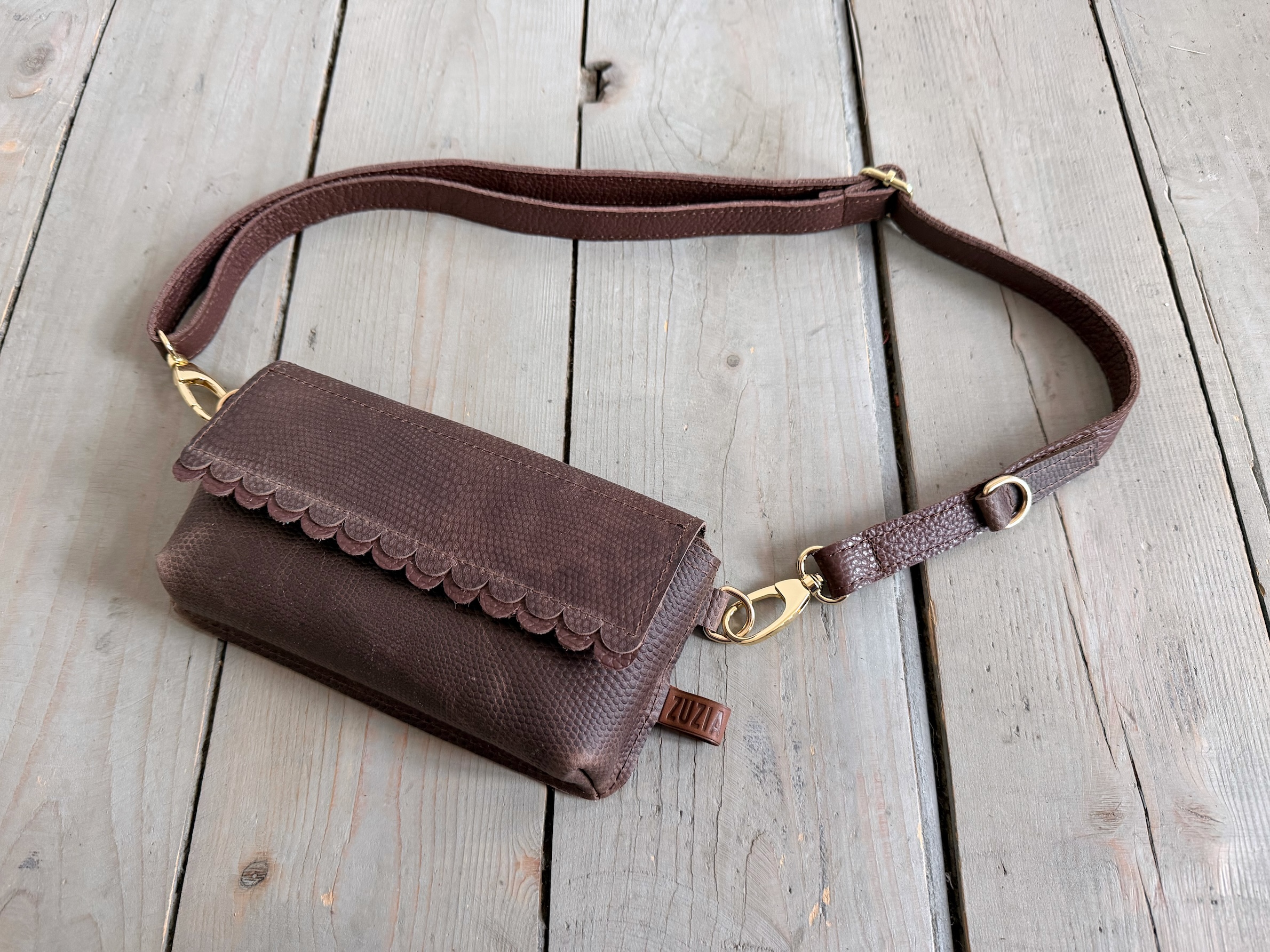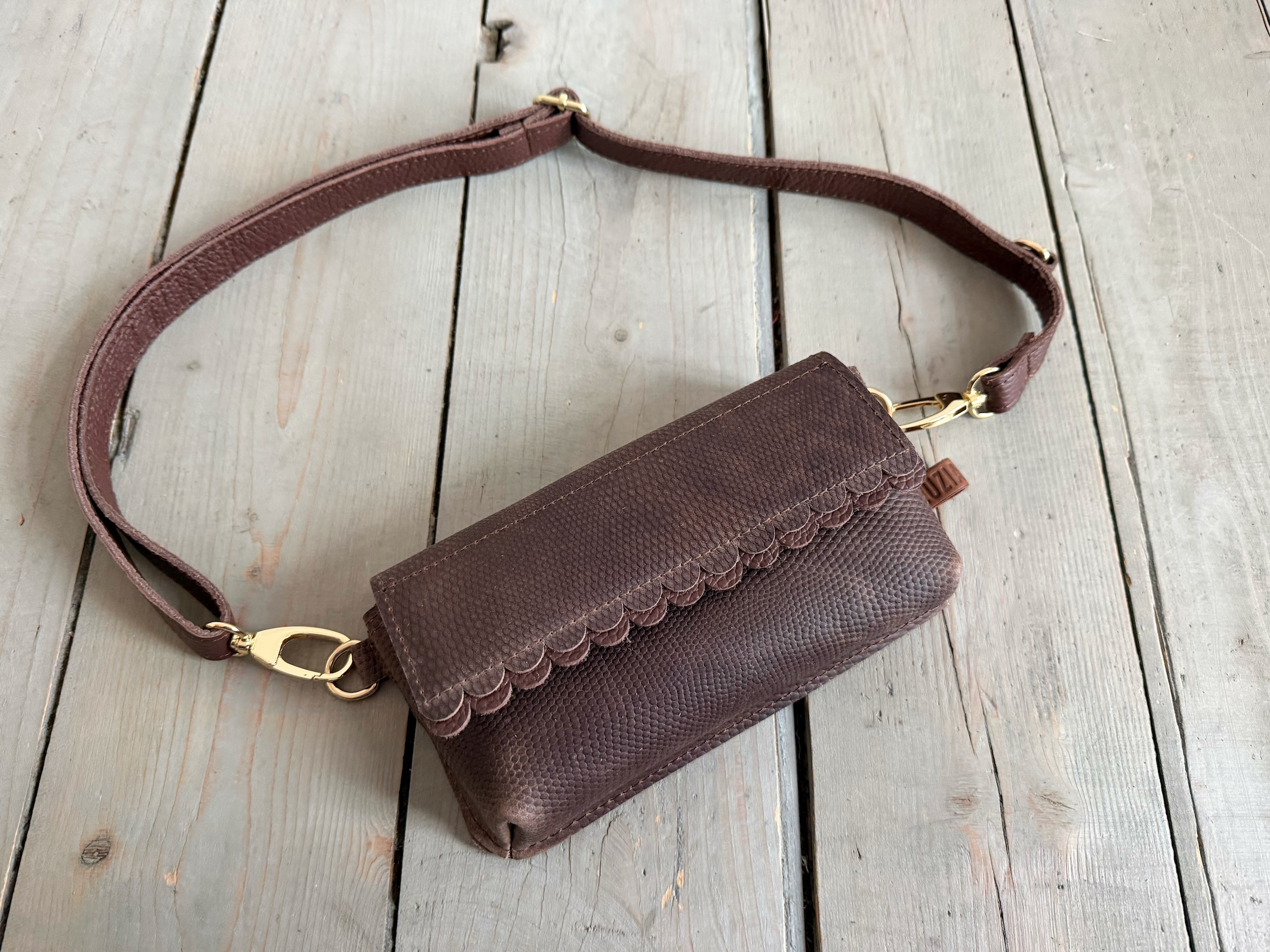 Uszyta ze skóry naturalnej typu pull up woskowanej.