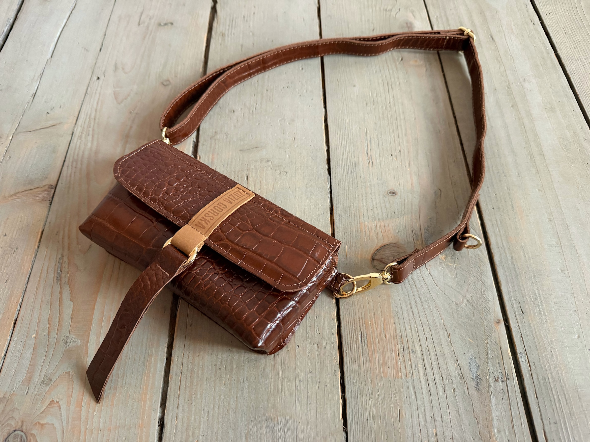 Uszyta ze skóry naturalnej licowej.