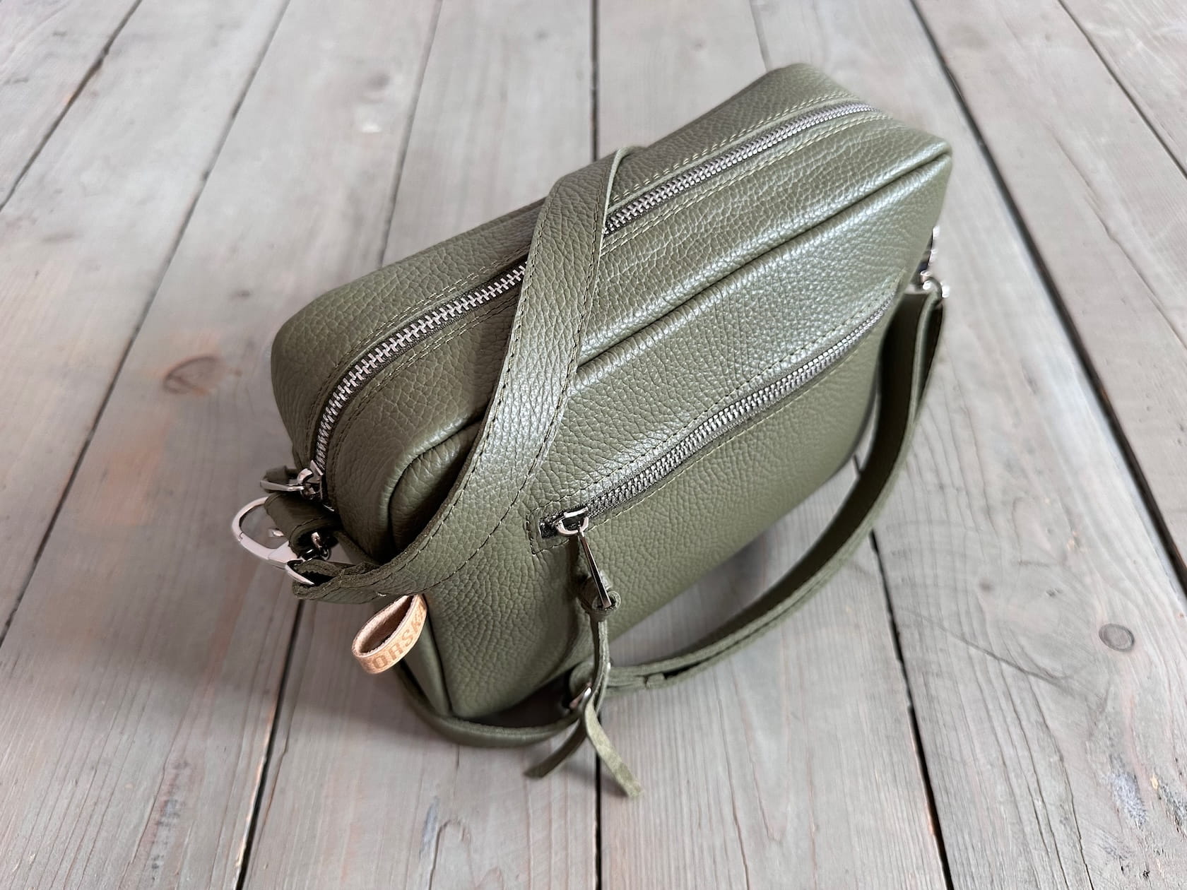 Średniej wielkości torebka, uszyta ze skóry naturalnej licowej + nubukowej.