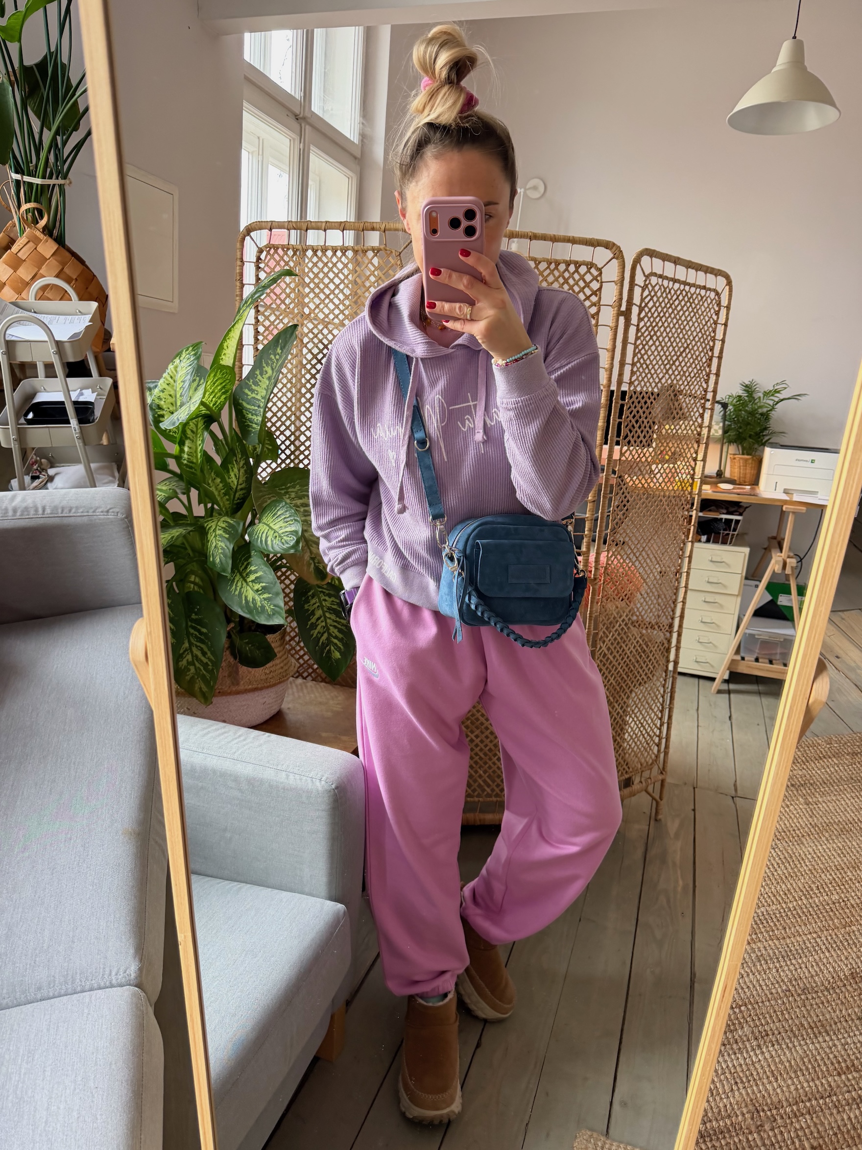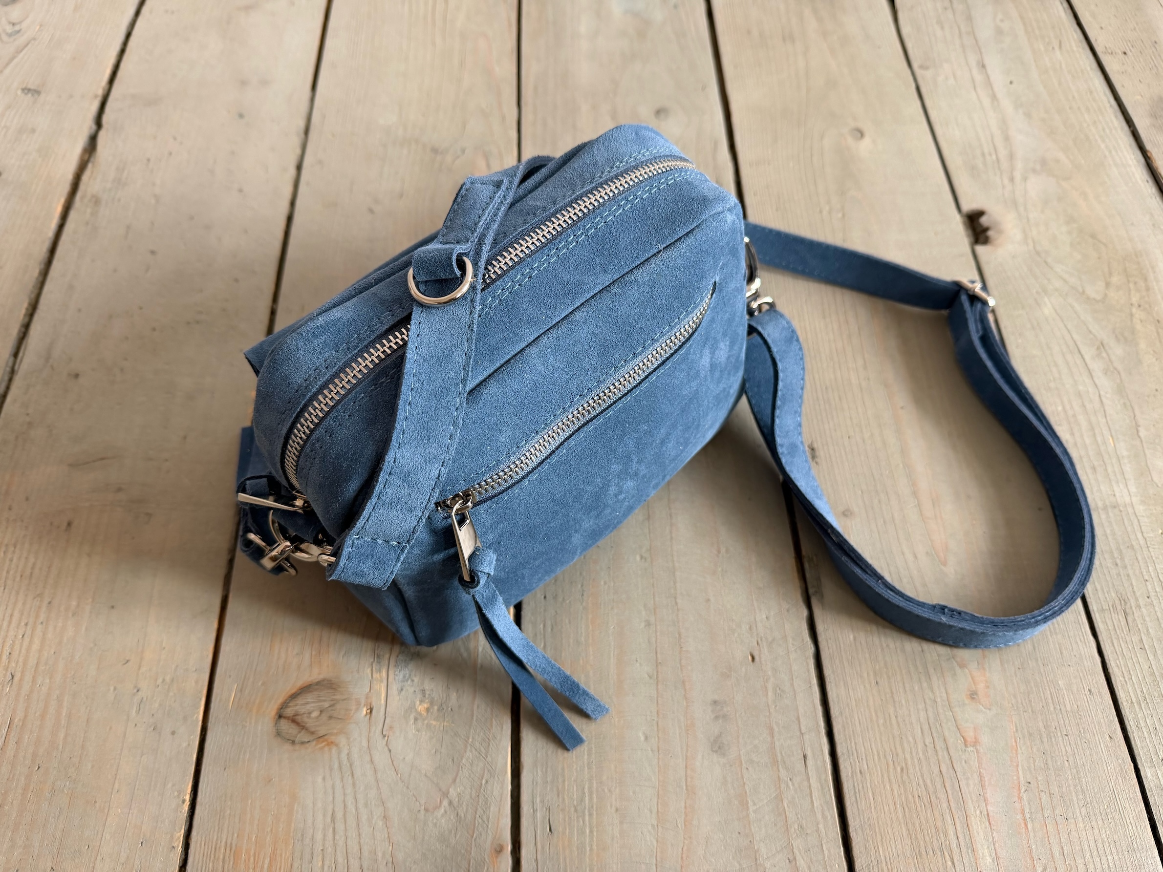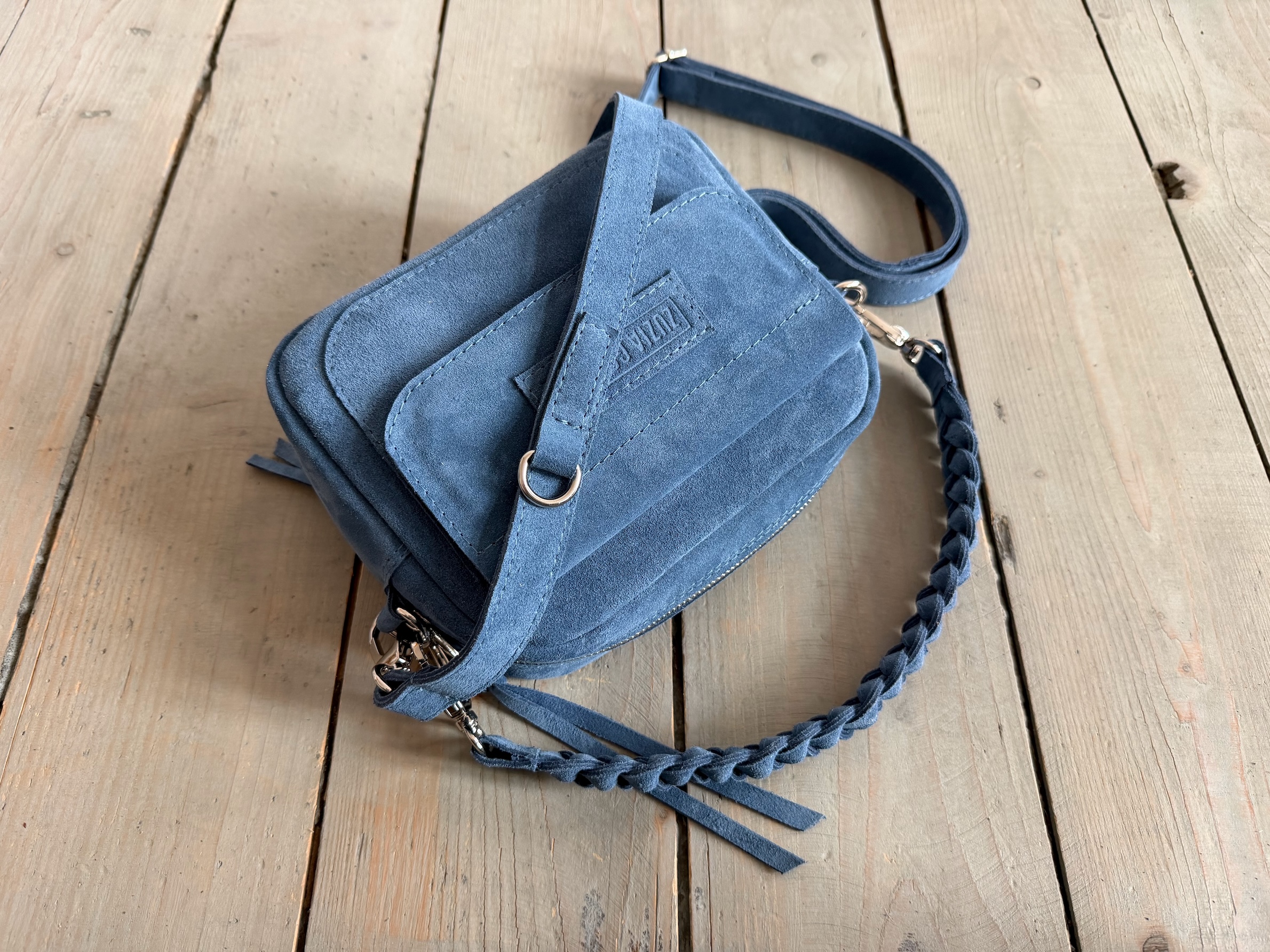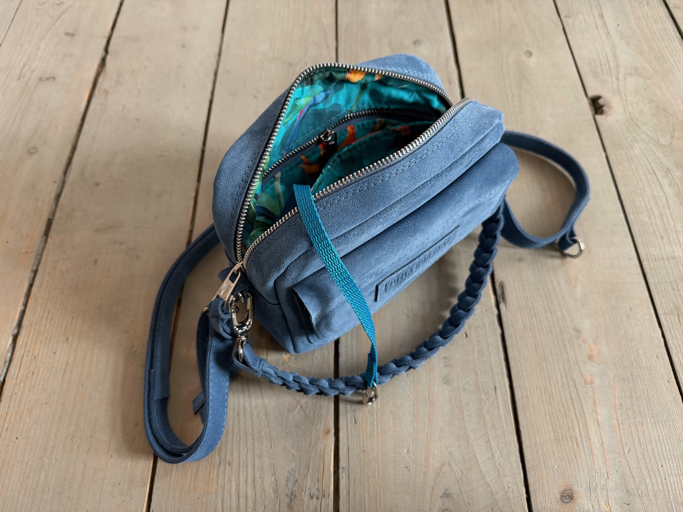Uszyta ze skóry naturalnej welurowej.