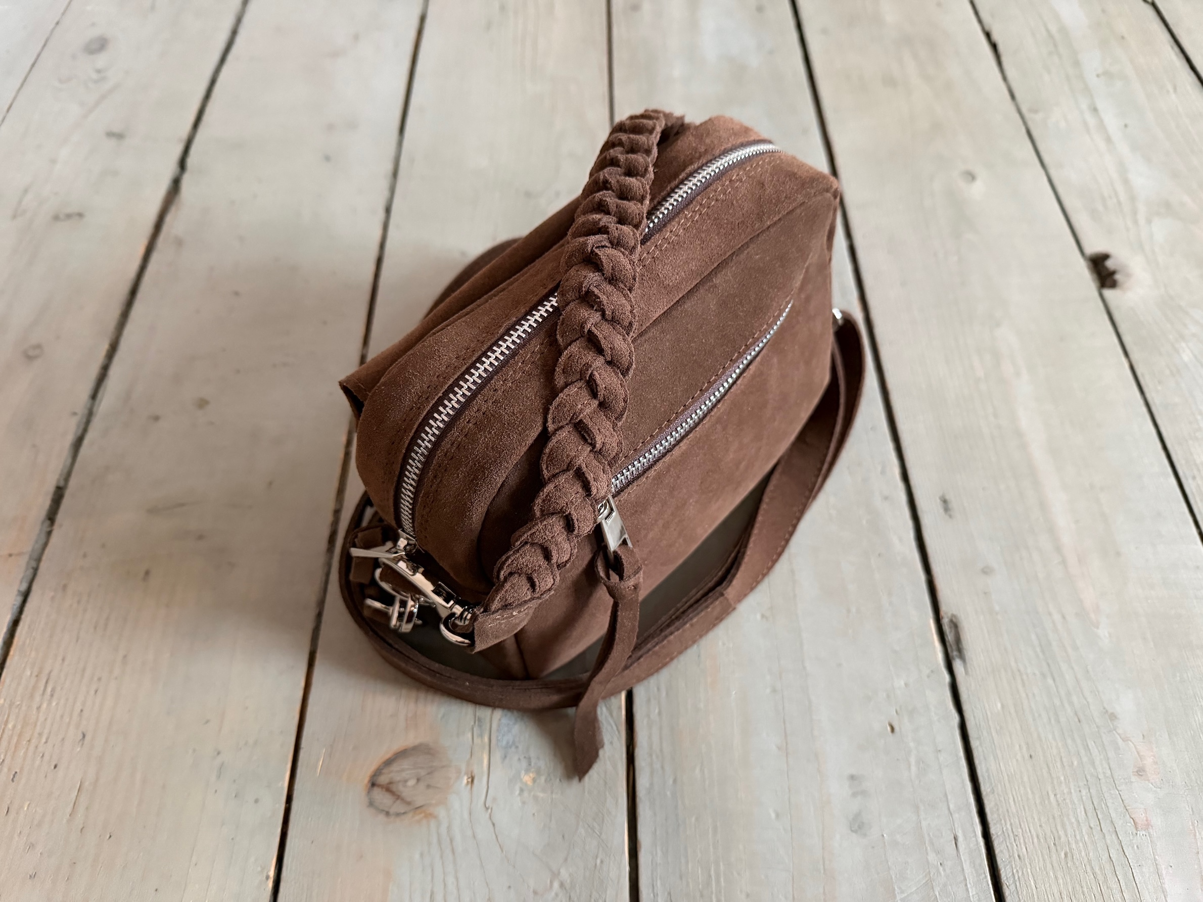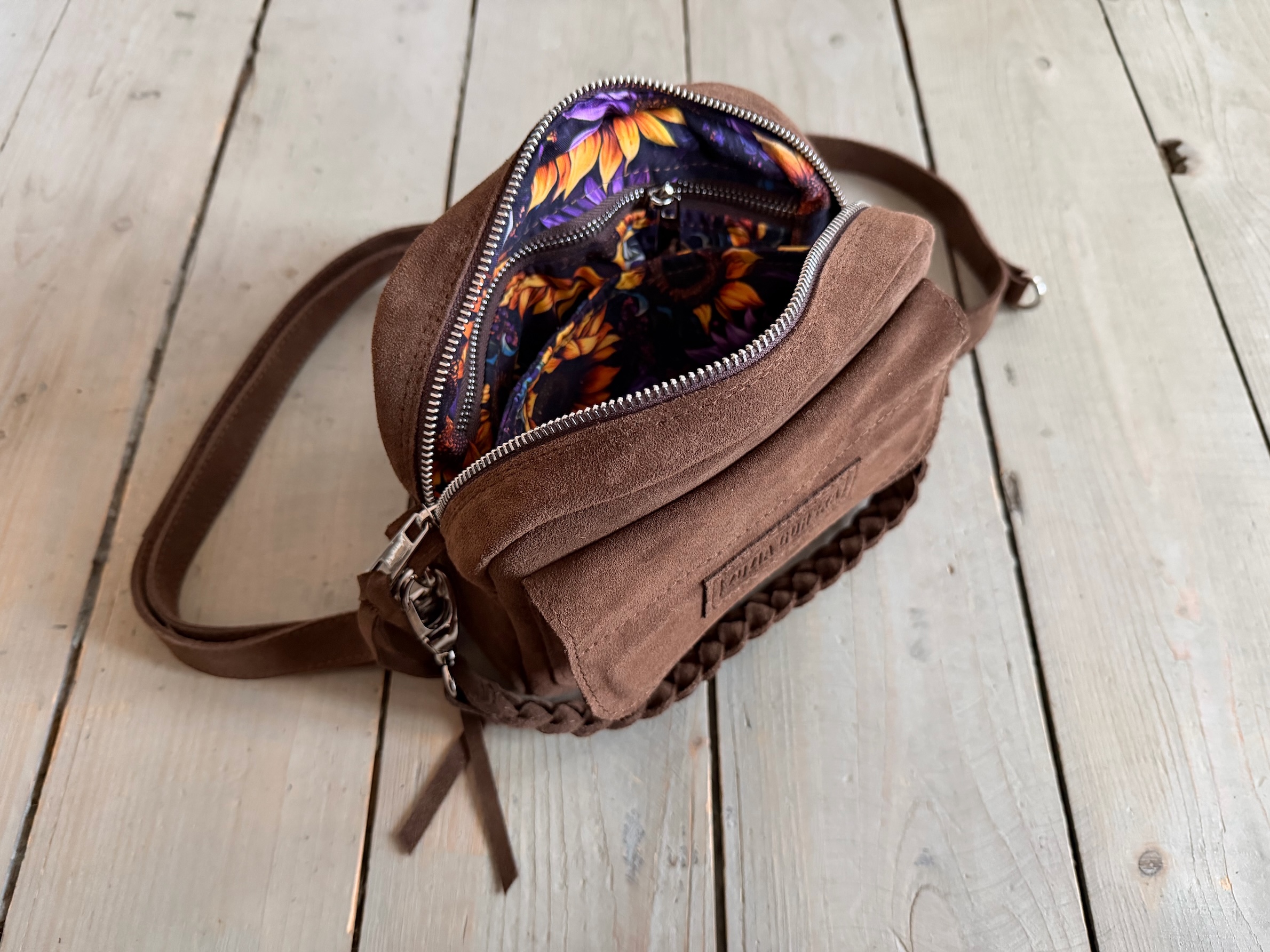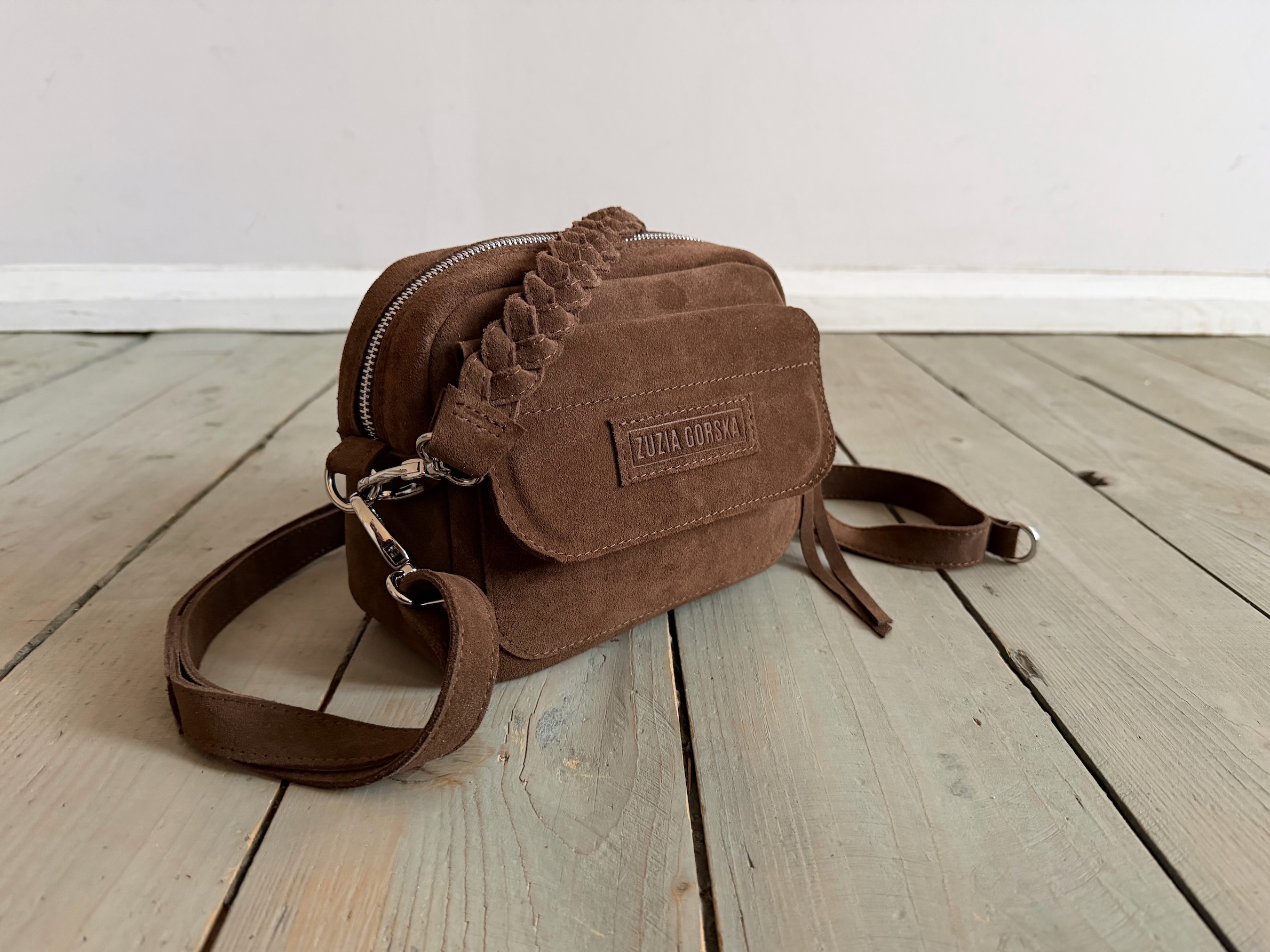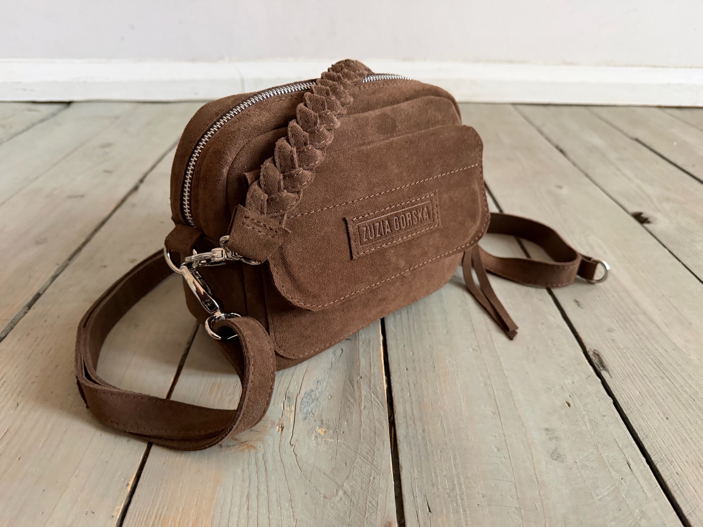 Uszyta ze skóry naturalnej welurowej.
