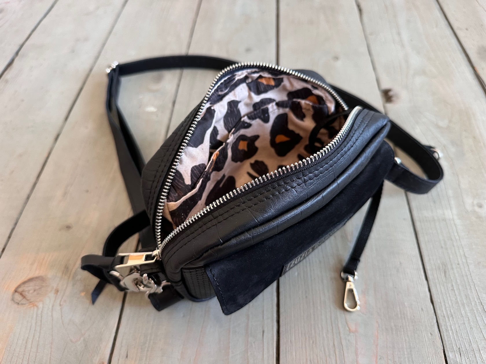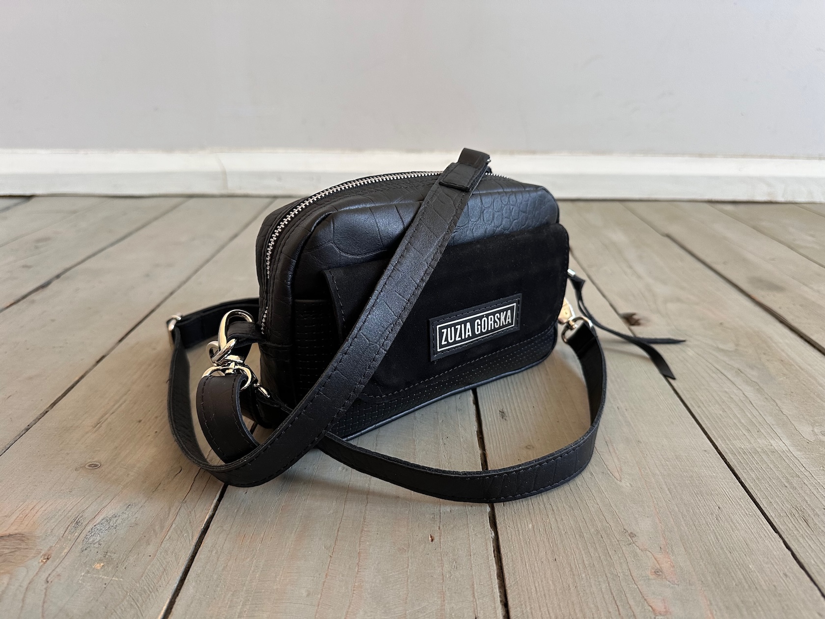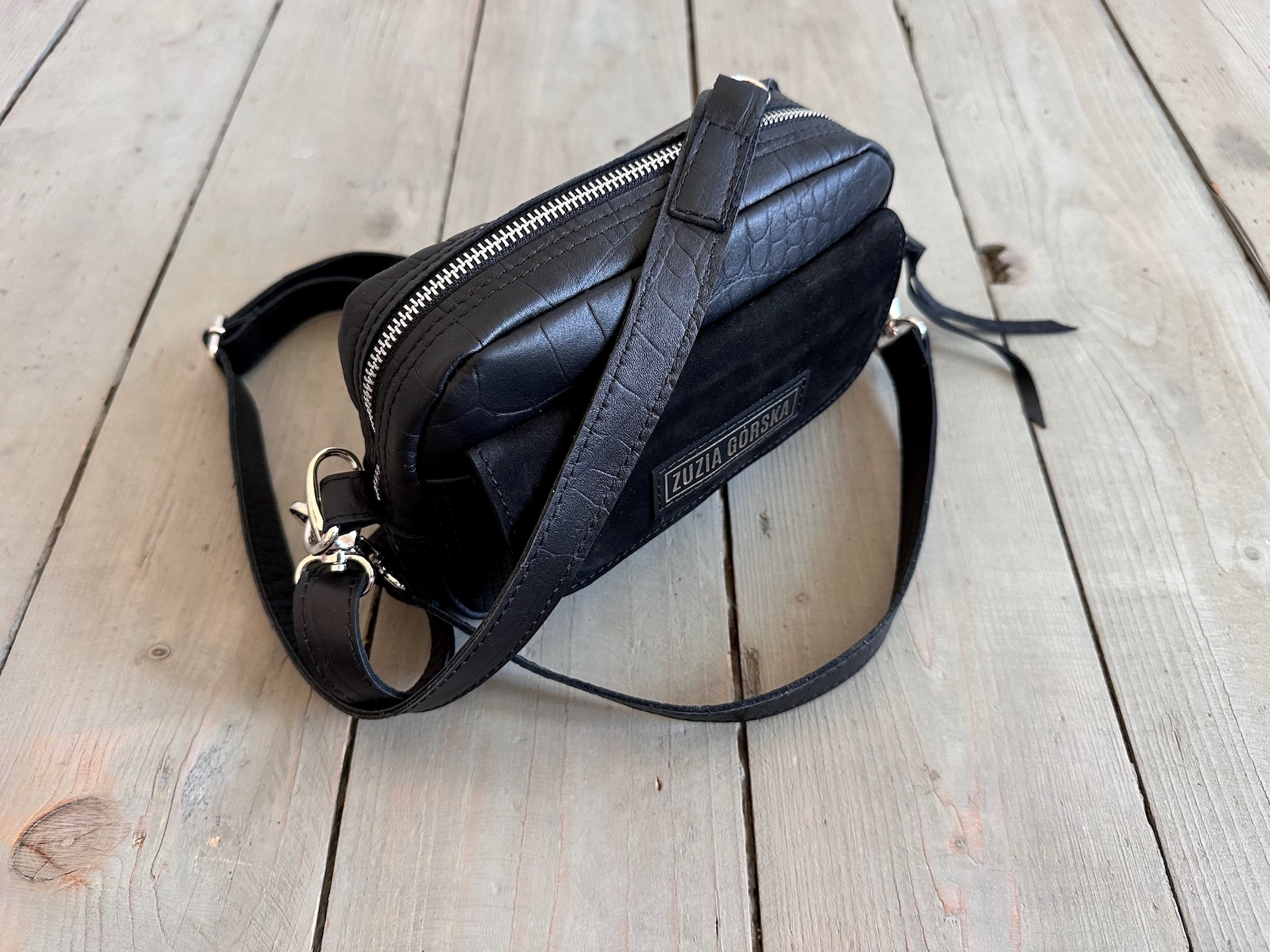 Z tyłu kieszonka na zamek, z przodu kieszonka pod klapką, wewnątrz przegródka + smyczka z karabińczykiem.