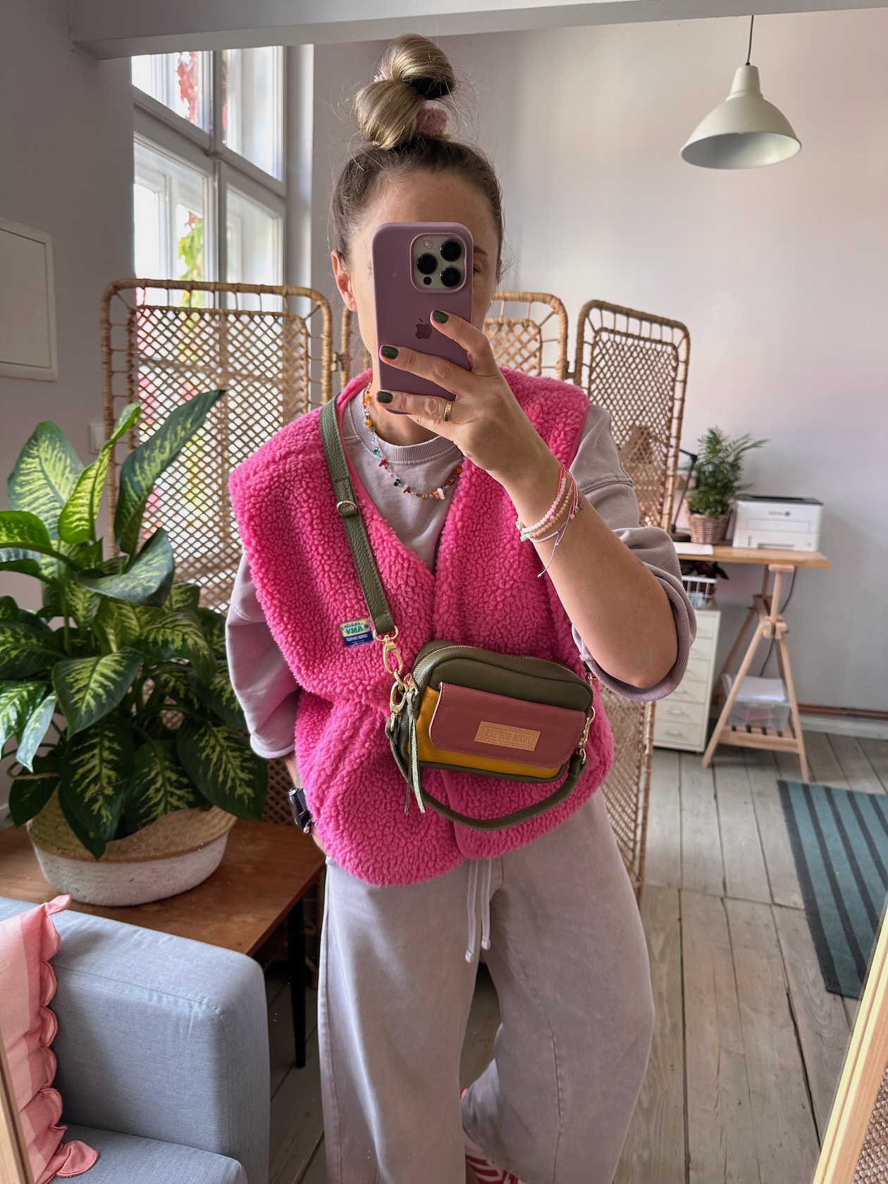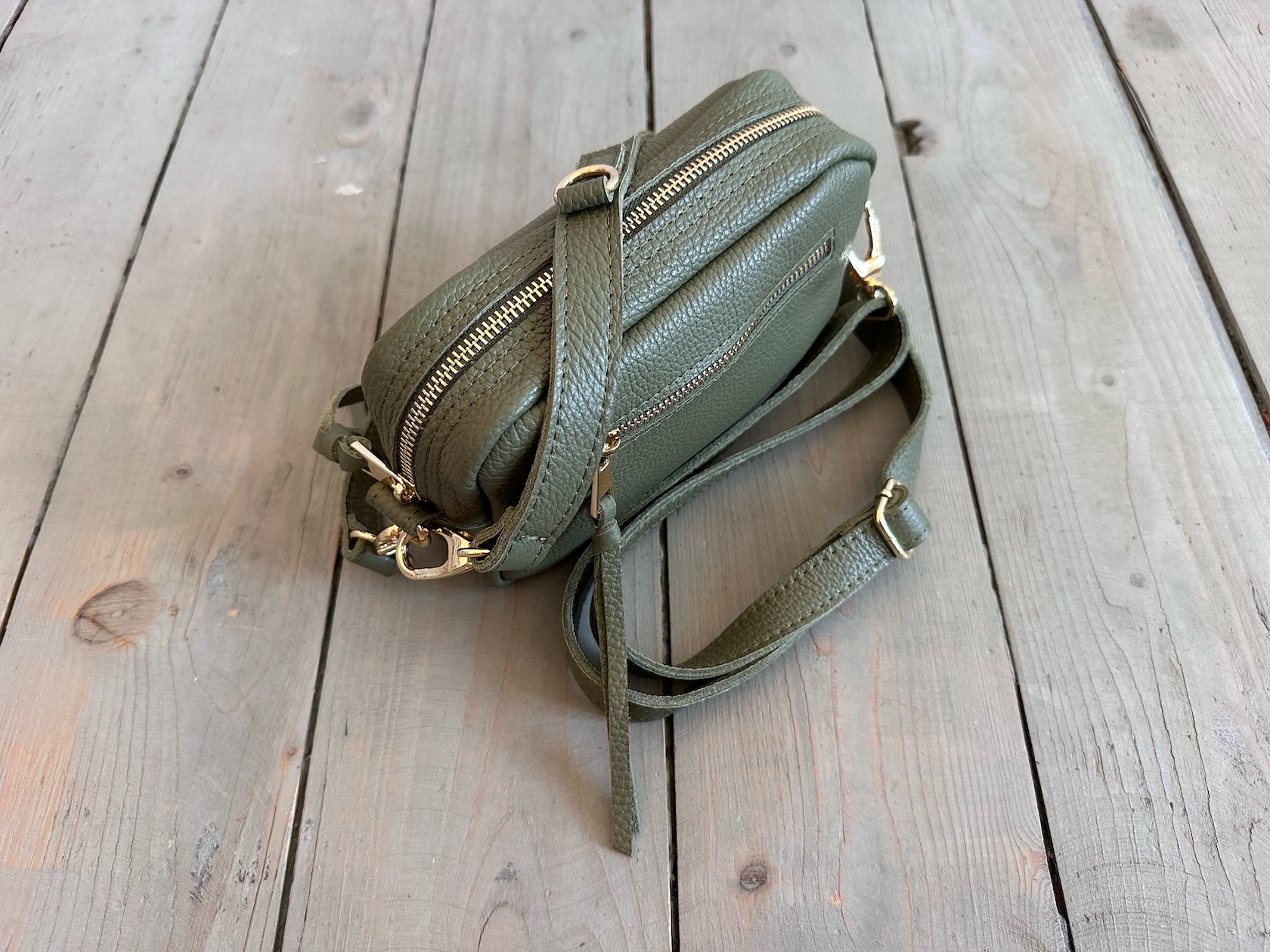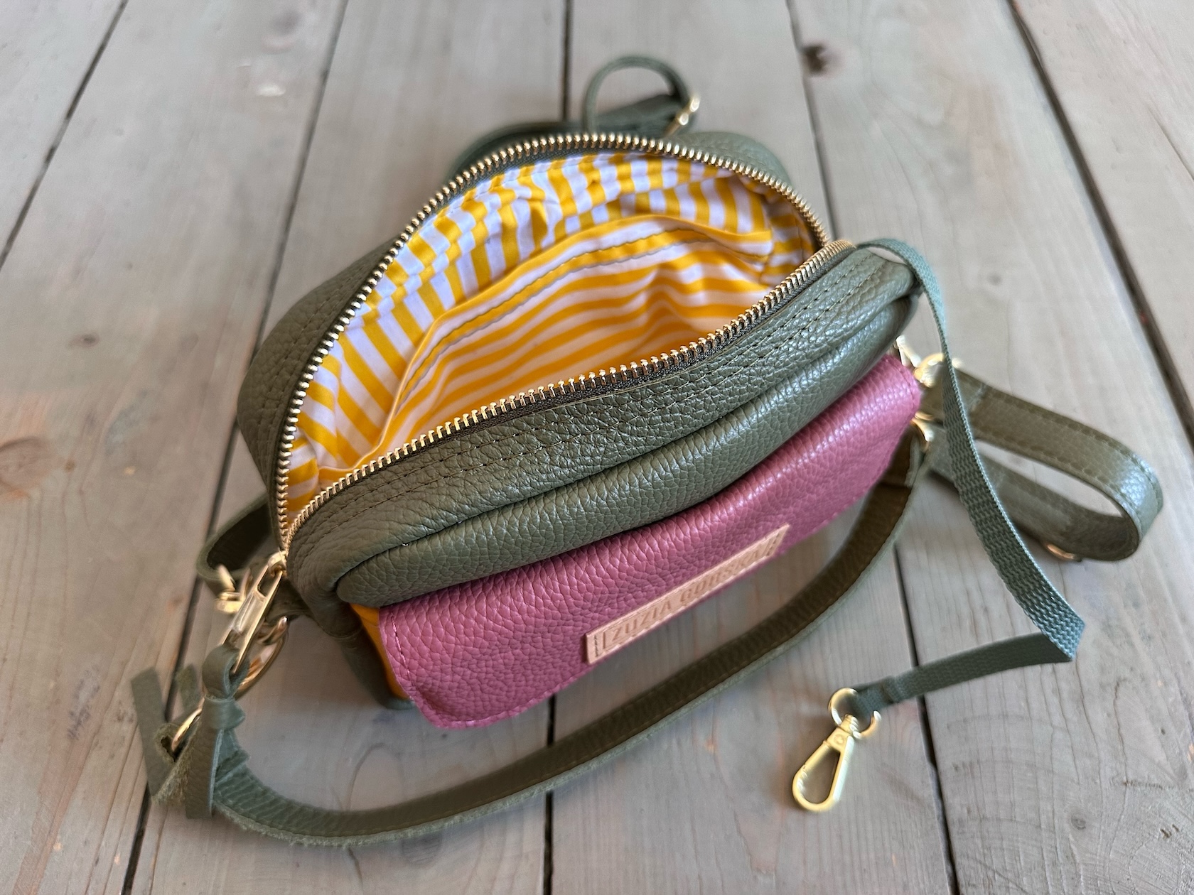Z tyłu kieszonka na zamek, z przodu kieszonka pod klapką, wewnątrz przegródka + smyczka z karabińczykiem.