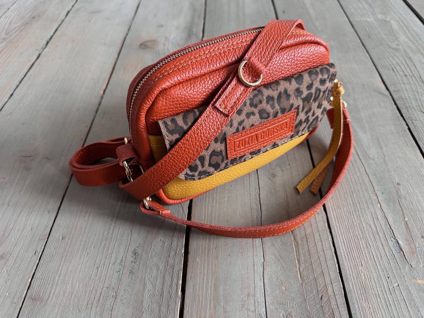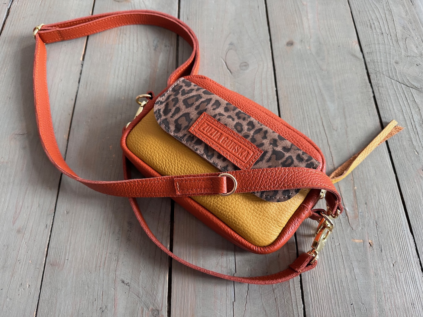 Z tyłu kieszonka na zamek, z przodu kiszona pod klapką, wewnątrz przegródka + smyczka z karabińczykiem.