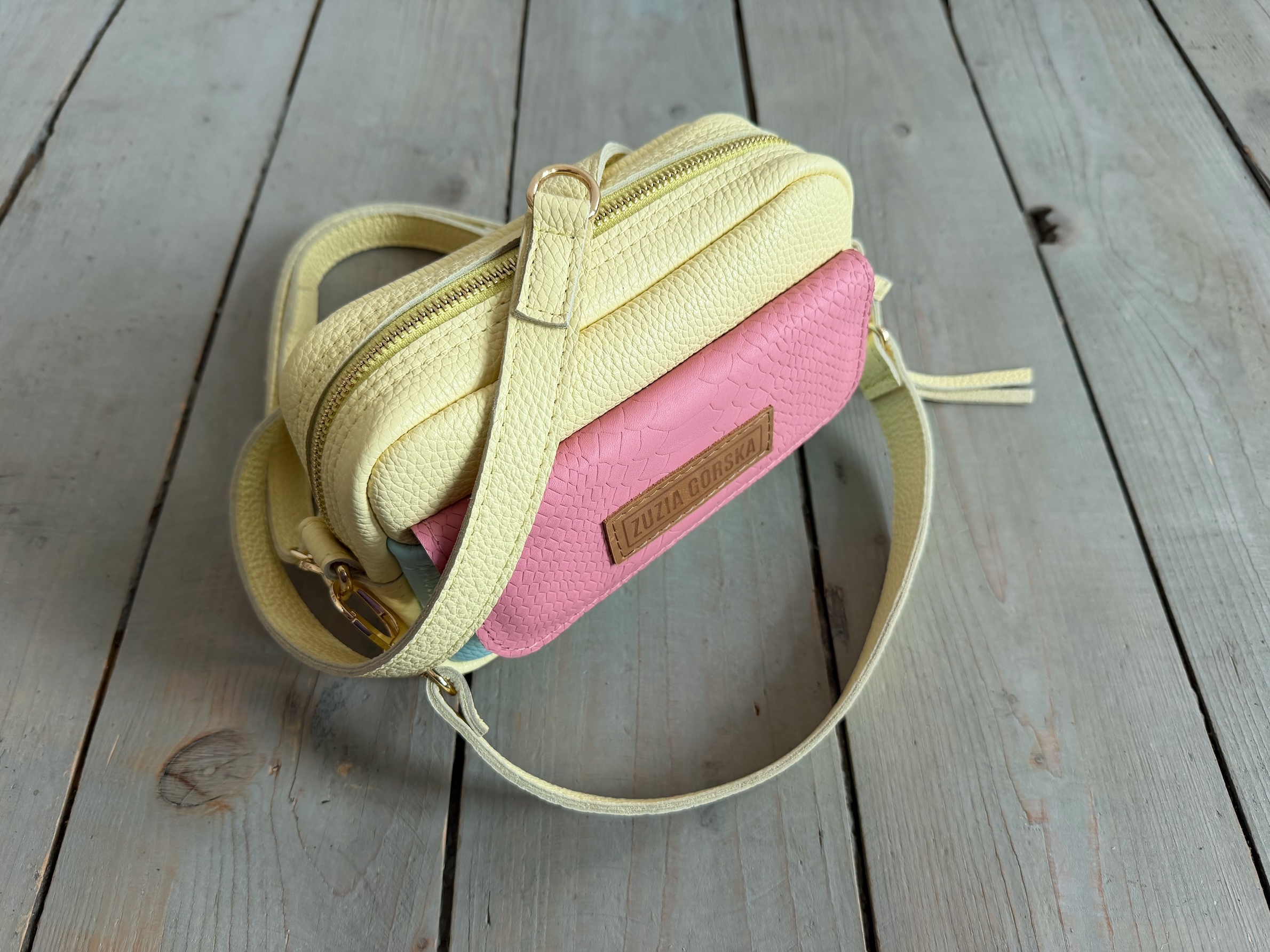 Z tyłu kieszonka na zamek, z przodu kieszonka pod klapką, wewnątrz przegródka + smyczka z karabińczykiem.