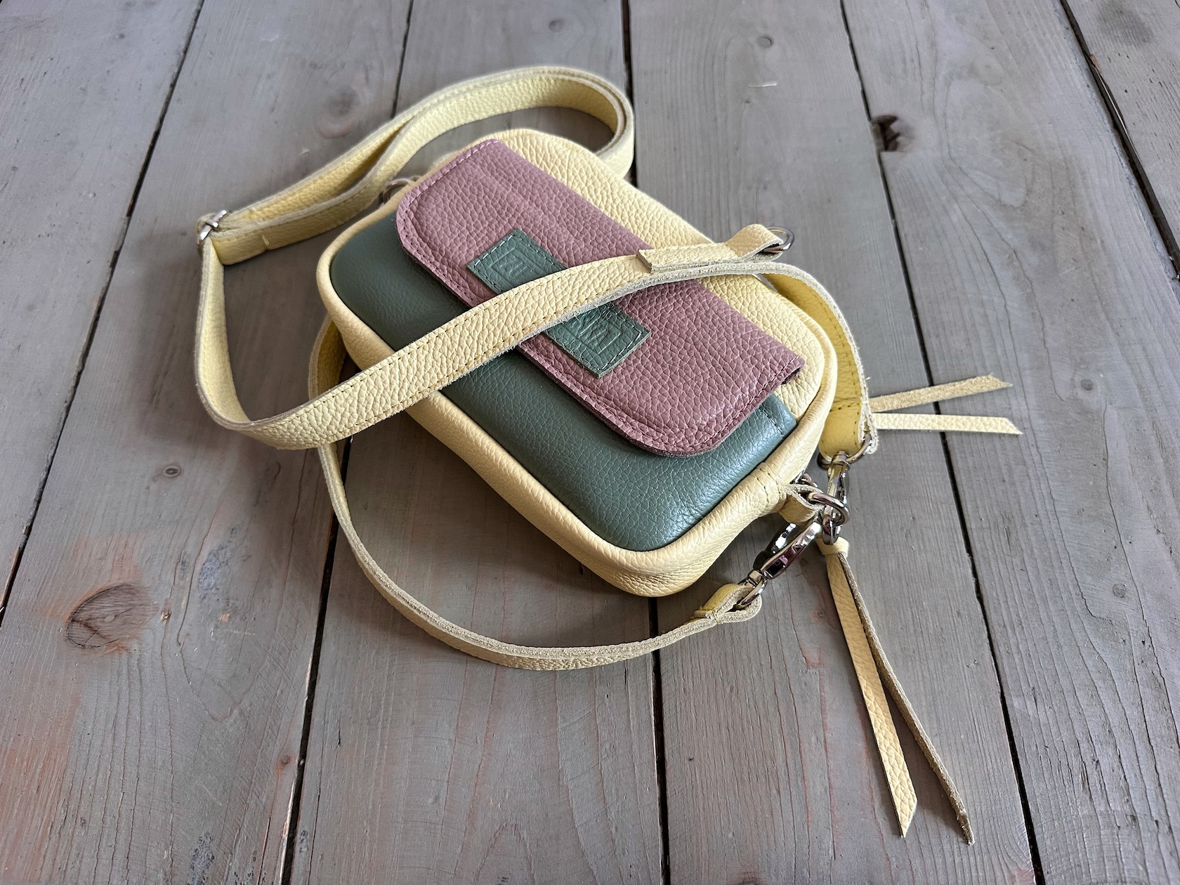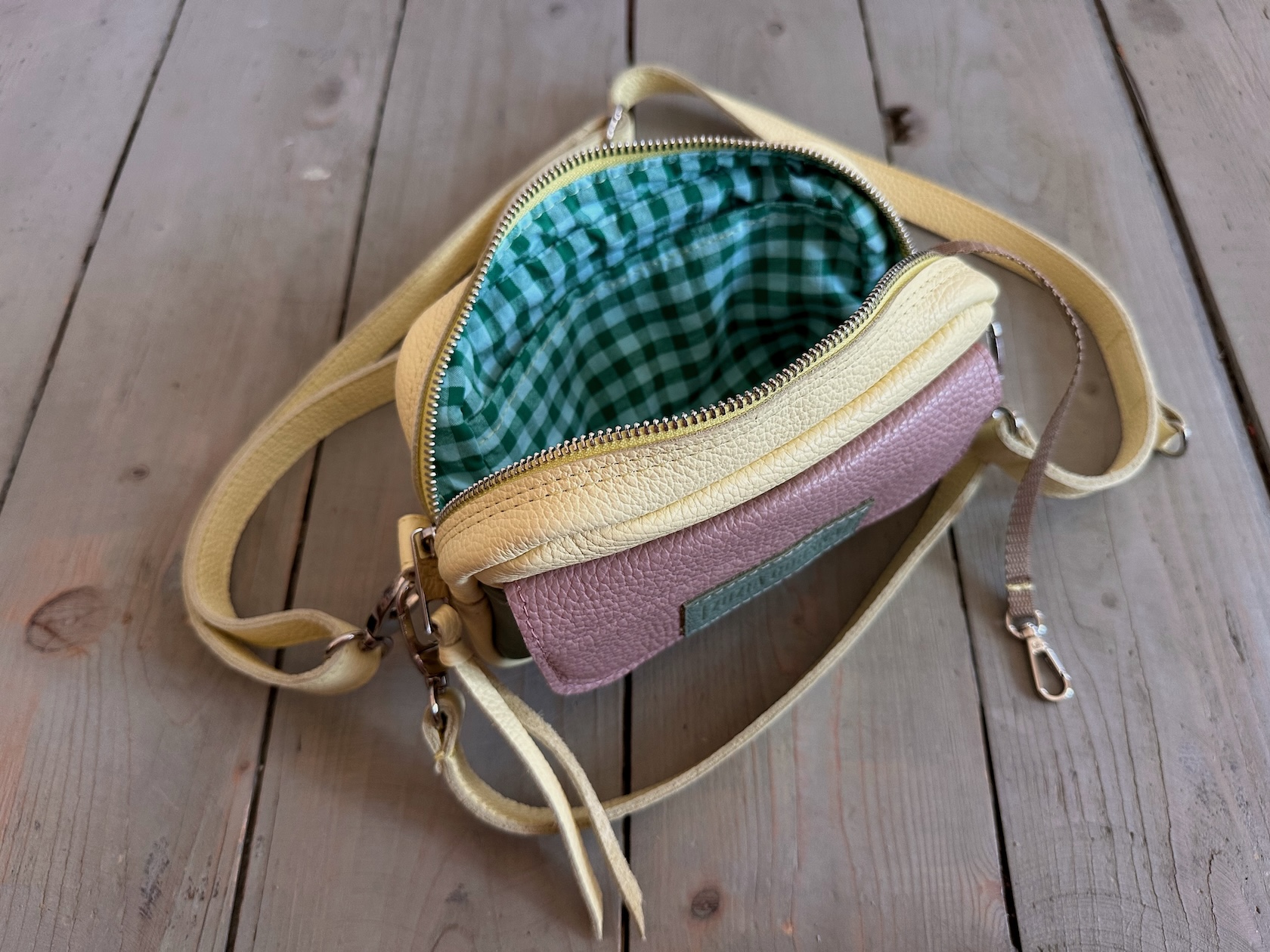 Z tyłu kieszonka na zamek, z przodu kieszonka pod klapką, wewnątrz przegródka + smyczka z karabińczykiem.