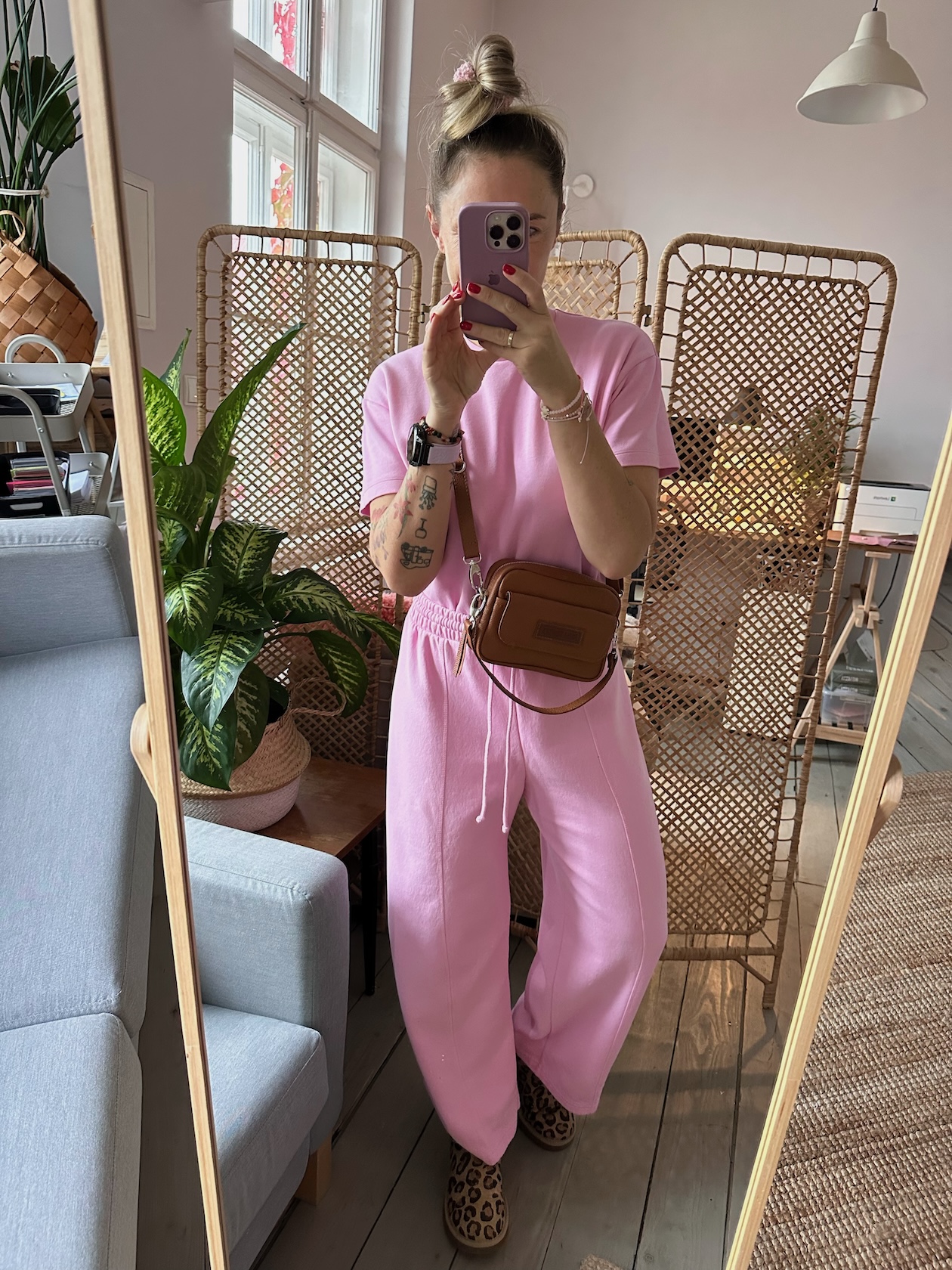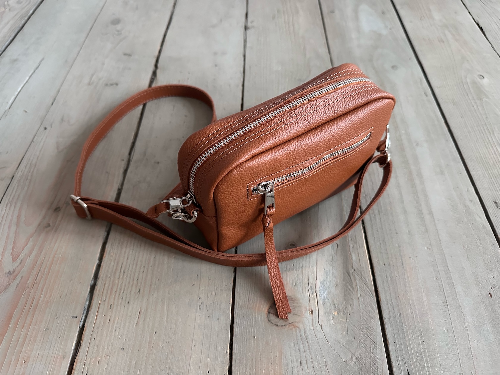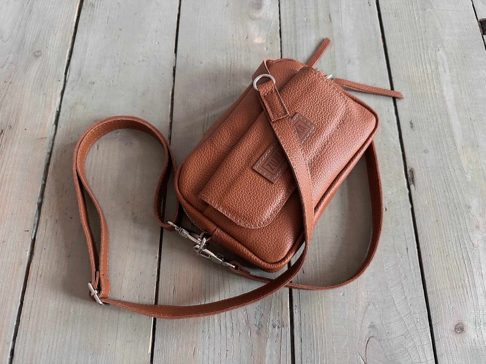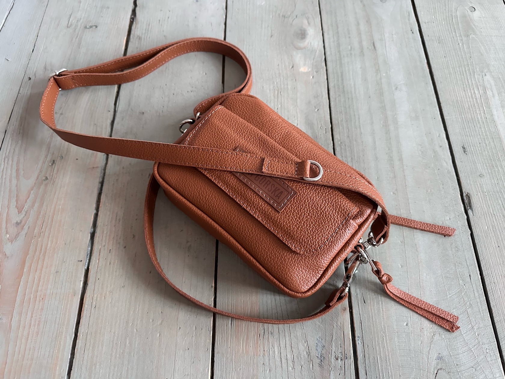 Z tyłu kieszonka na zamek, z przodu kieszonka pod klapką, wewnątrz przegródka + smyczka z karabińczykiem.
