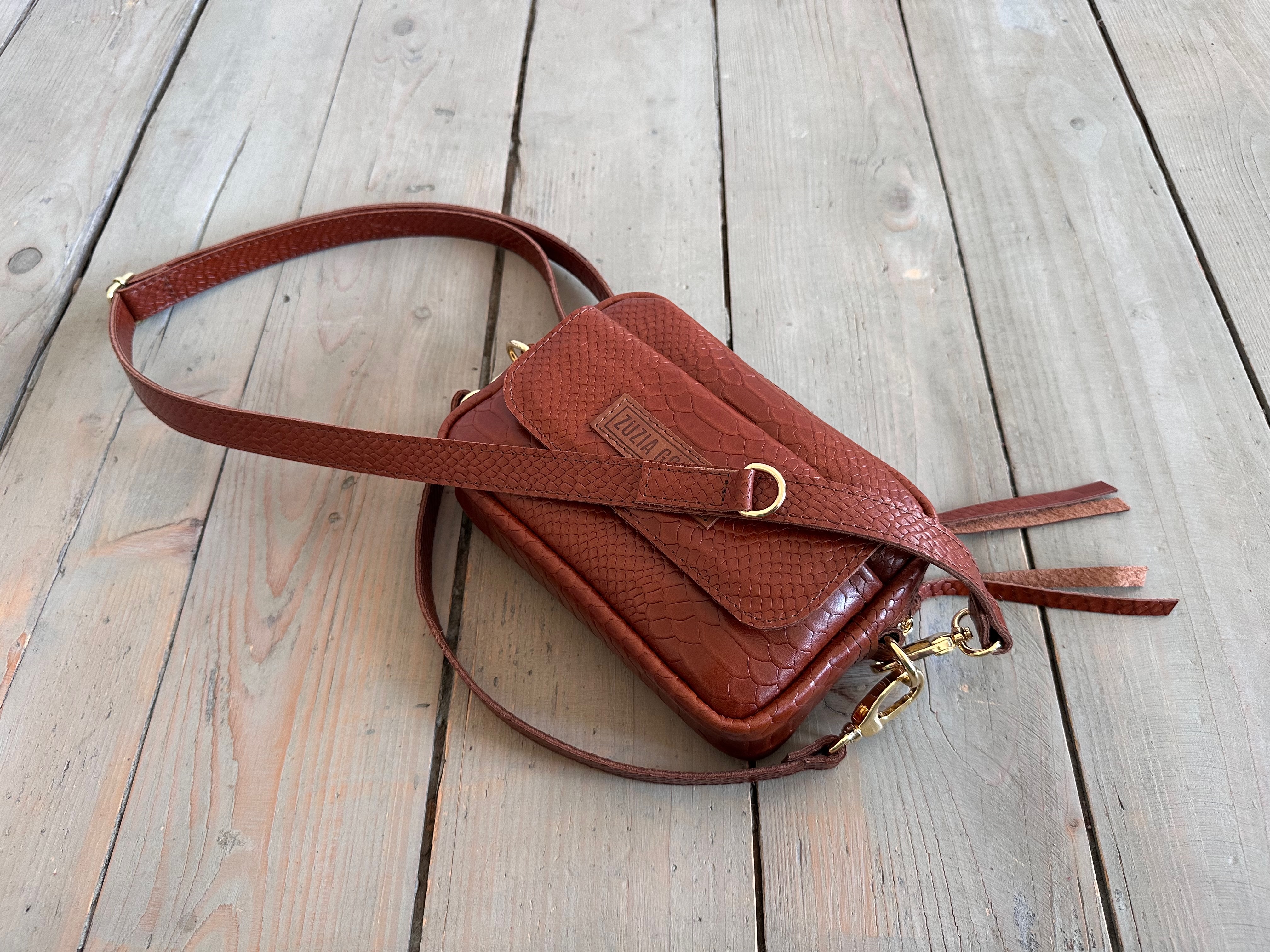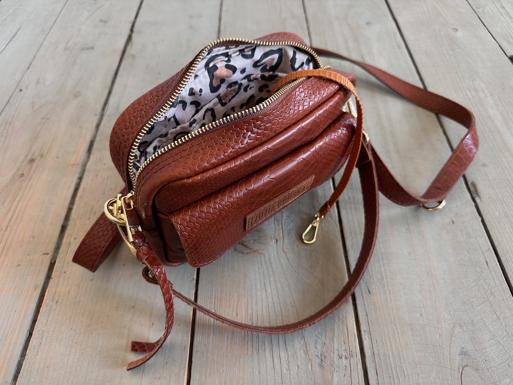 Z tyłu kieszonka na zamek, z przodu kieszonka pod klapką, wewnątrz przegródka + smyczka z karabińczykiem.