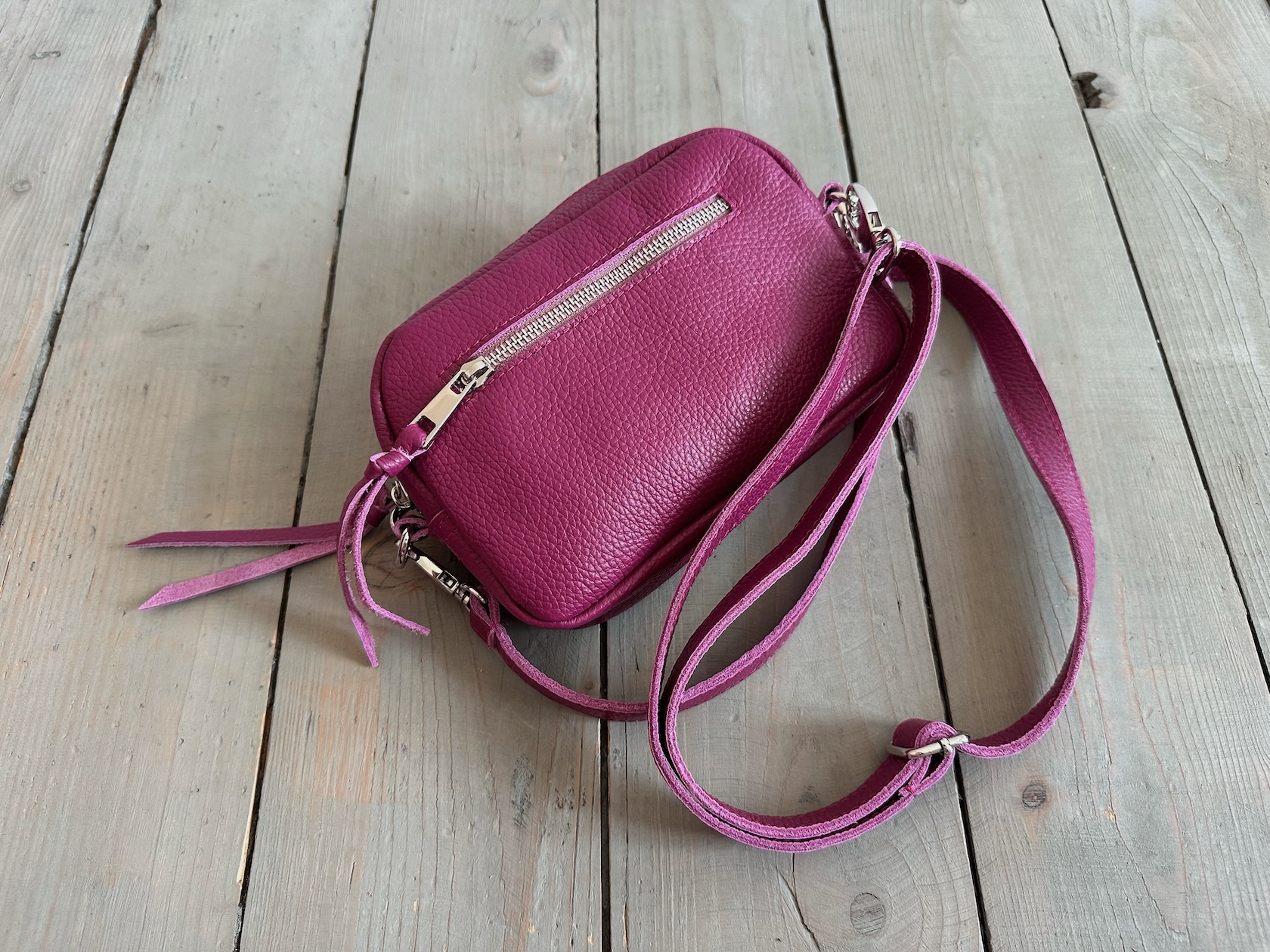 Z tyłu kieszonka na zamek, z przodu kieszonka pod klapką, wewnątrz przegródka + smyczka z karabińczykiem.
