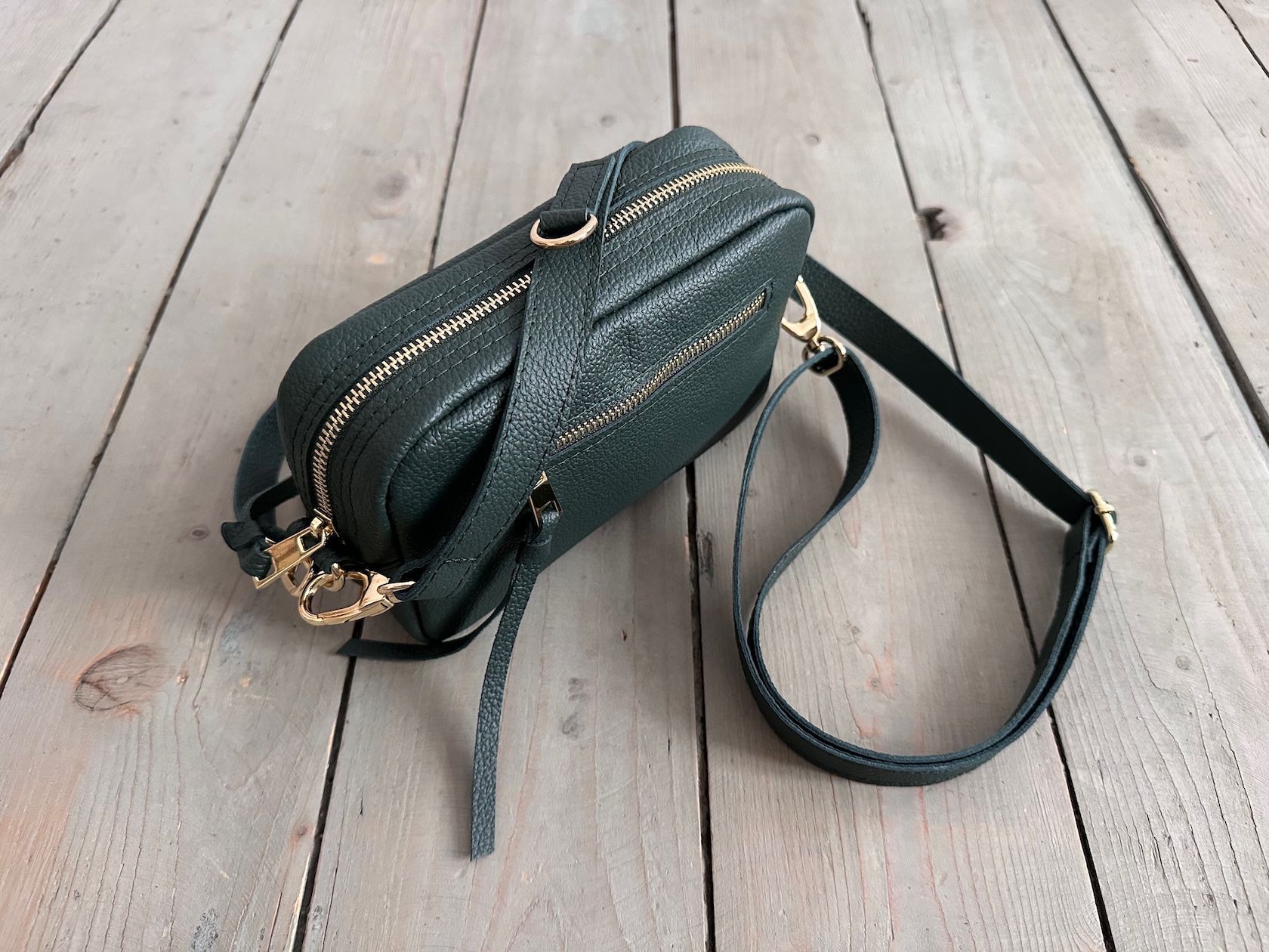Z tyłu kieszonka na zamek, z przodu kieszonka pod klapką, wewnątrz przegródka + smyczka z karabińczykiem.