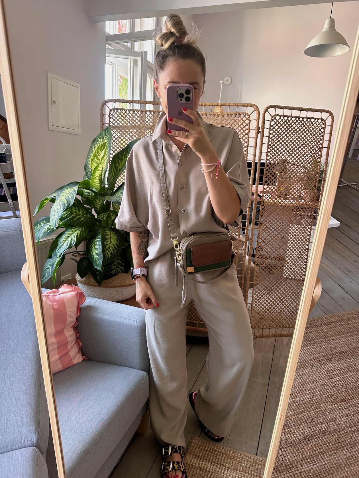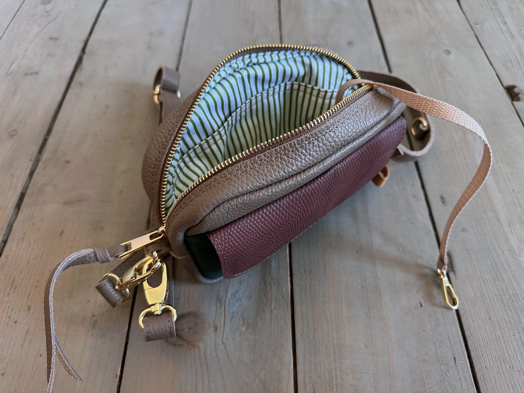 Z tyłu kieszonka na zamek, z przodu kieszonka pod klapką, wewnątrz przegródka + smyczka z karabińczykiem.