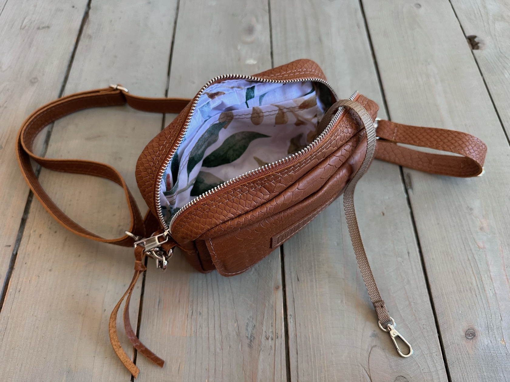 Z tyłu kieszonka na zamek, z przodu kieszonka pod klapką, wewnątrz przegródka + smyczka z karabińczykiem.