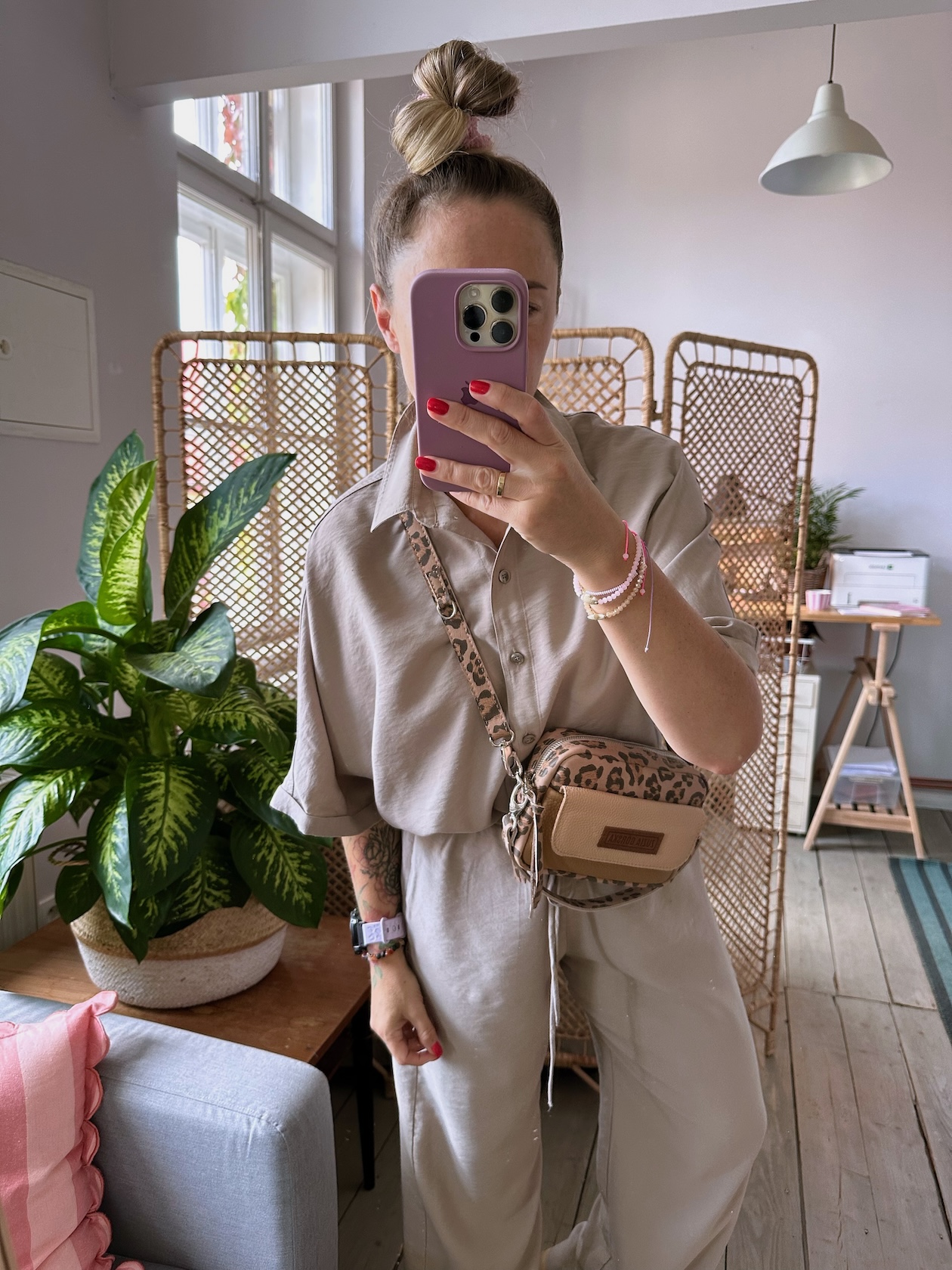 Z tyłu kieszonka na zamek, z przodu kieszonka pod klapką, wewnątrz przegródka + smyczka z karabińczykiem.