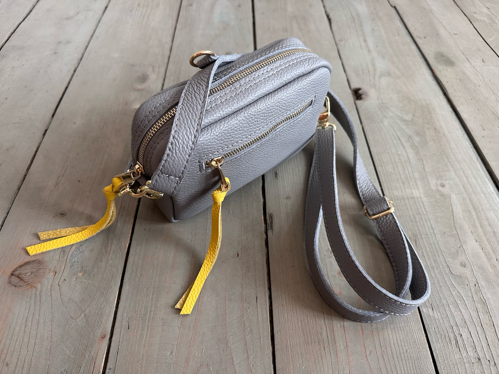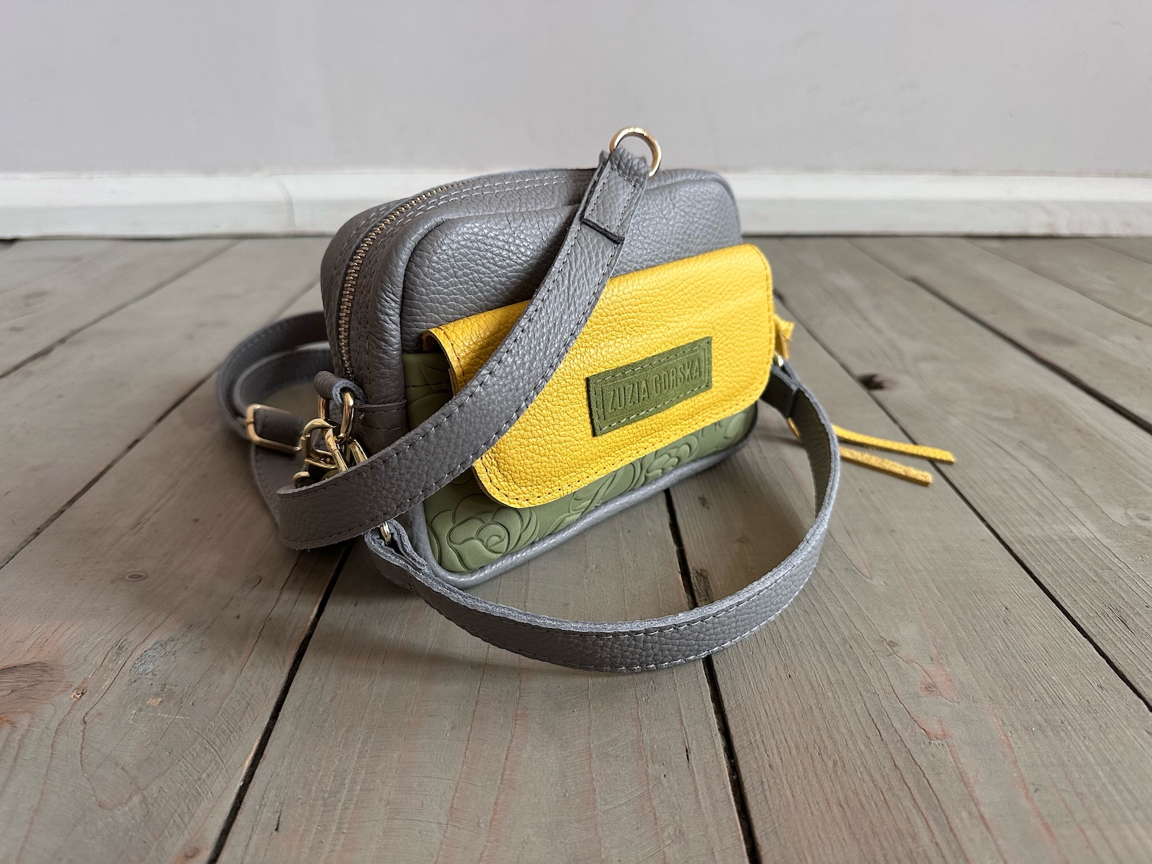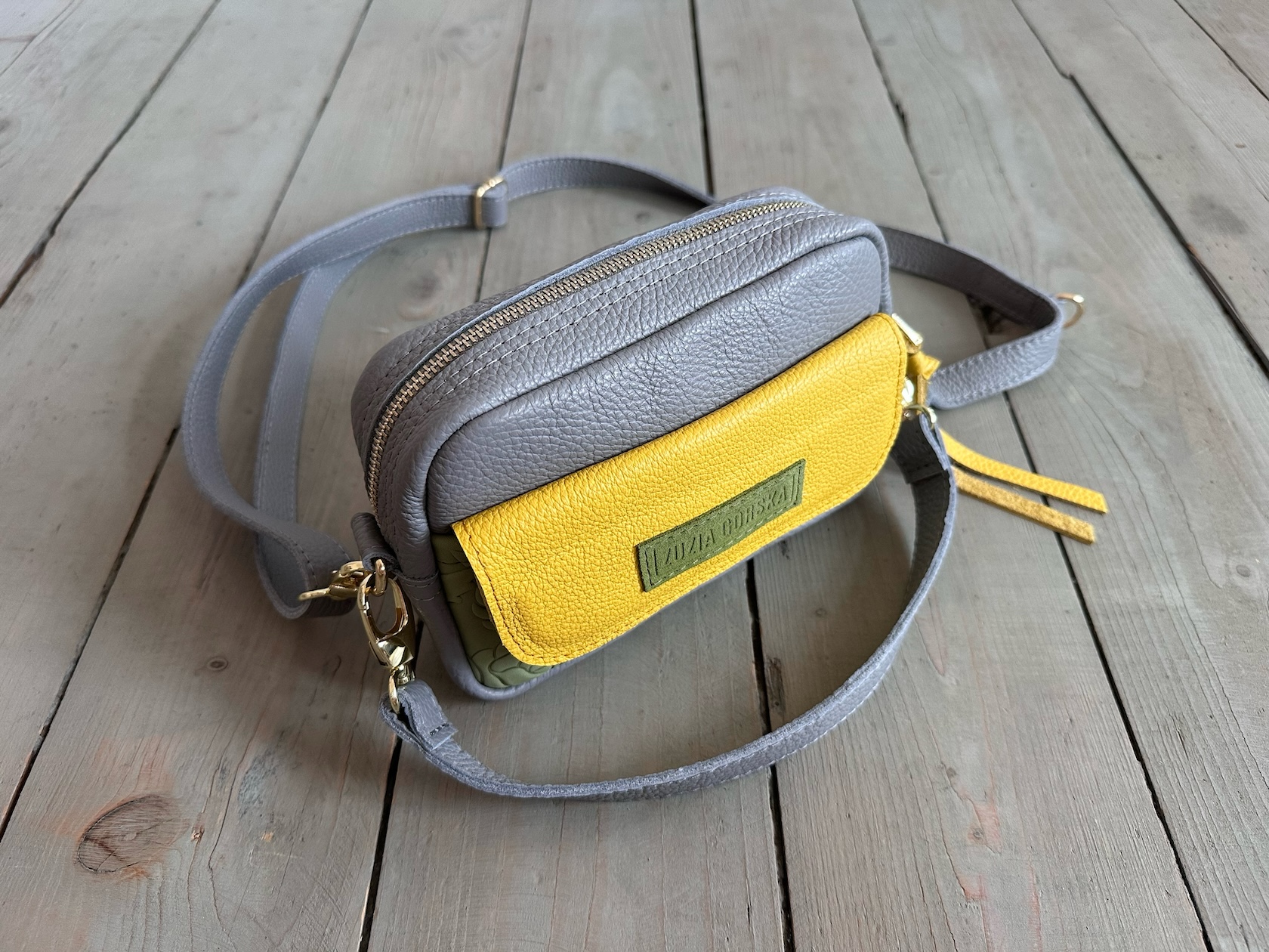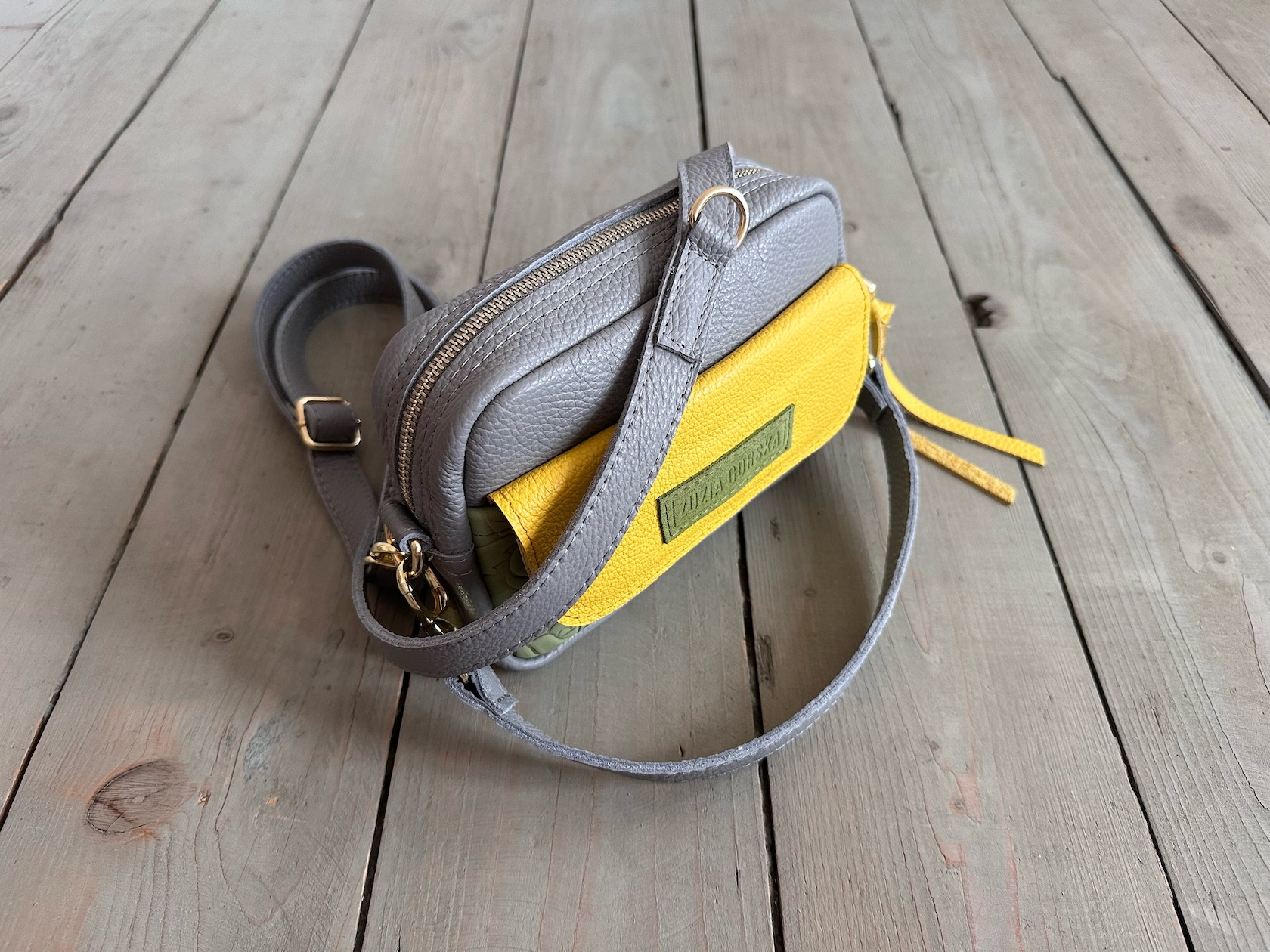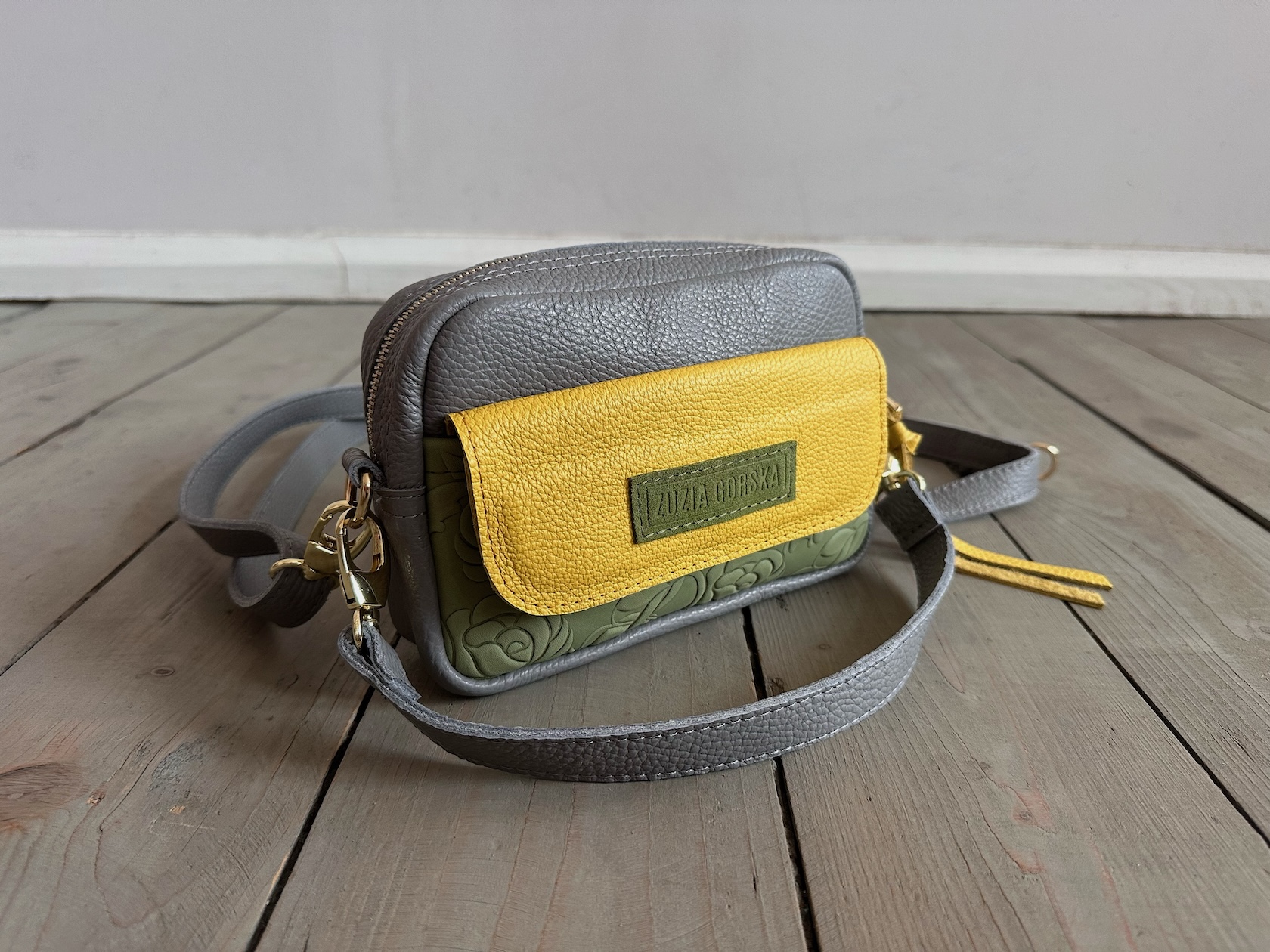 Z tyłu kieszonka na zamek, z przodu kiszona pod klapką, wewnątrz przegródka + smyczka z karabińczykiem.