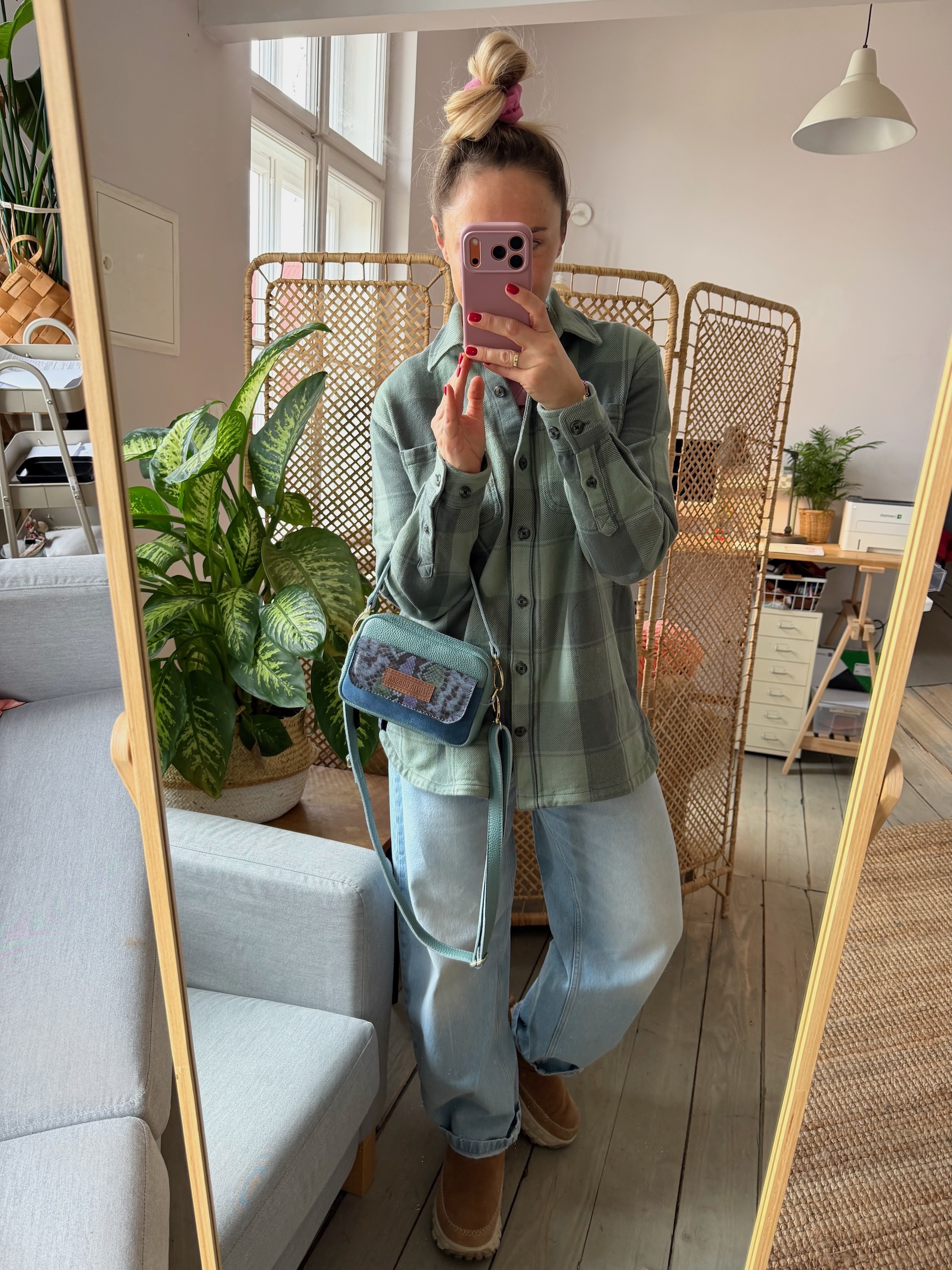 Torebka, która może być noszona przez ramię na skos lub w dłoni.