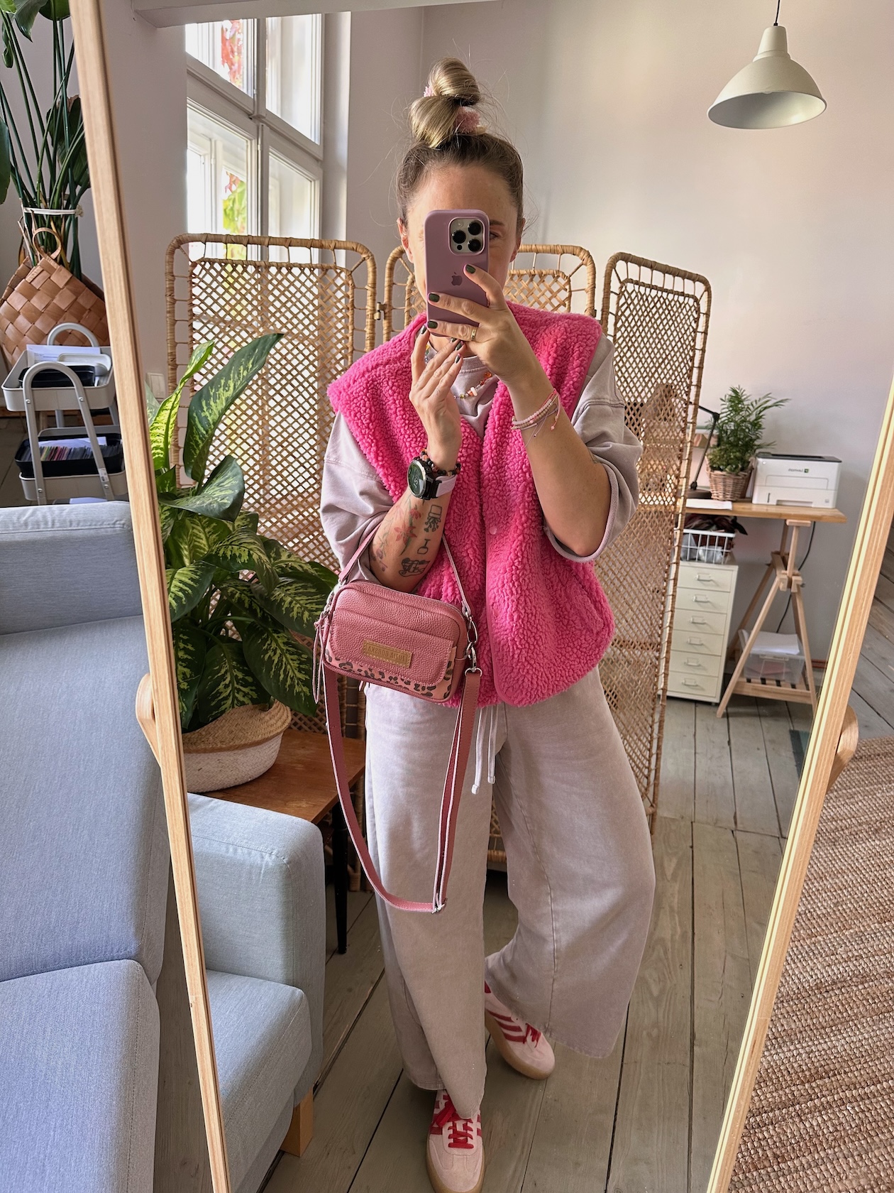 Torebka, która może być noszona przez ramię na skos lub w dłoni.