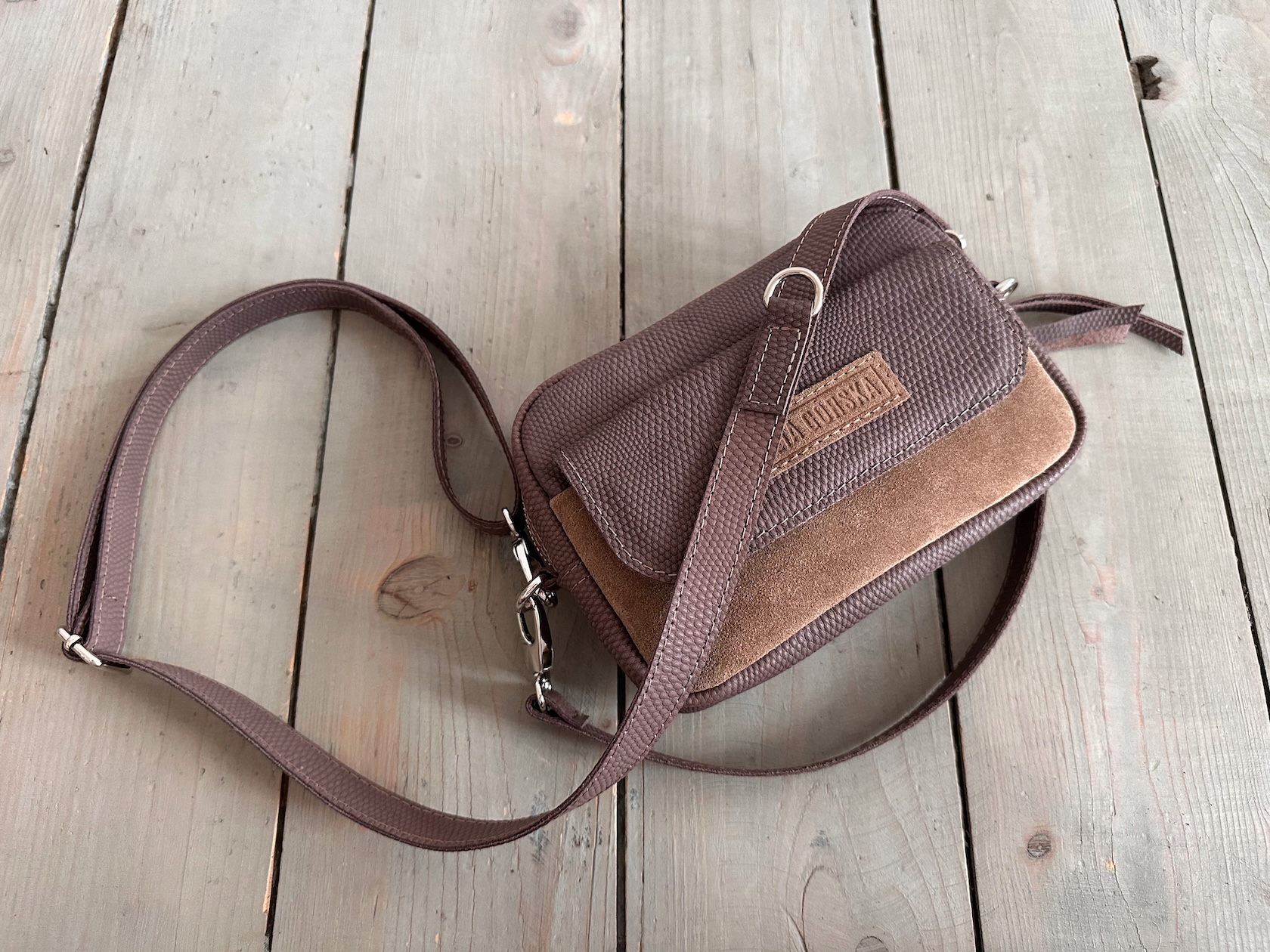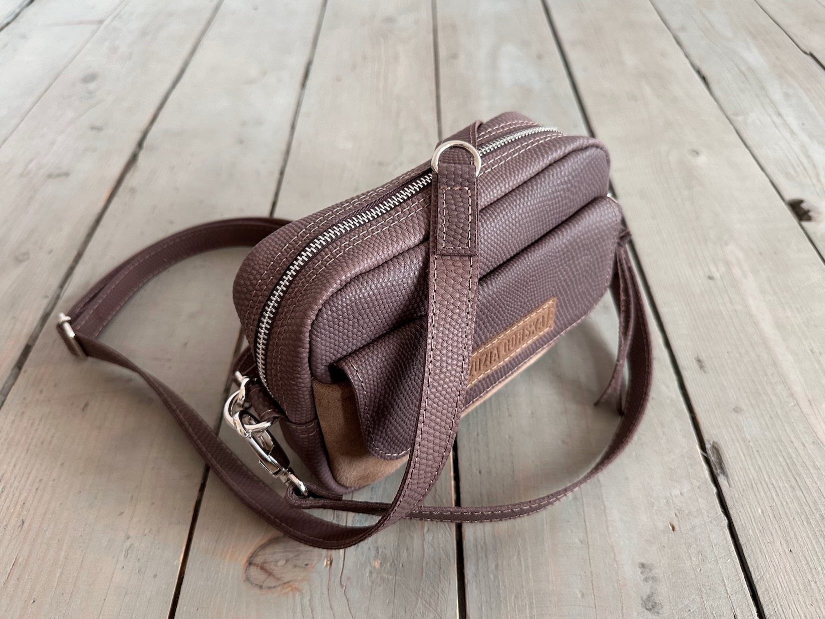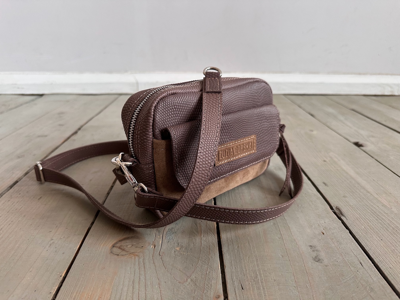 Z tyłu kieszonka na zamek, z przodu kieszonka pod klapką, wewnątrz przegródka + smyczka z karabińczykiem.