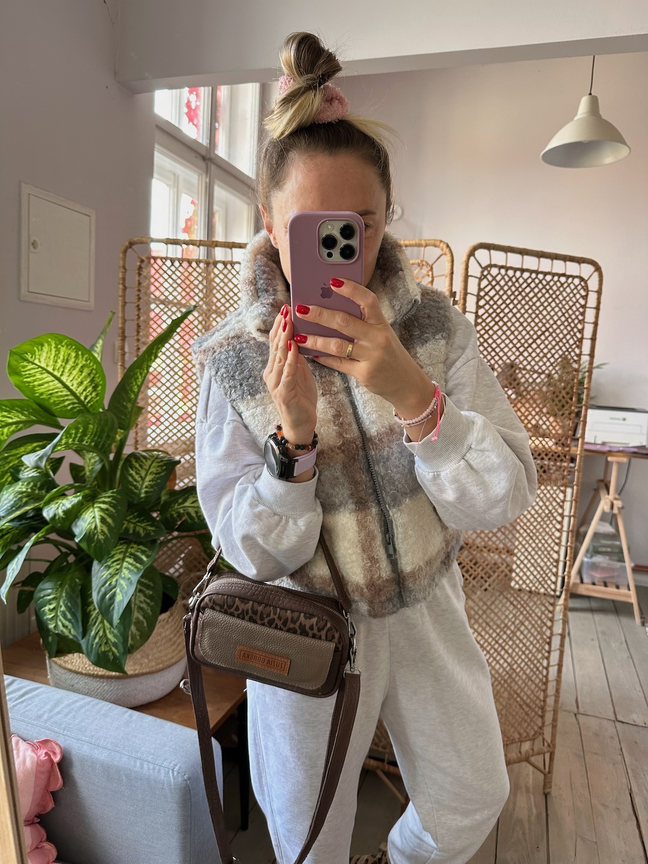 Z tyłu kieszonka na zamek, z przodu kieszonka pod klapką, wewnątrz przegródka + smyczka z karabińczykiem.