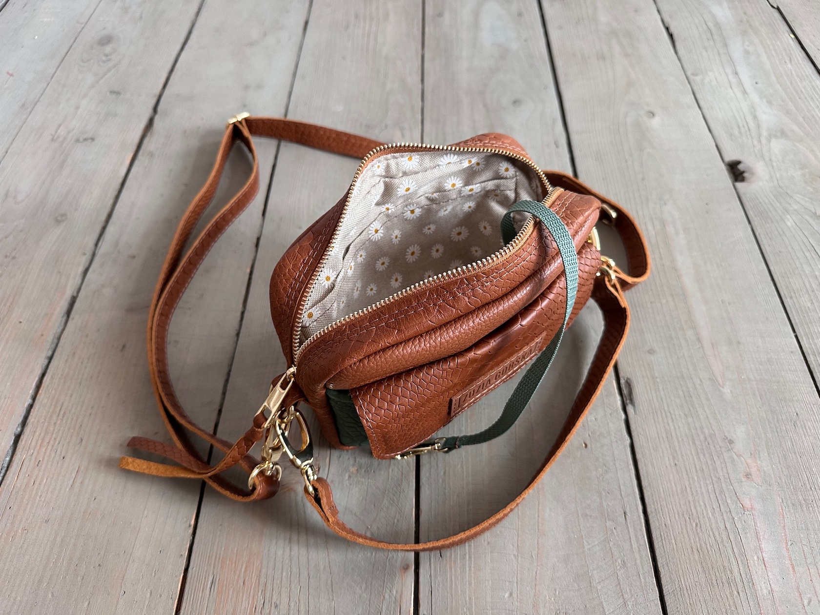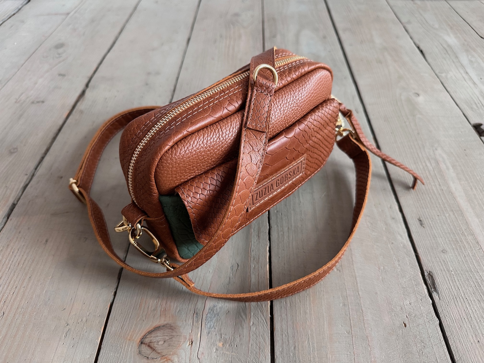Z tyłu kieszonka na zamek, z przodu kiszona pod klapką, wewnątrz przegródka + smyczka z karabińczykiem.