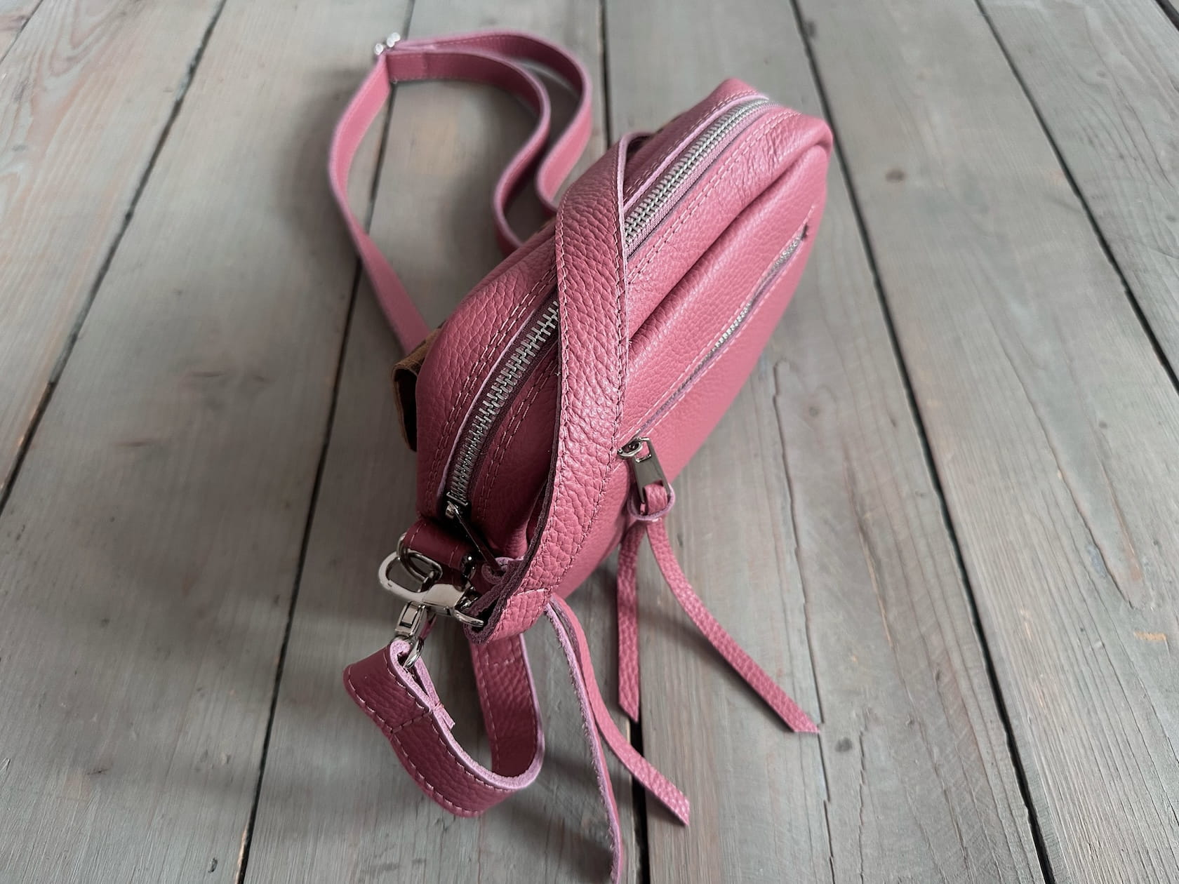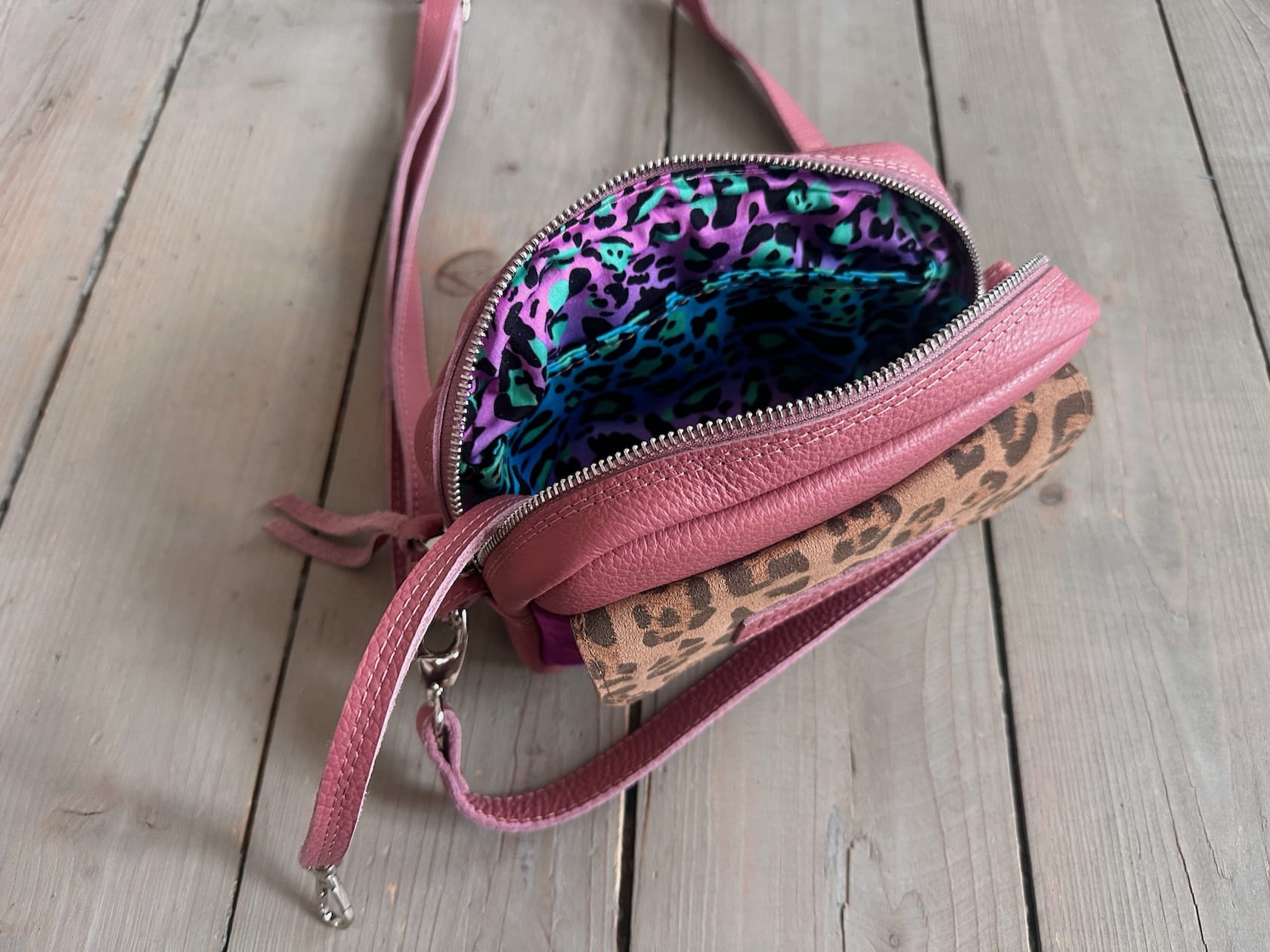 Z tyłu kieszonka na zamek, z przodu kiszona pod klapką, wewnątrz przegródka + smyczka z karabińczykiem.