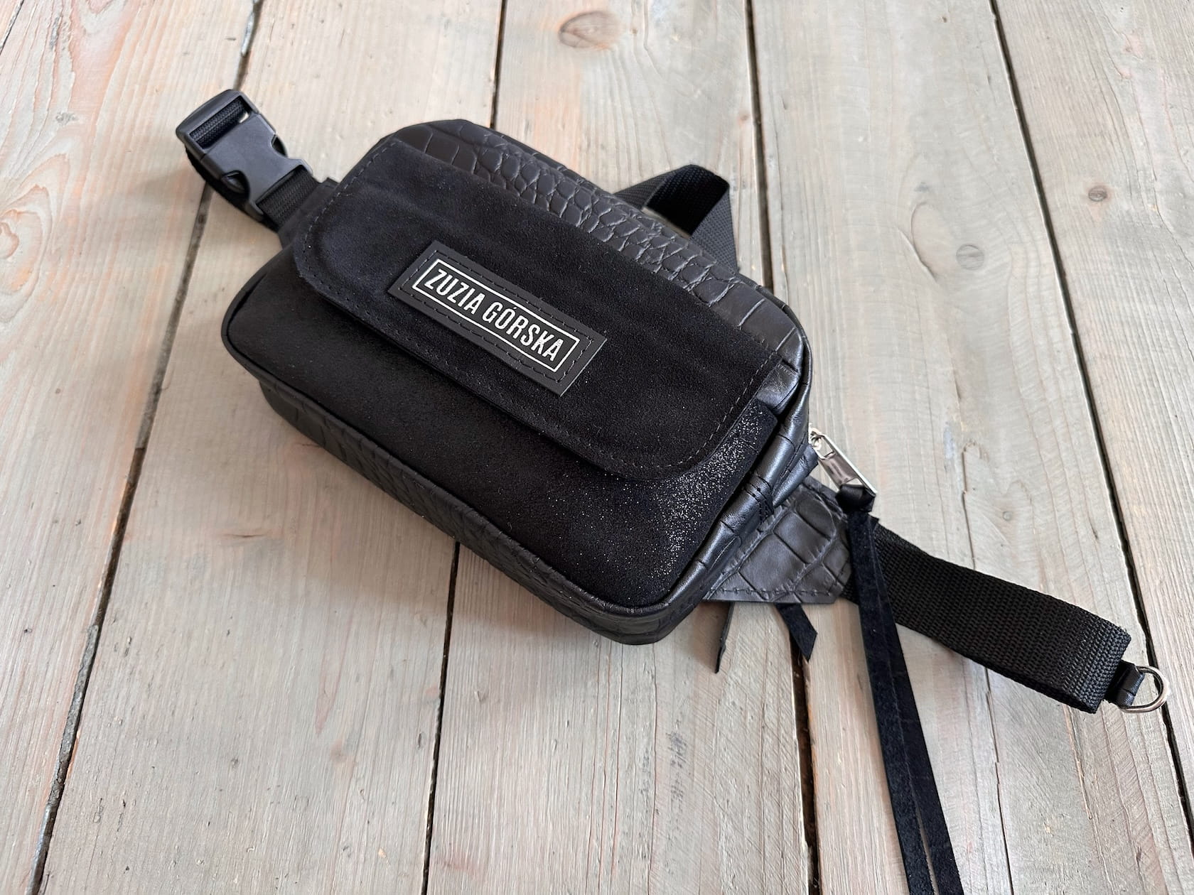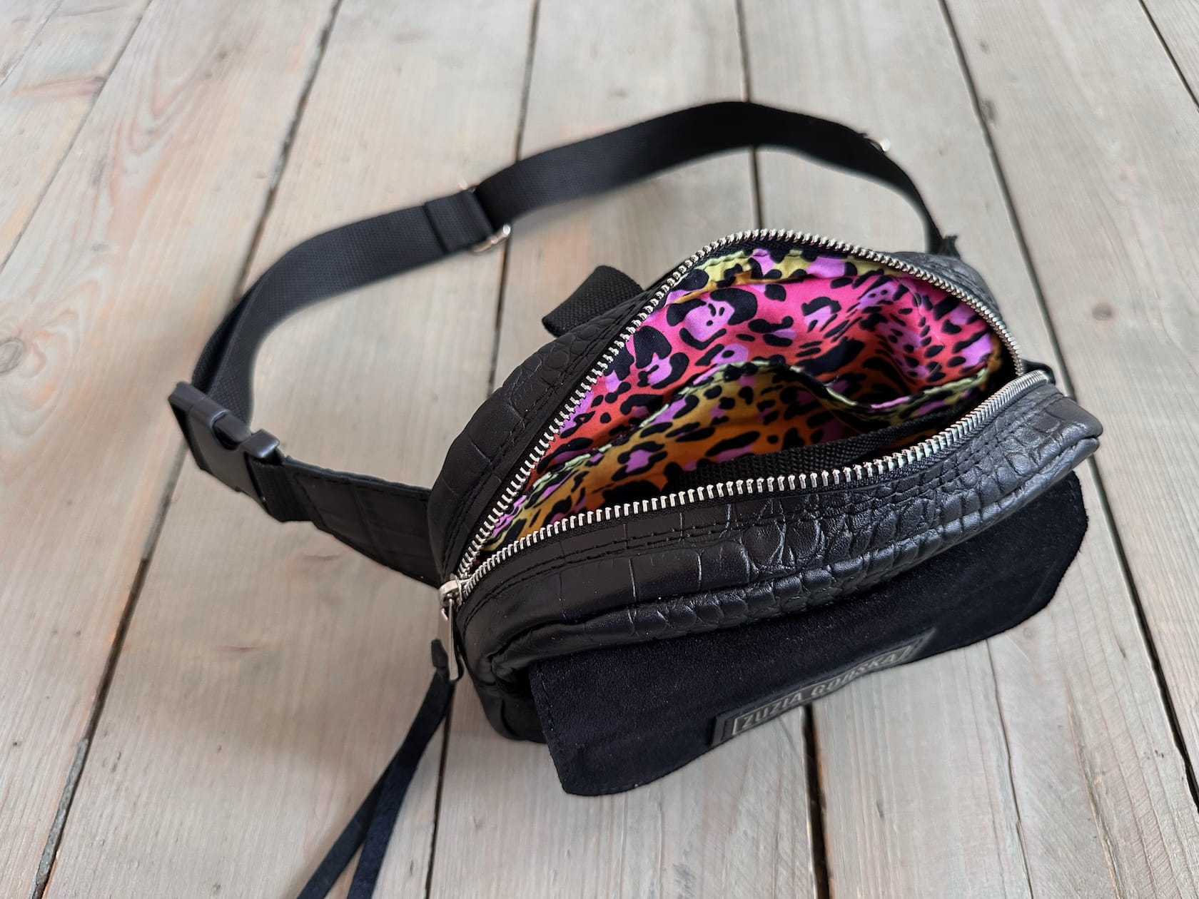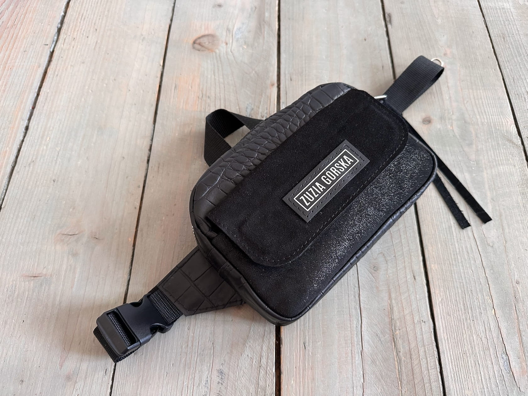 Z tyłu kieszonka na zamek, z przodu kiszona pod klapką, wewnątrz przegródka + smyczka z karabińczykiem.