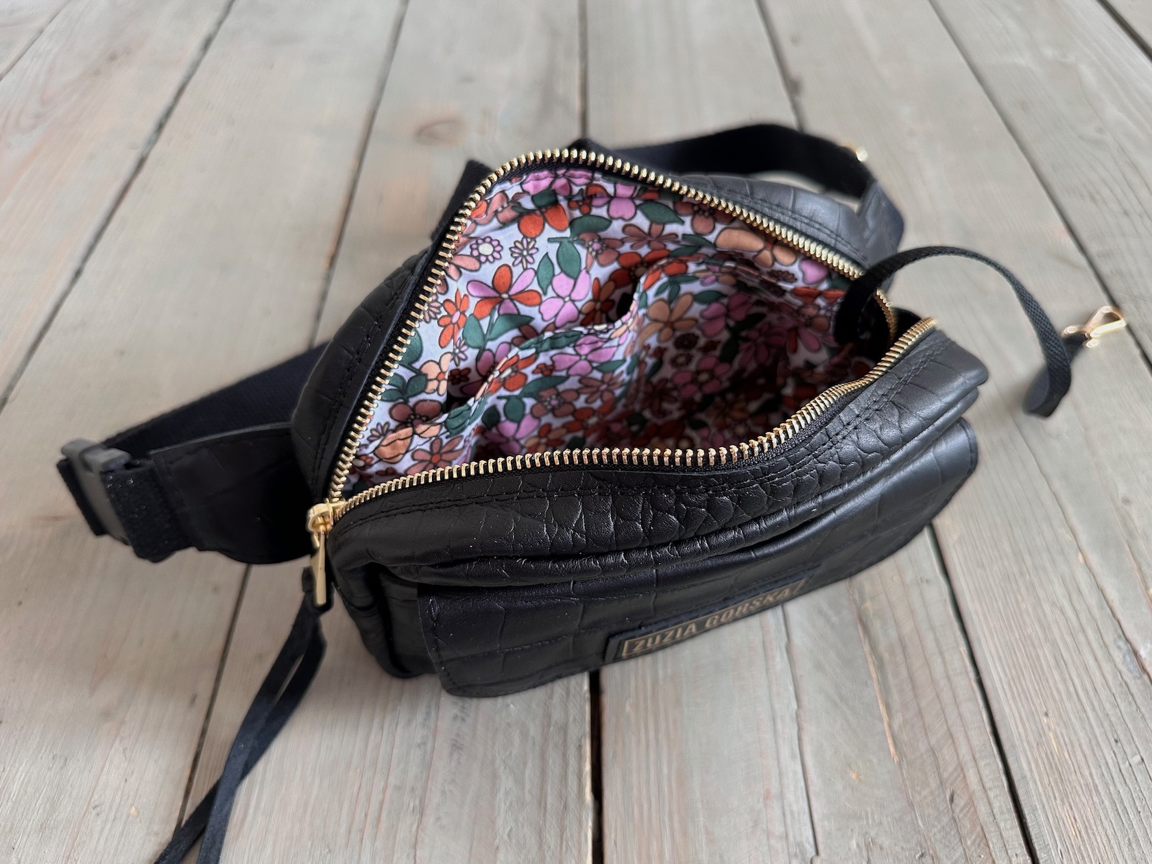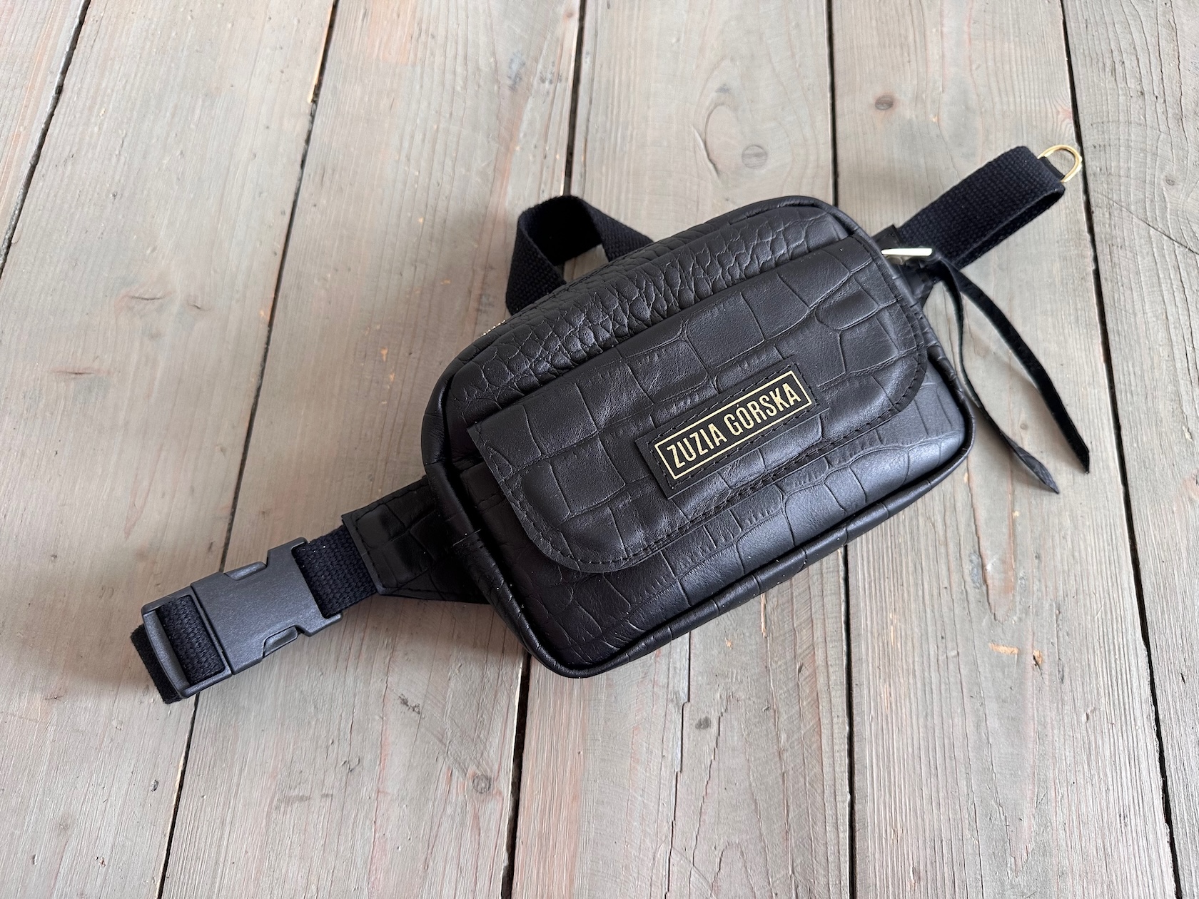 Z tyłu kieszonka na zamek, z przodu kieszonka pod klapką, wewnątrz przegródka + smyczka z karabińczykiem.