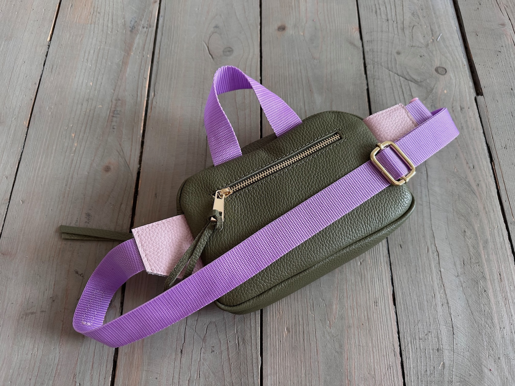 Z tyłu kieszonka na zamek, z przodu kieszonka pod klapką, wewnątrz przegródka + smyczka z karabińczykiem.