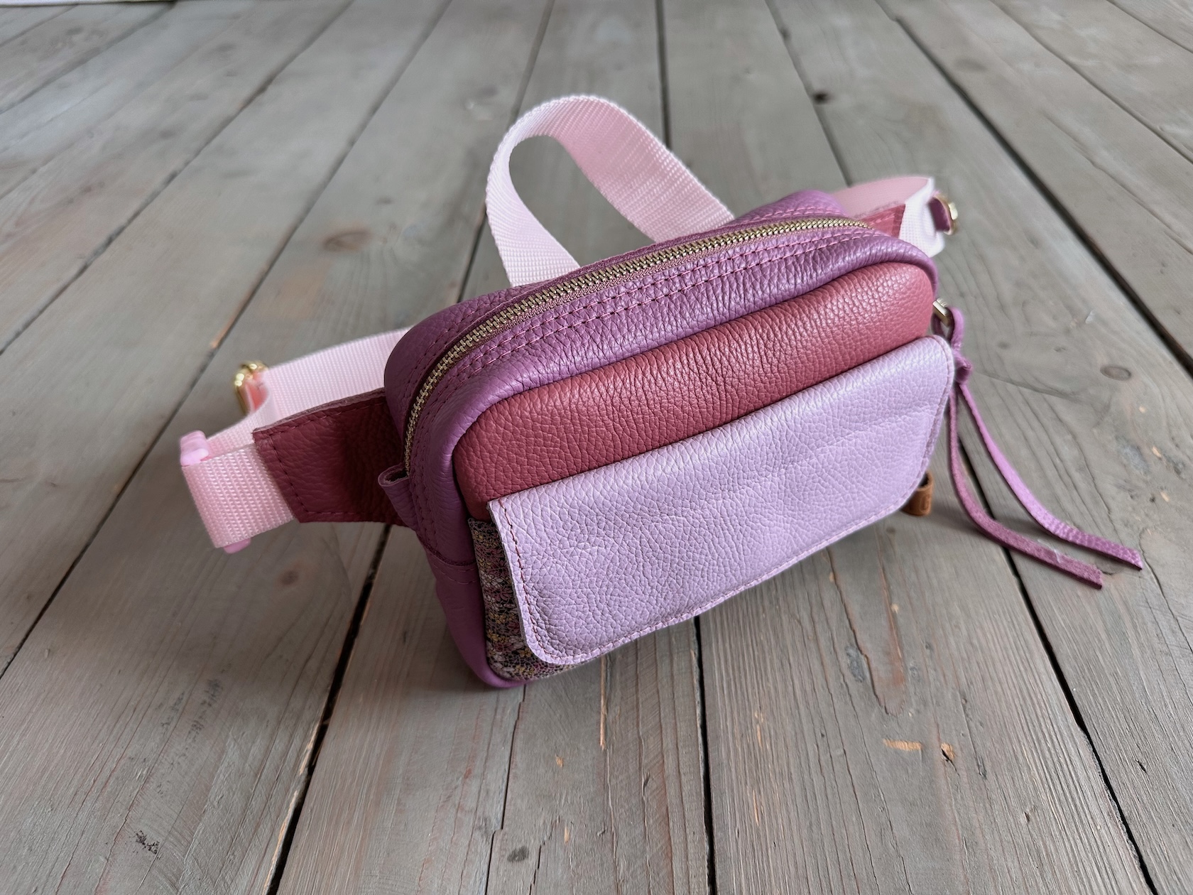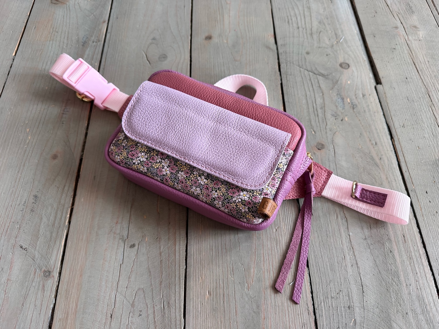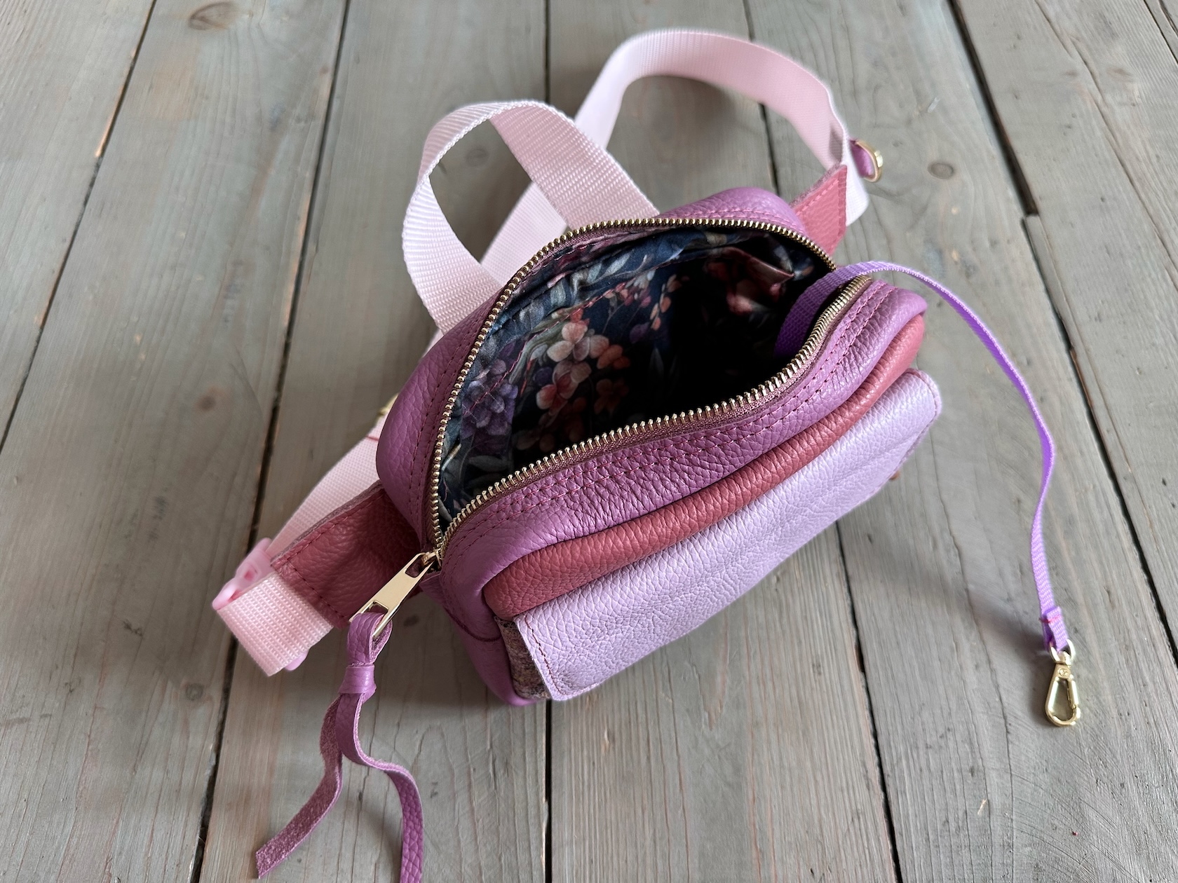 Z tyłu kieszonka na zamek, z przodu kiszona pod klapką, wewnątrz przegródka + smyczka z karabińczykiem.