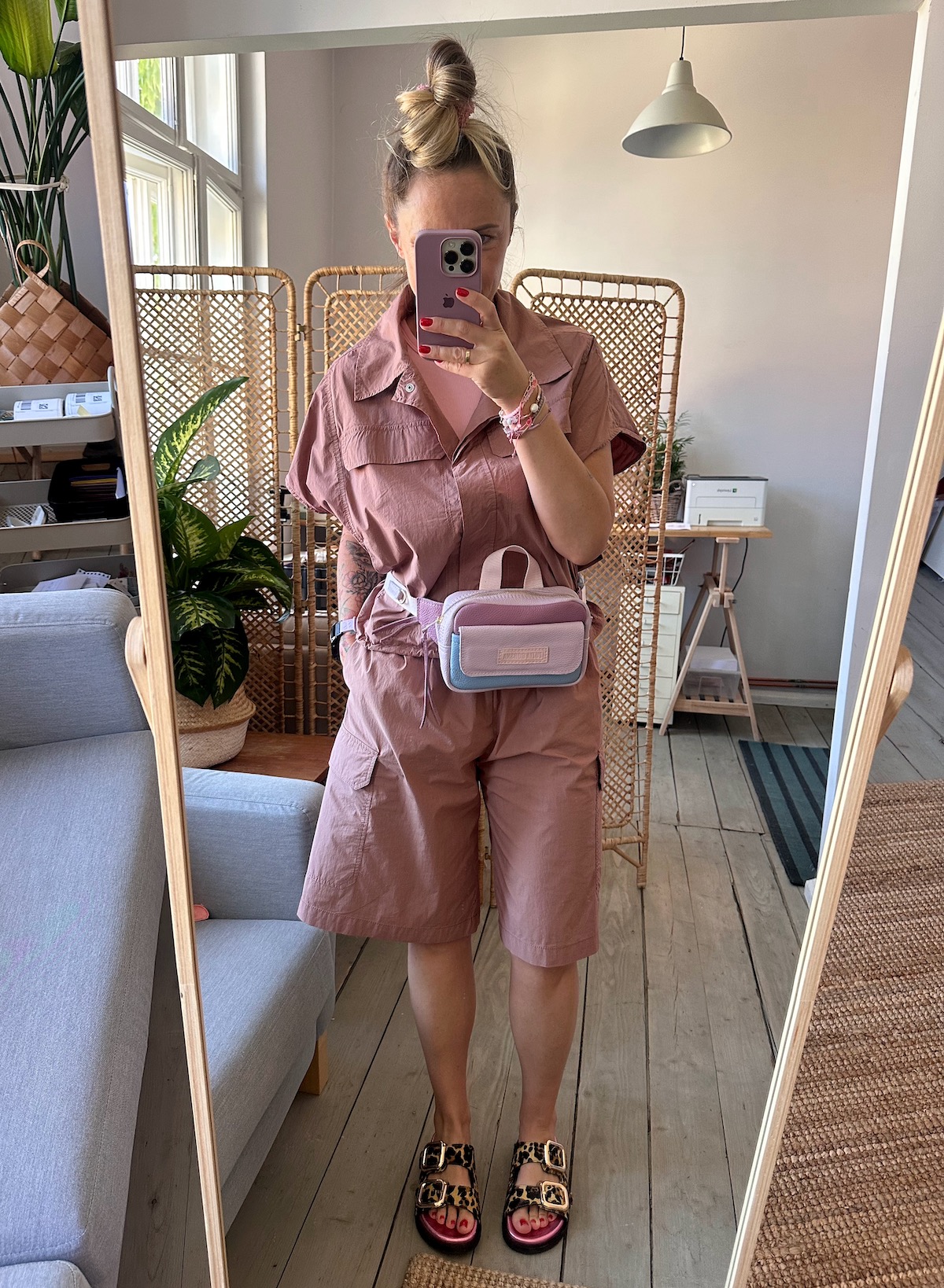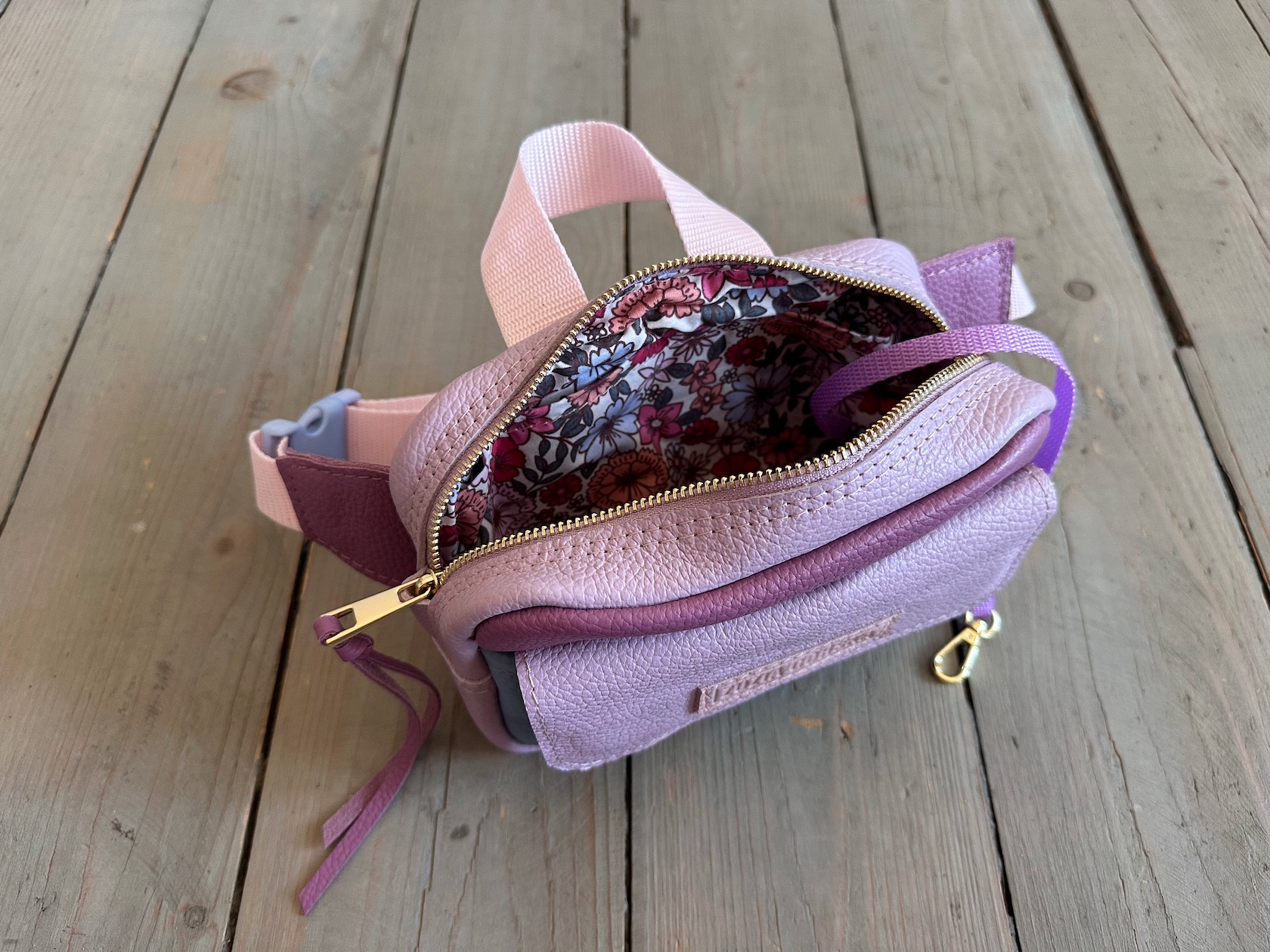 Z tyłu kieszonka na zamek, z przodu kieszonka pod klapką, wewnątrz przegródka + smyczka z karabińczykiem.